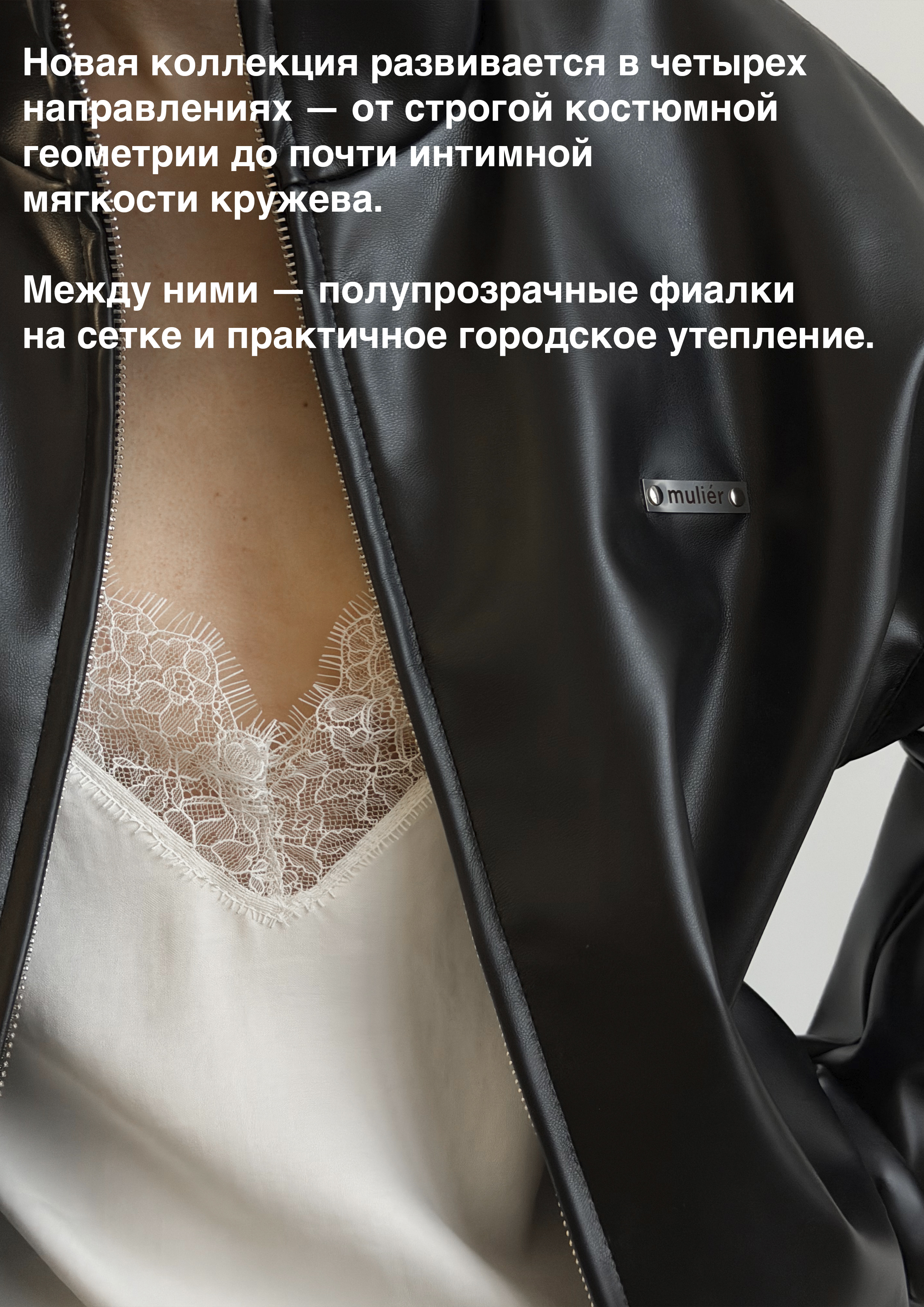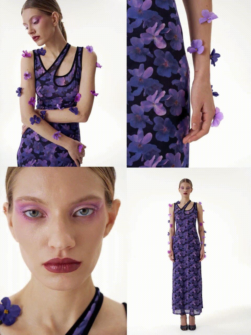 Вторая линия — самая эмоциональная и построена вокруг цветков фиалок. Глубокий фиолетовый фон и лиловые цветы создают ощущение живого полотна — рисунок на изделиях словно движется вместе с телом.