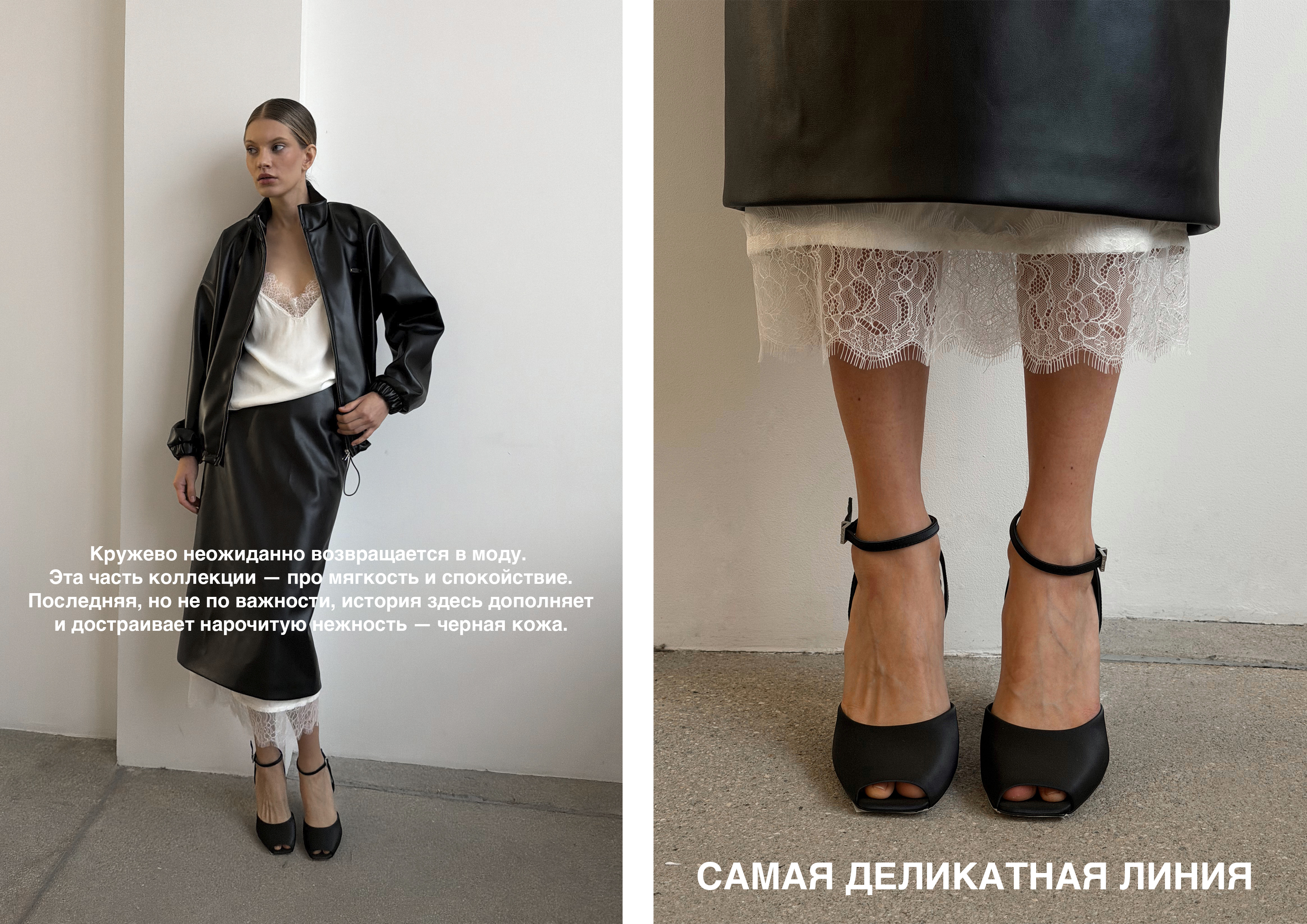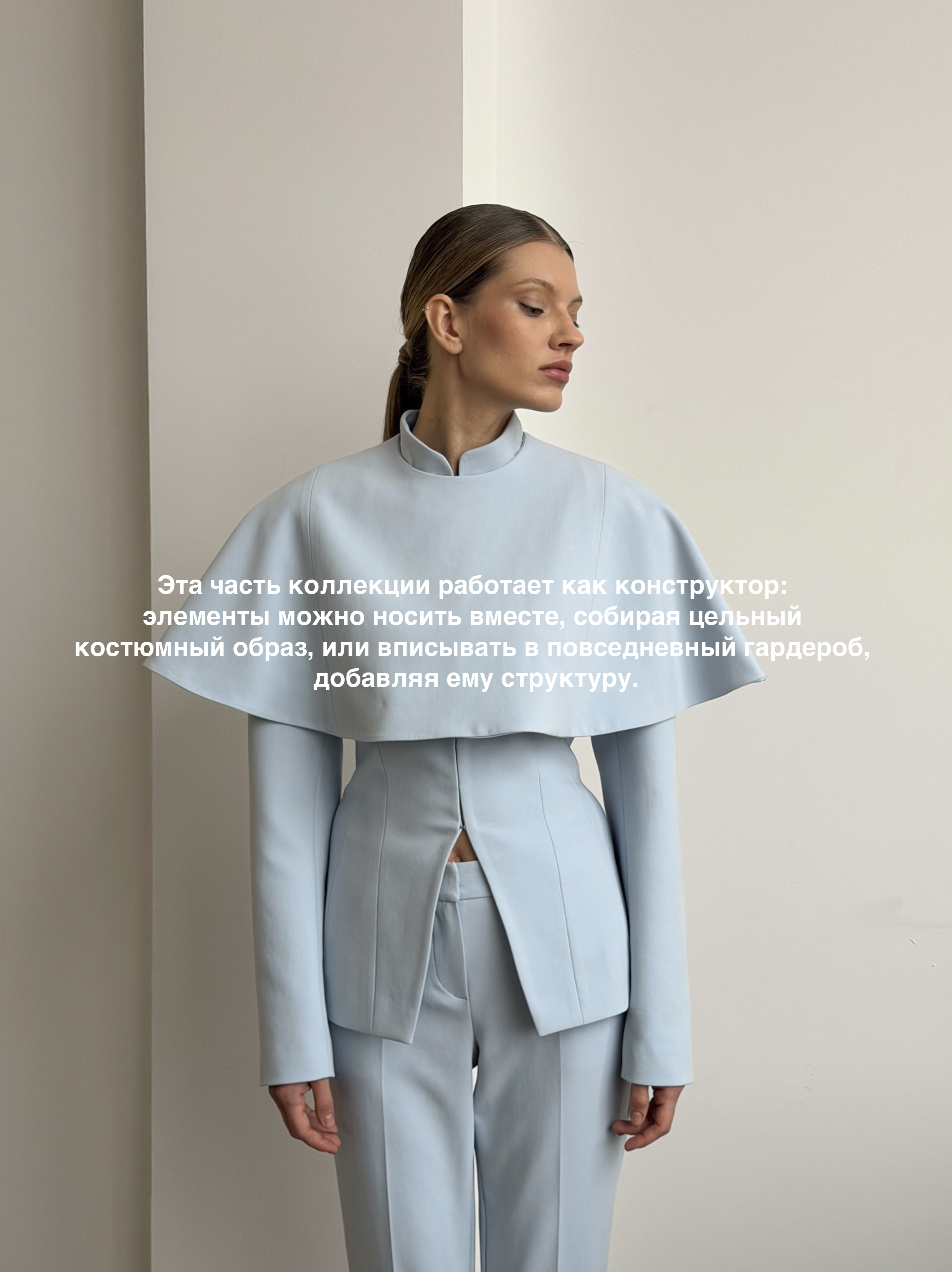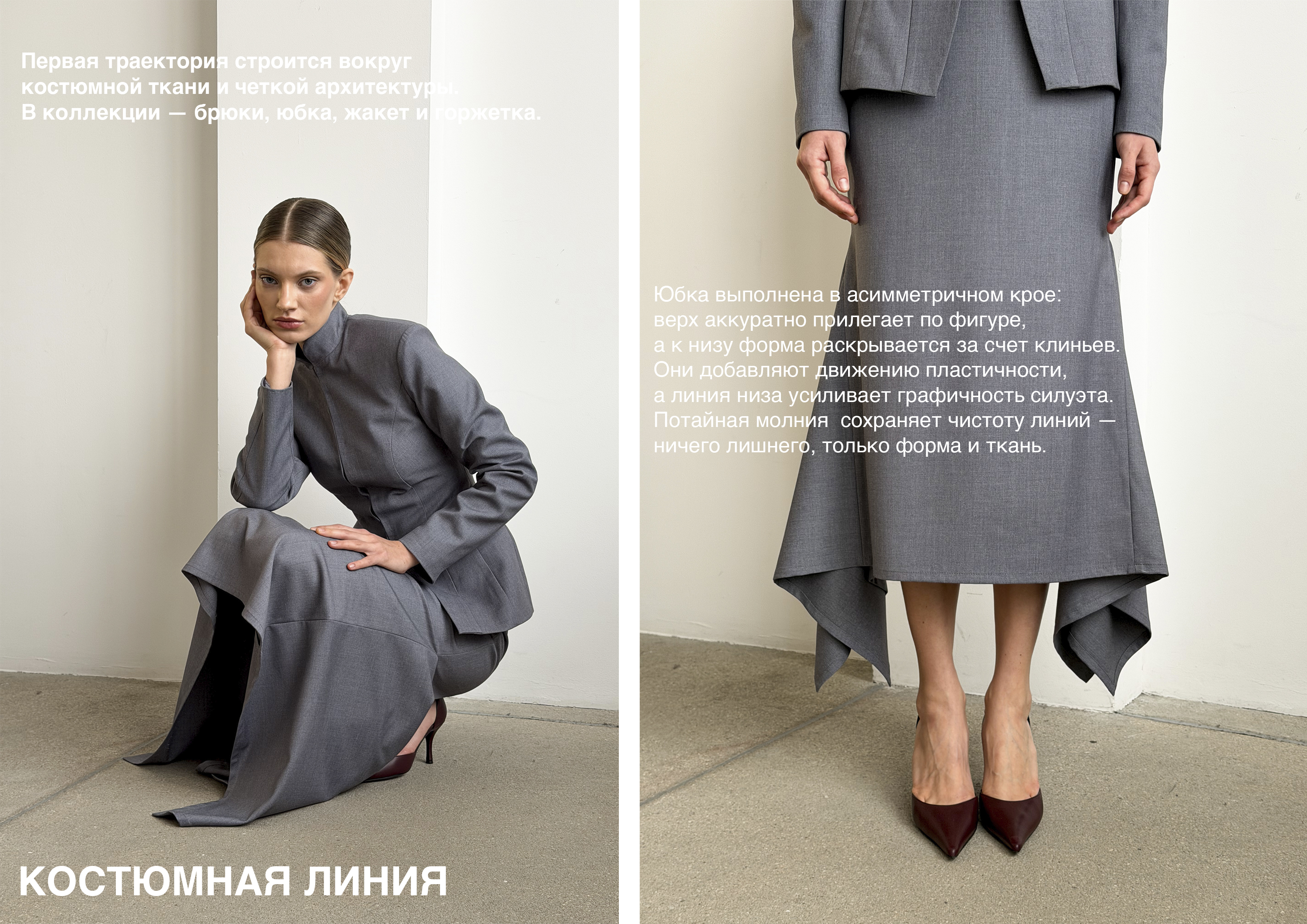 Асимметричное платье Violet раскрывает идею лучше всего: линия верха смещена, плечи открываются по-разному, а принт становится главным акцентом. Леггинсы и брюки клёш продолжают эту динамику — они плотно сидят по фигуре и мягко расширяются к низу, визуально вытягивая силуэт.