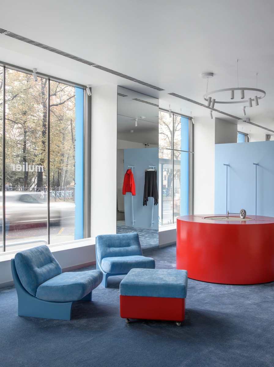 Мебель — винтажная, обновленная вручную: в интерьере стоит знаменитое «кресло Цоя», найденное на «Авито» и перетянутое под цвета muliér. Почти все технологичные элементы — от рейлов до четырехметровой кассы в форме буквы «М» со встроенным баром — сделаны на заказ.