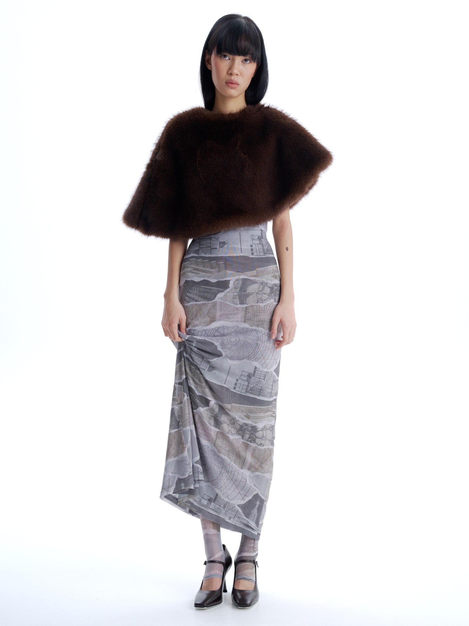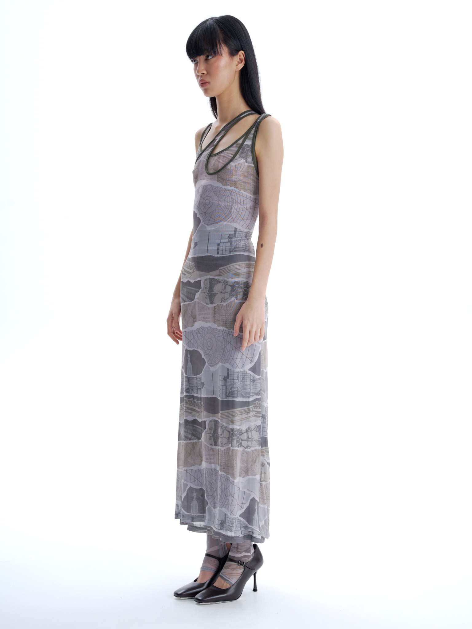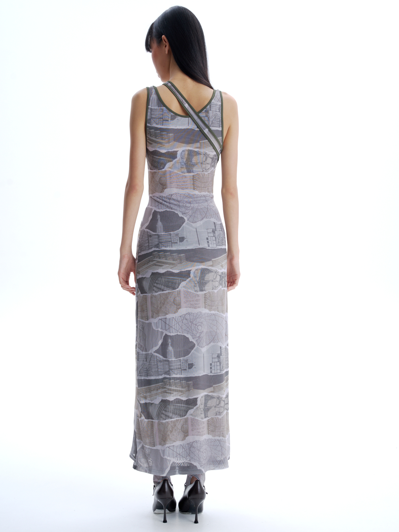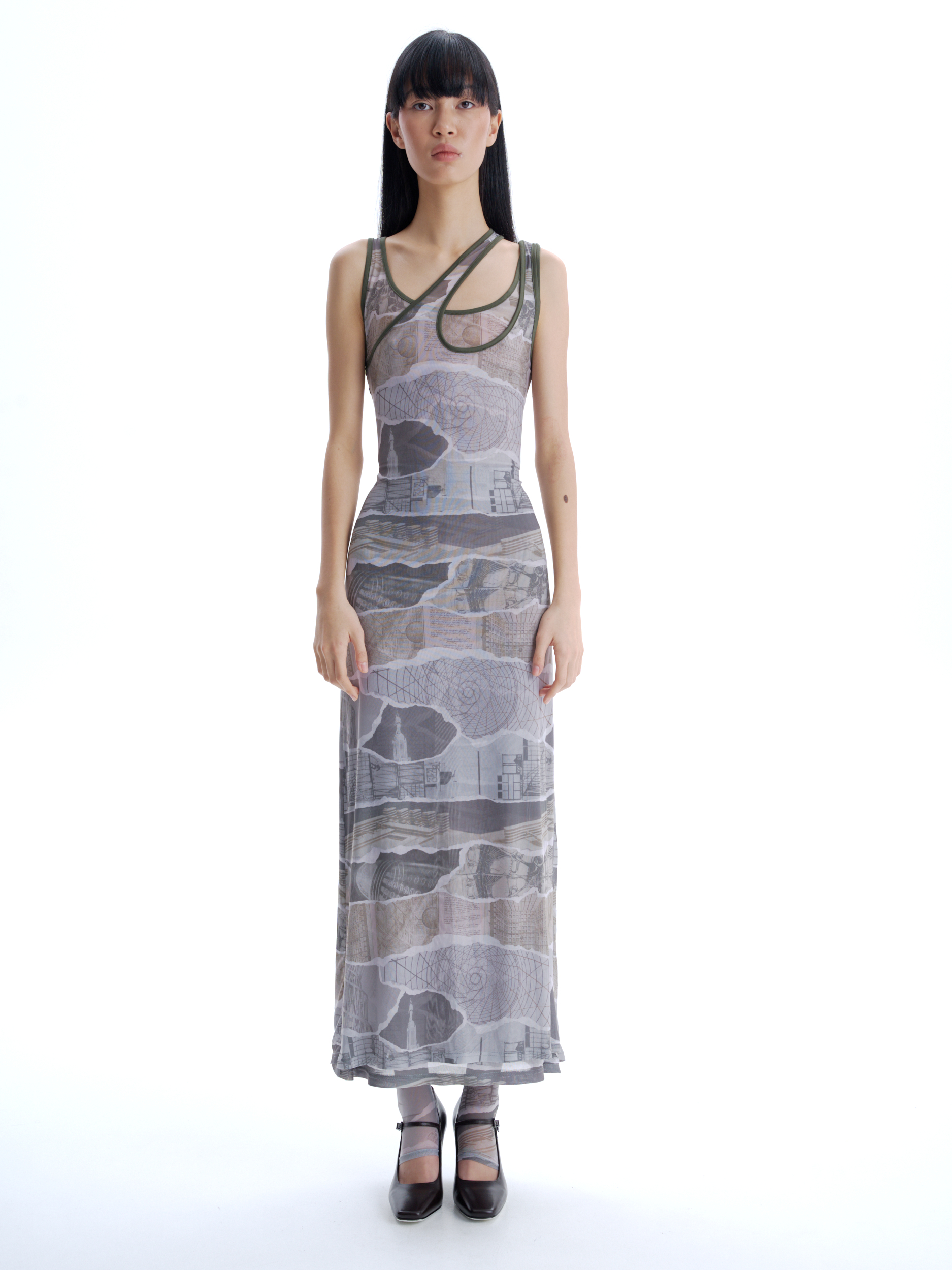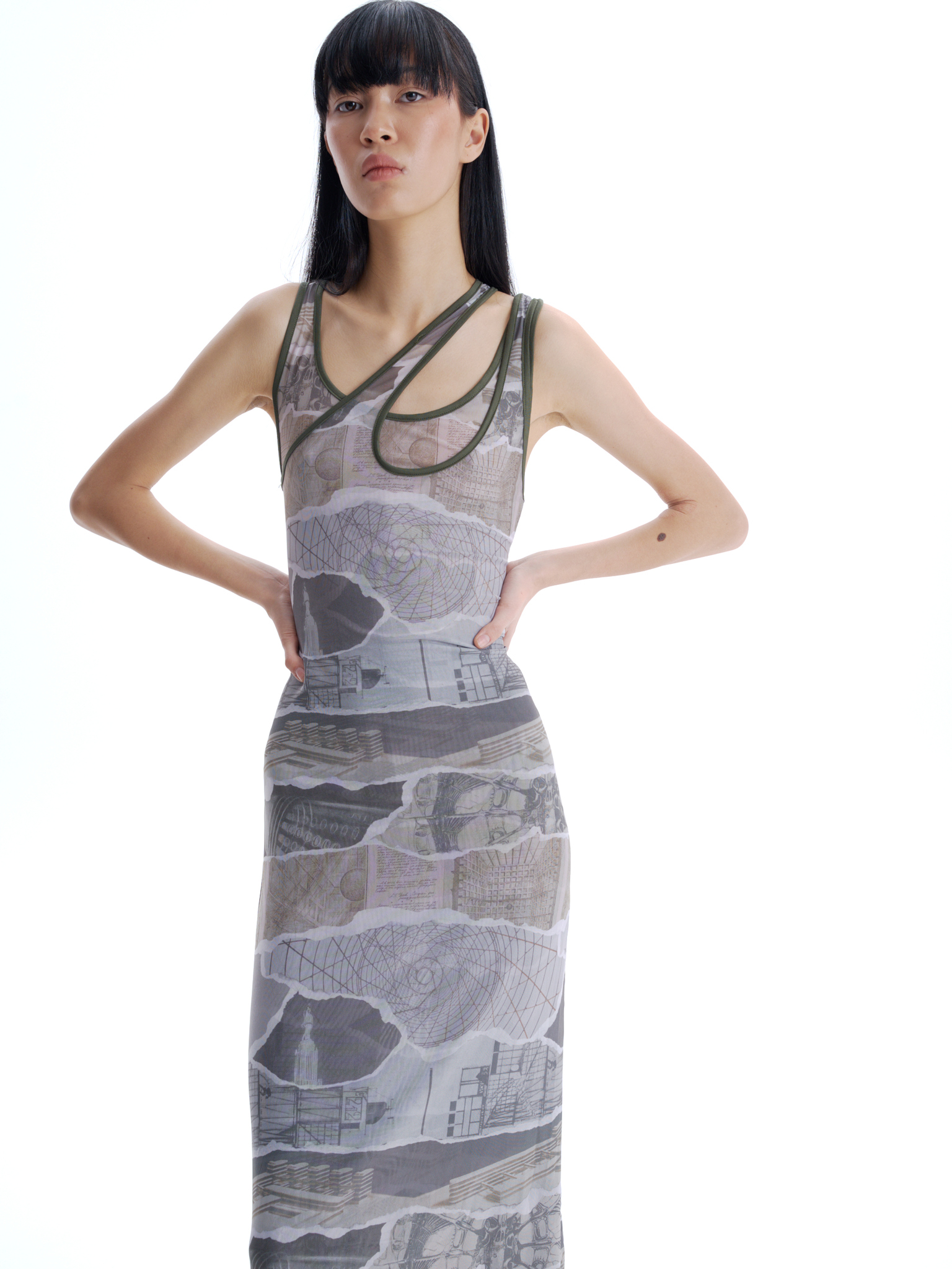 Асимметричное платье выполнено из эластичной и тянущейся сетки в два слоя с авторским принтом. Посадка по фигуре, акцентные лямки с кантиком, платье можно носить как самостоятельный элемент, так и поверх леггинс, создавая сложные многослойные образы.