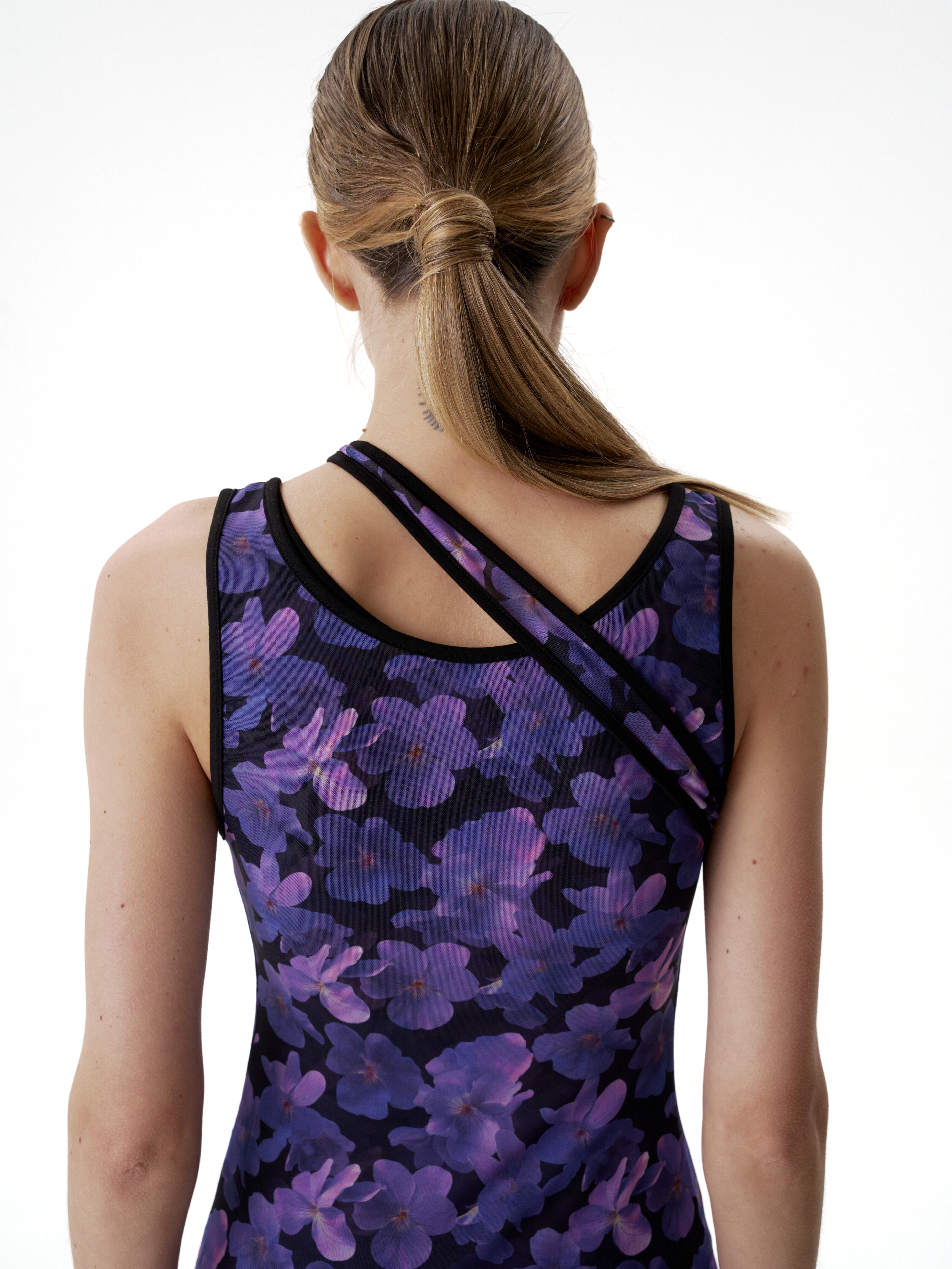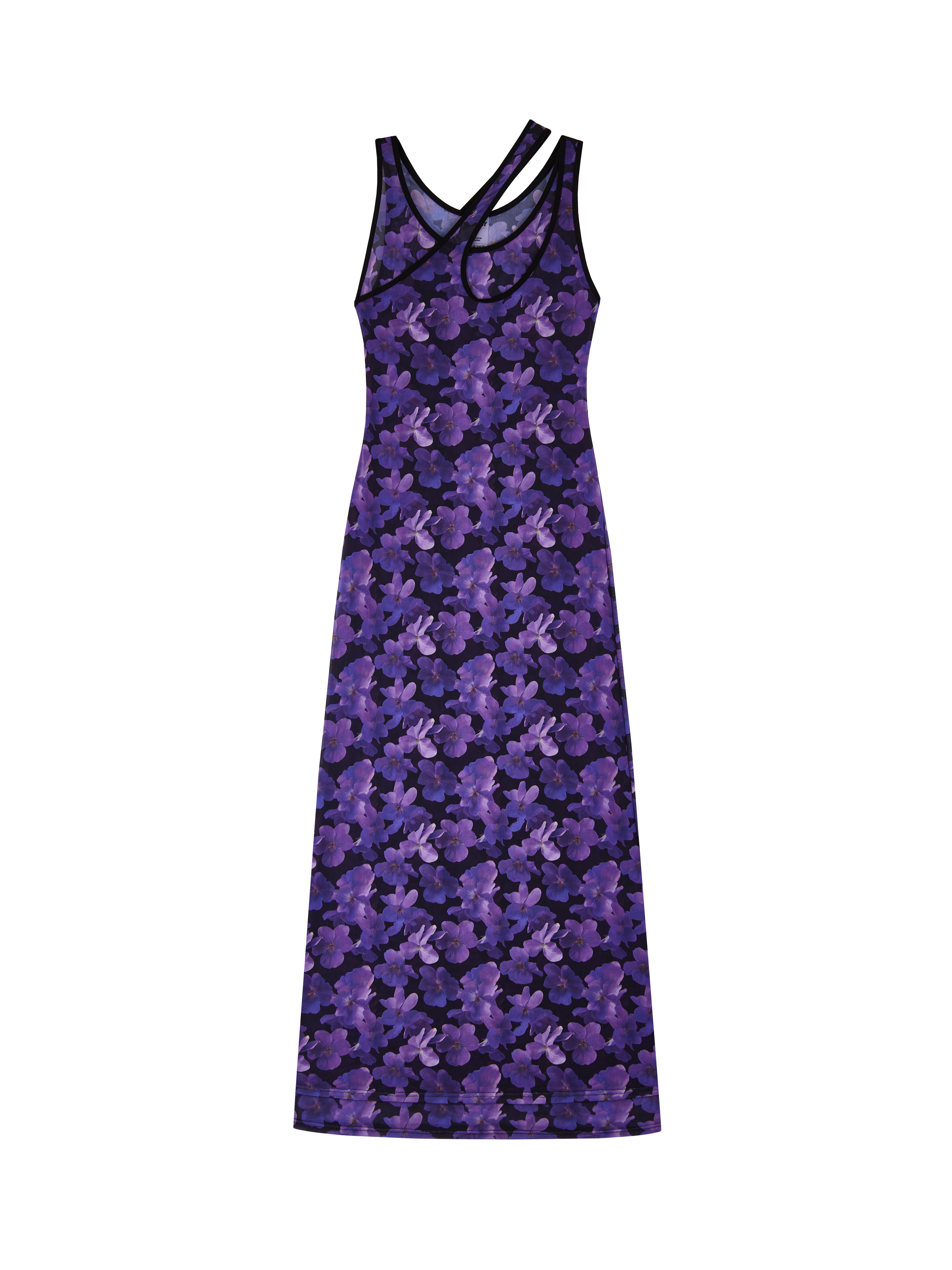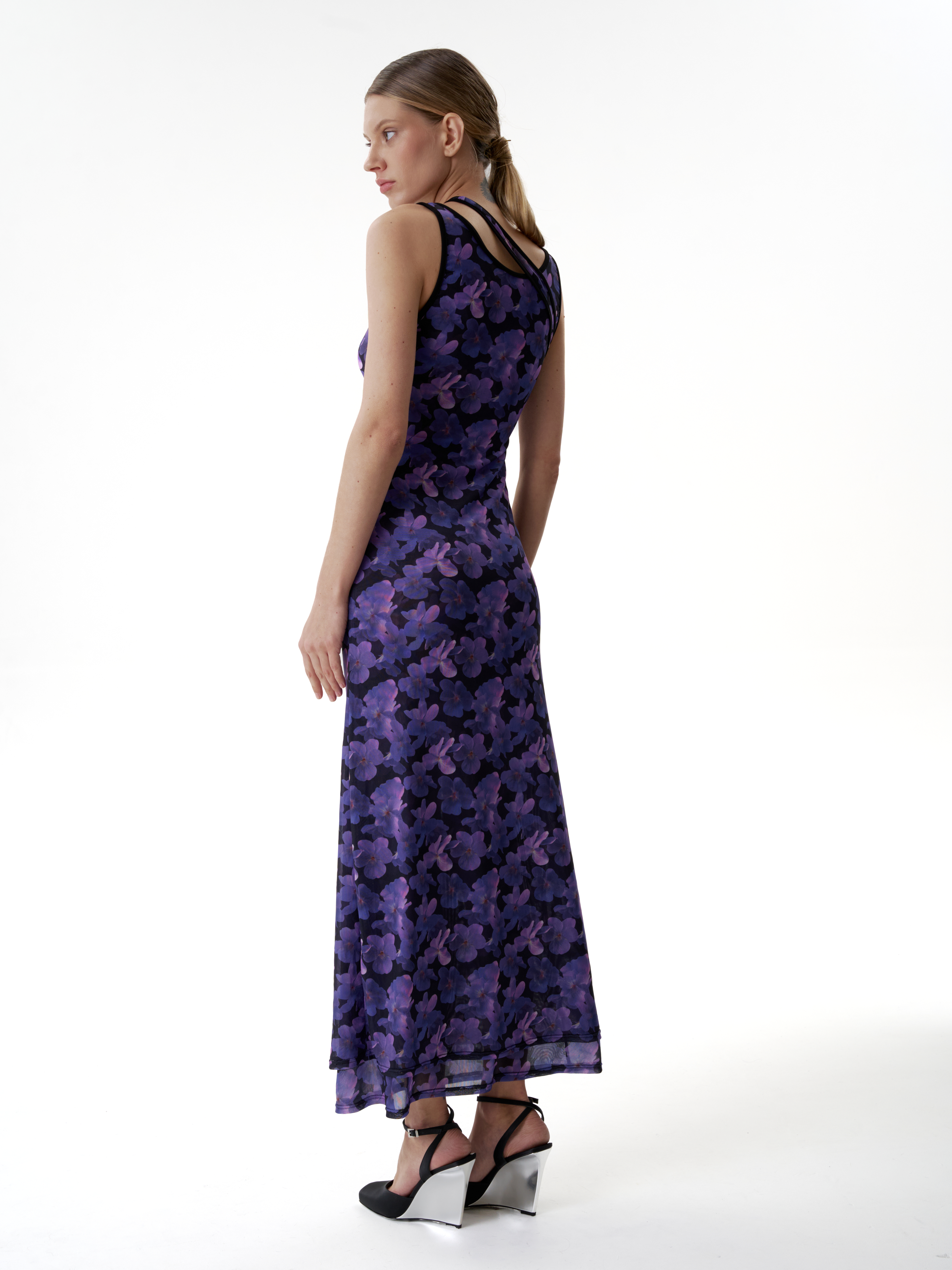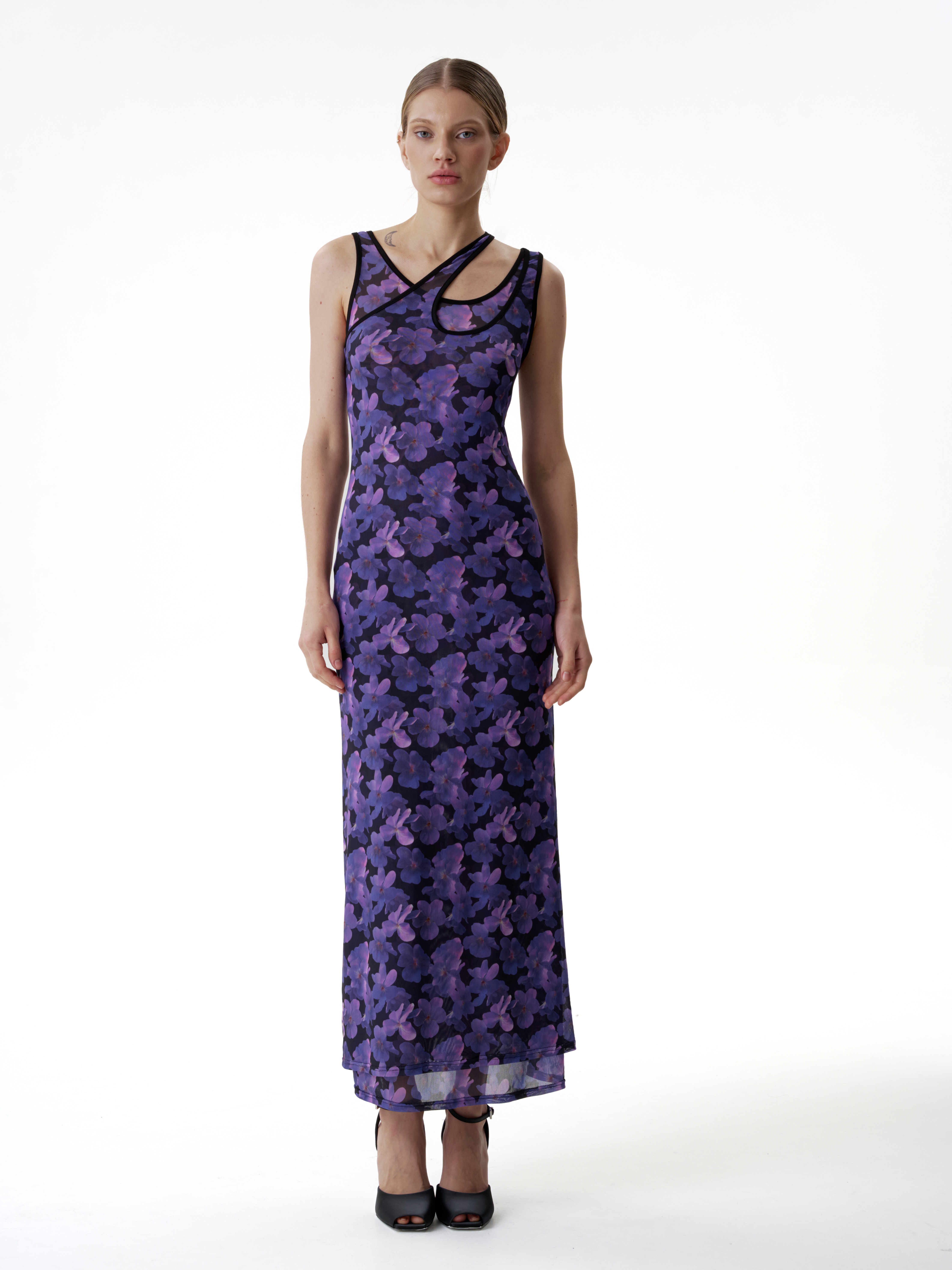 Асимметричное платье выполнено из мягкой эластичной сетки с авторским принтом фиалок. Глубокий фиолетовый фон и лиловые цветы создают эффект живого полотна — рисунок раскрывается в движении, усиливая выразительность силуэта.