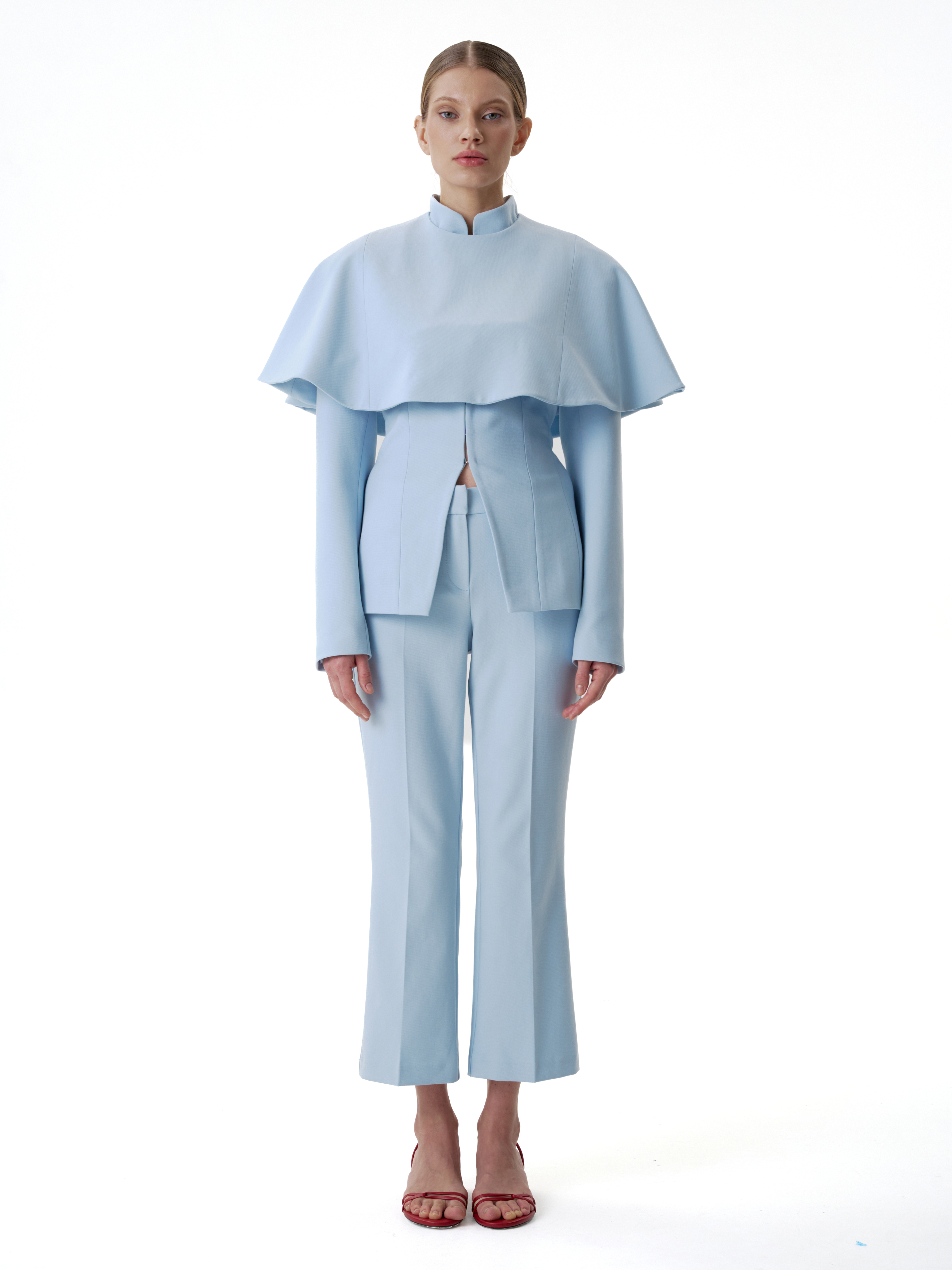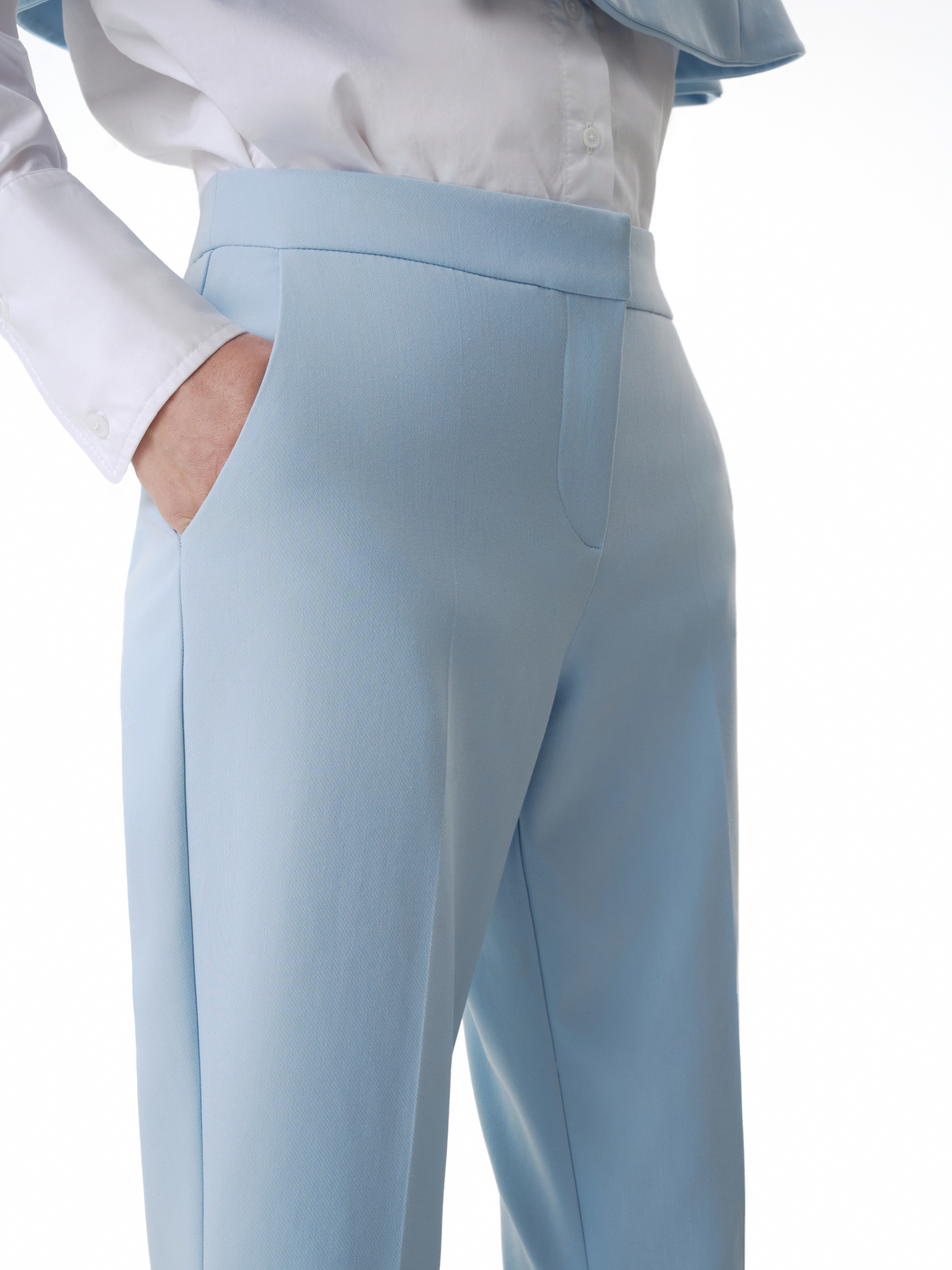 Укороченные брюки из костюмной ткани выполнены в силуэте «дудочки» со средней посадкой. Модель аккуратно выстраивает линию ноги, а графичные стрелки добавляют четкости и подчеркивают вертикаль.