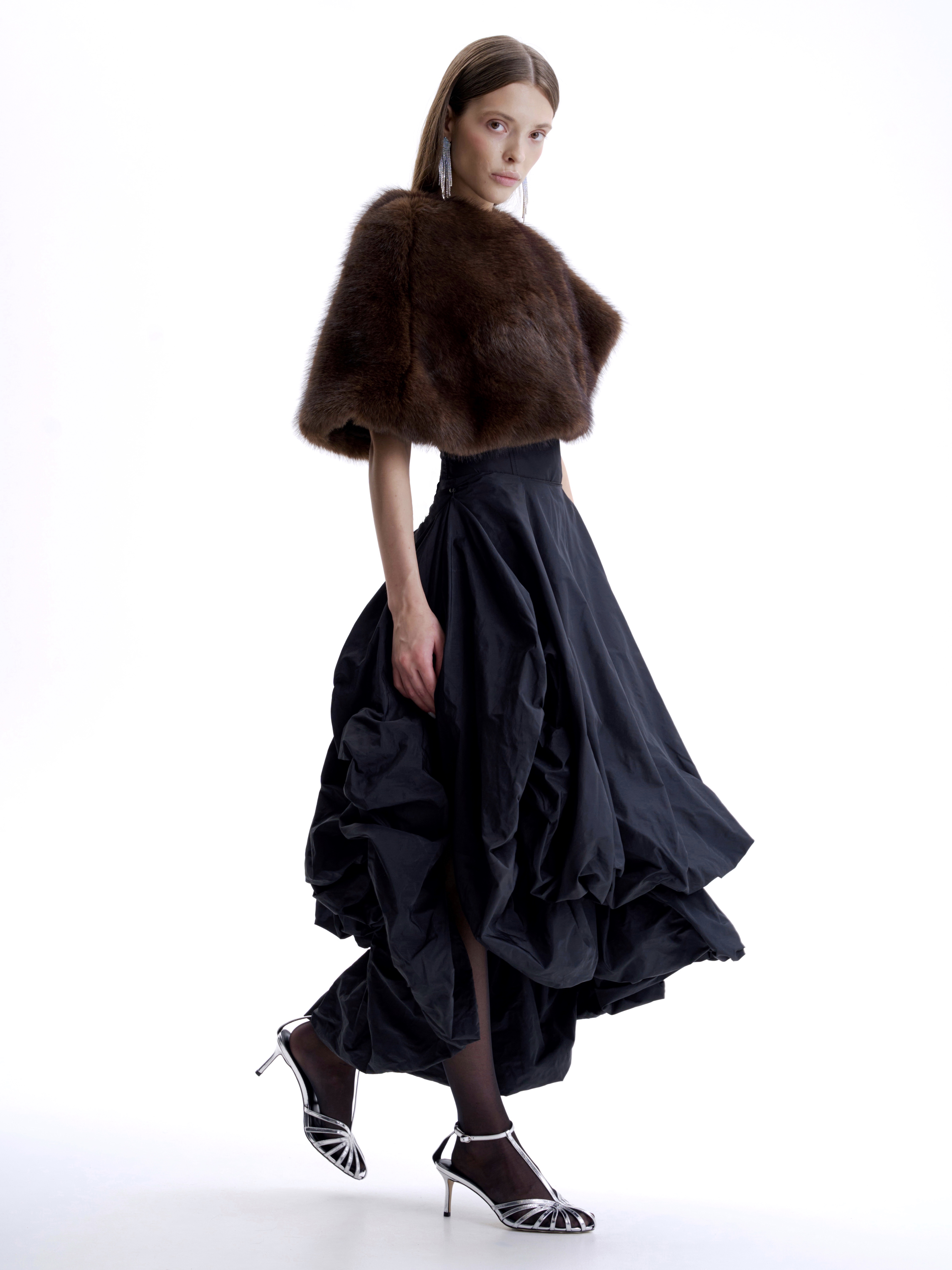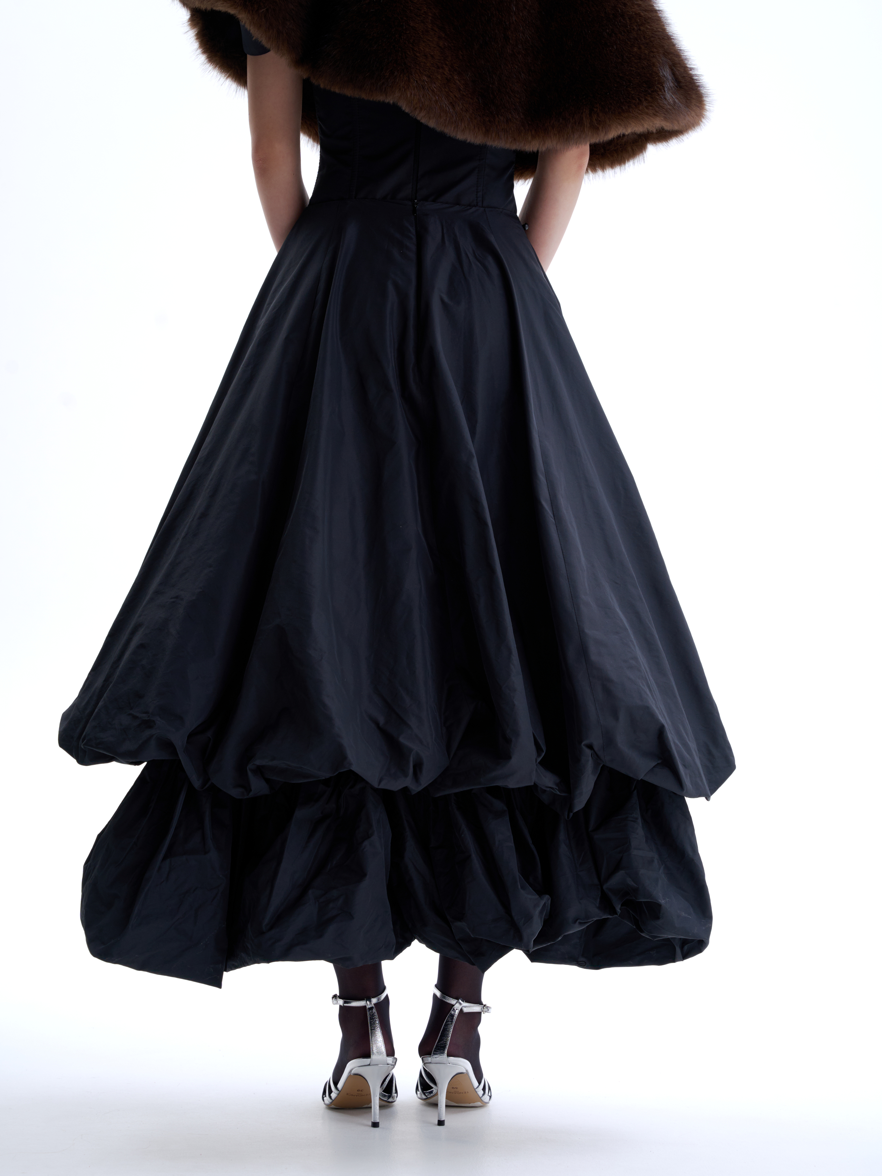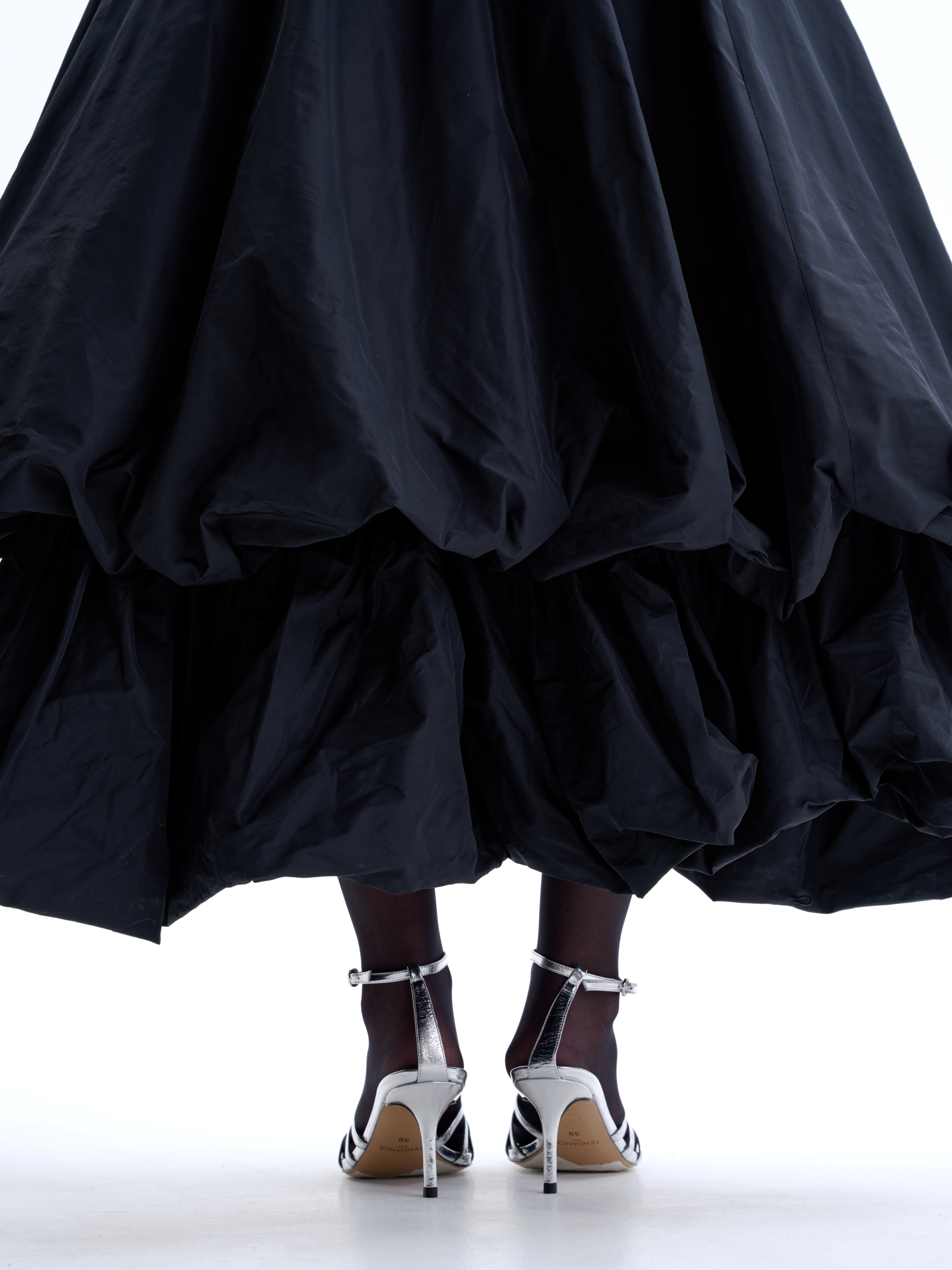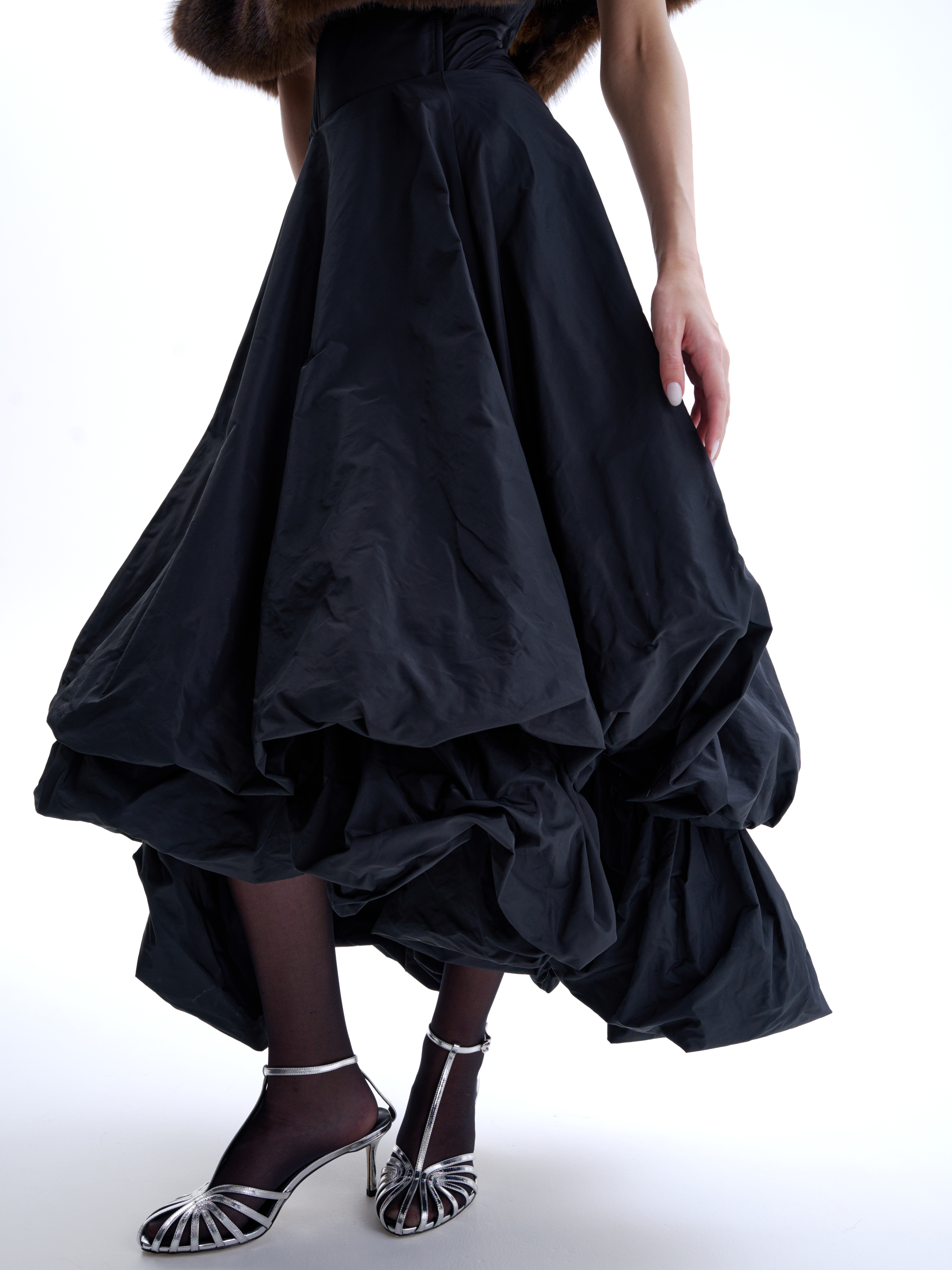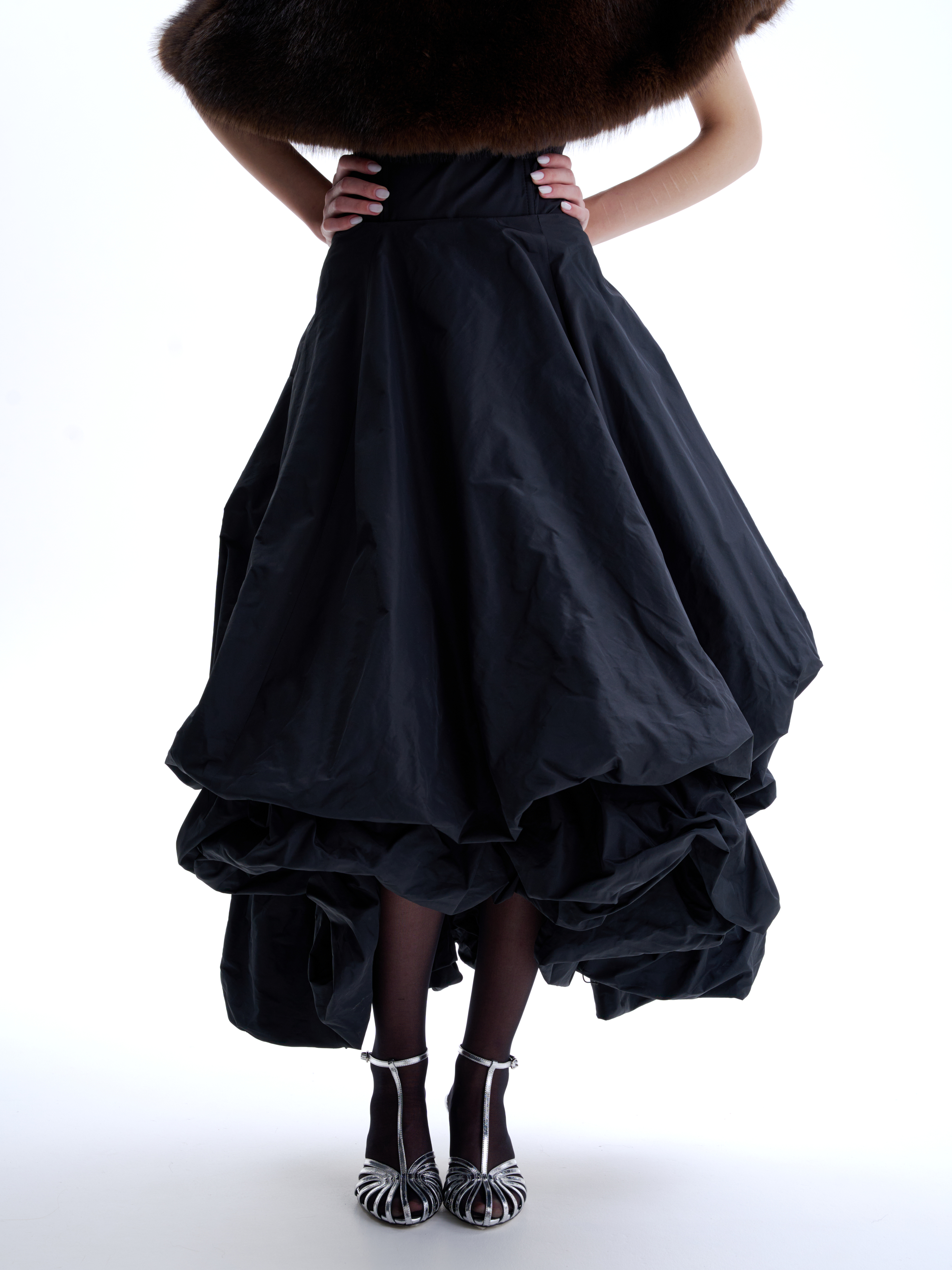 Двойная юбка баллон из тафты, юбка имеет асимметричную форму спереди чуть короче чем сзади, создавая дополнительный объем. Застегивается на потайную молнию. Юбка имеет скрытую пуговицу в районе талии и незаметную петлю на подоле для создания яркой асимметрии и глубокого выреза.