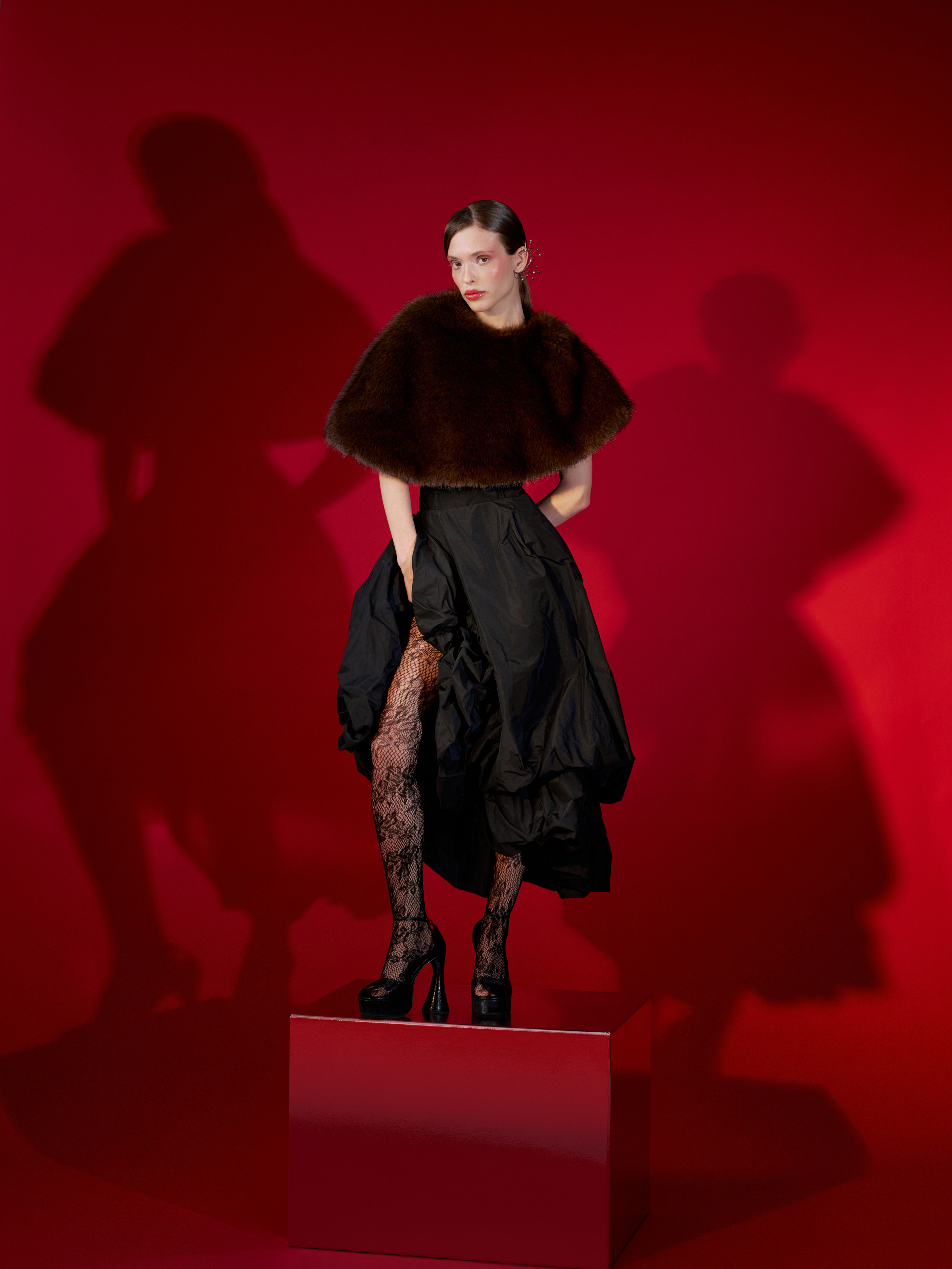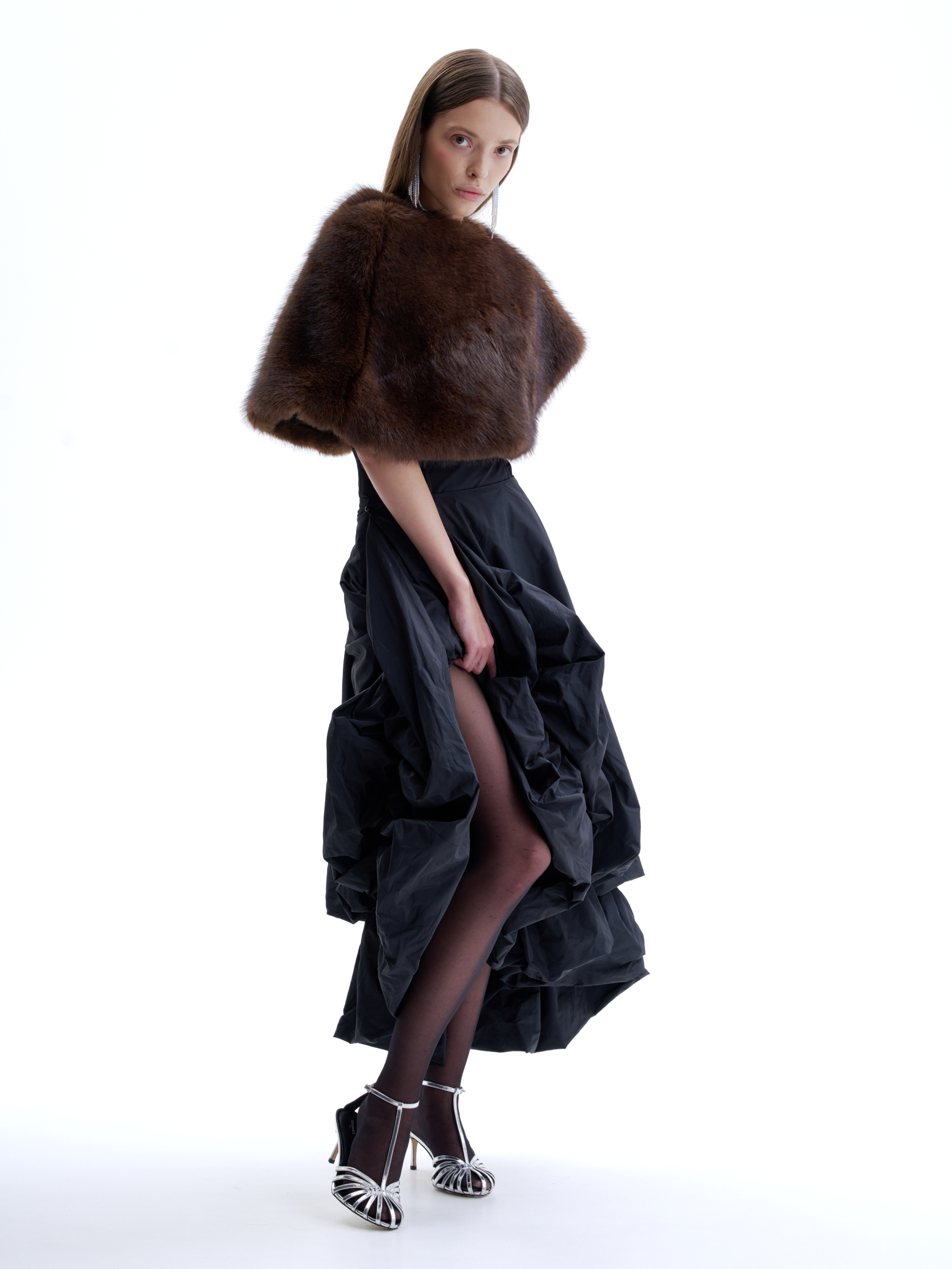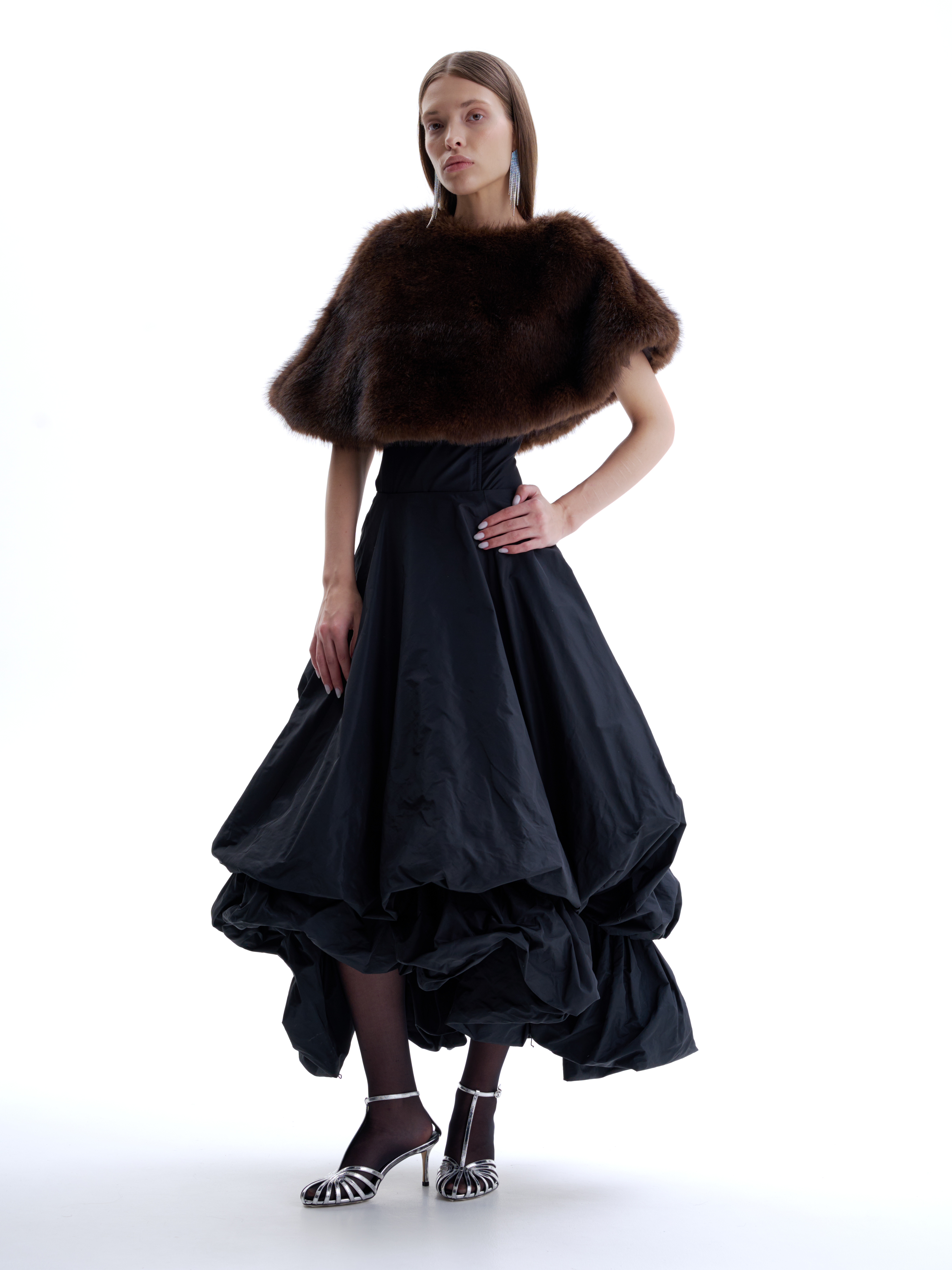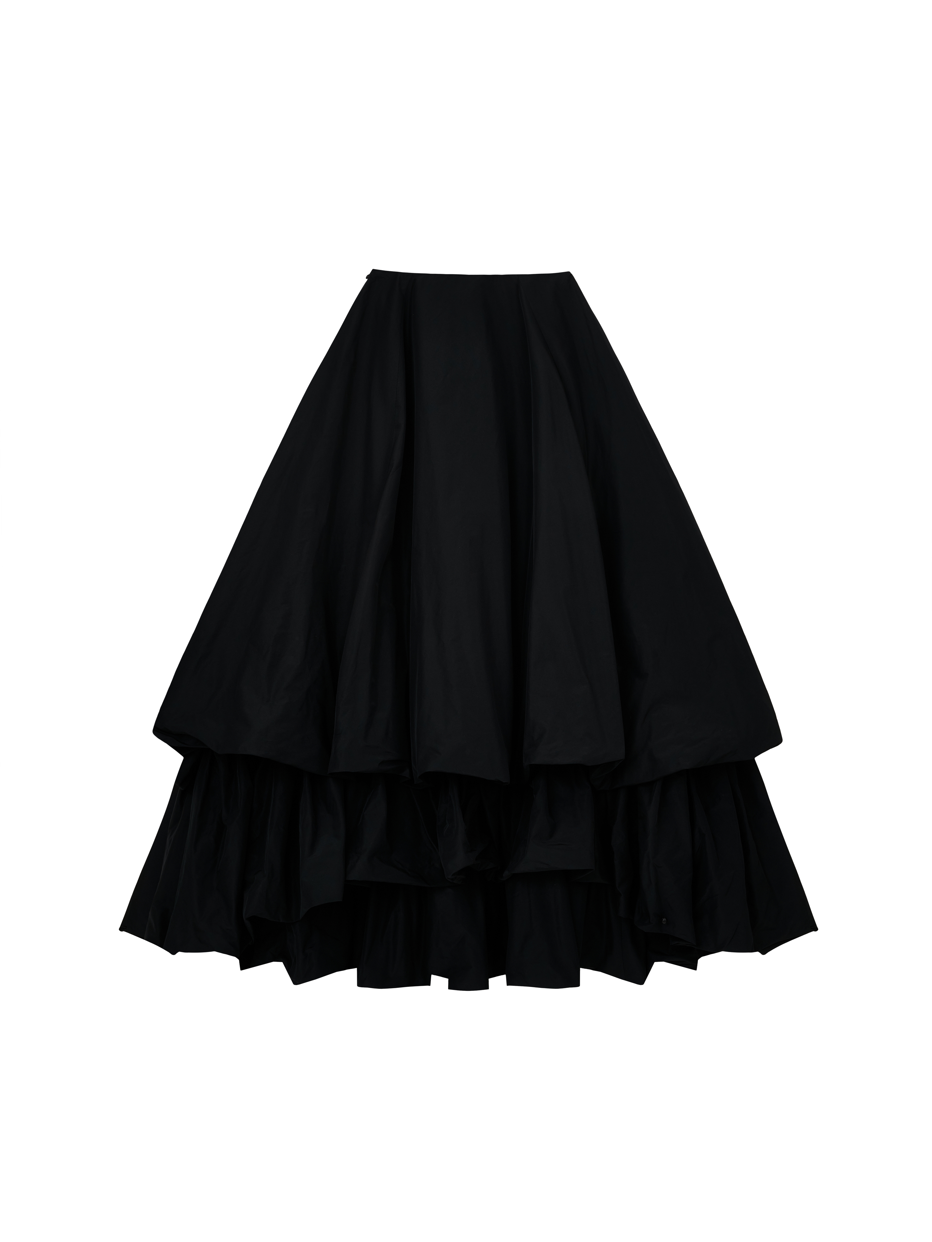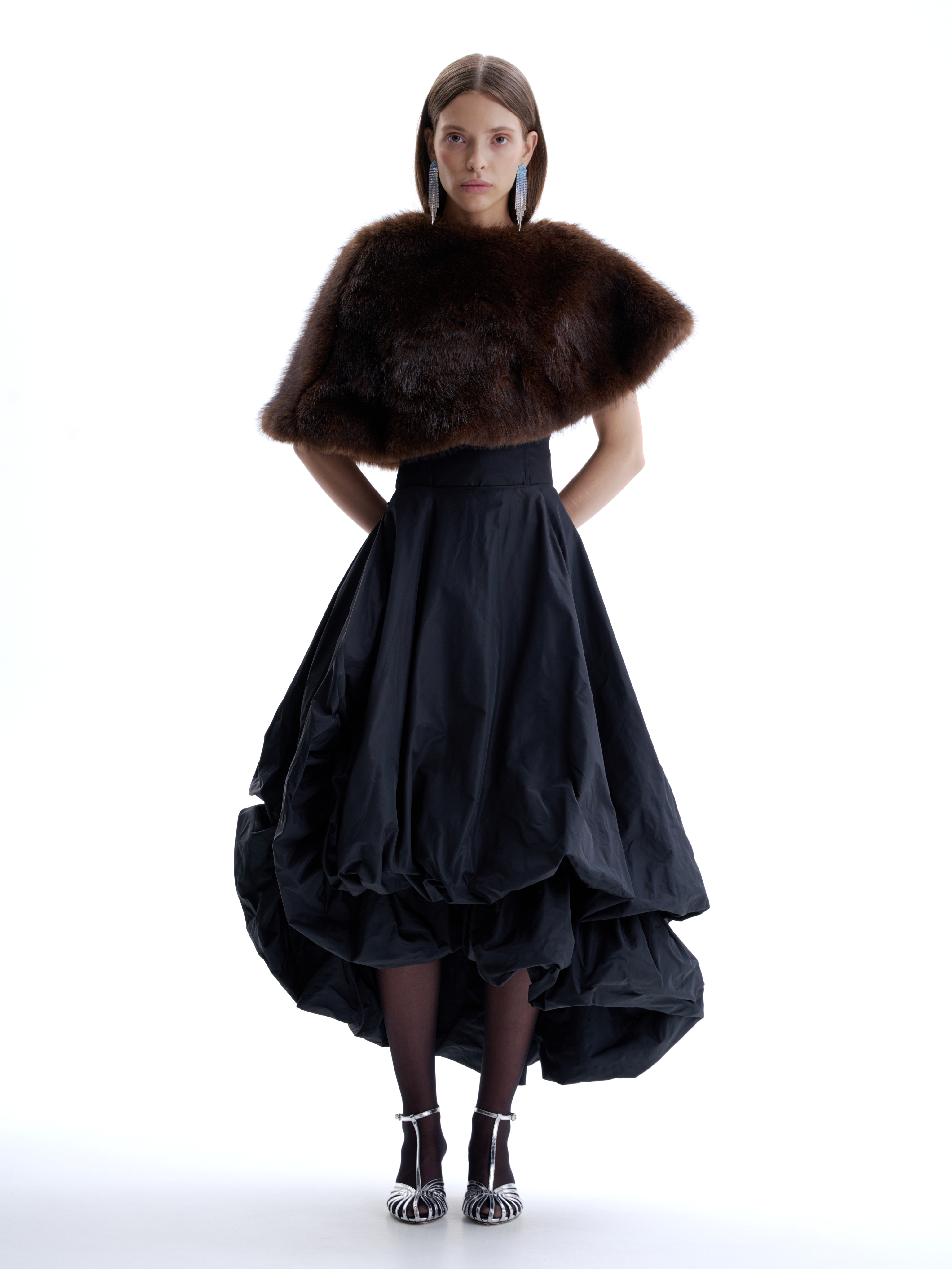 Двойная юбка баллон из тафты, юбка имеет асимметричную форму спереди чуть короче чем сзади, создавая дополнительный объем. Застегивается на потайную молнию. Юбка имеет скрытую пуговицу в районе талии и незаметную петлю на подоле для создания яркой асимметрии и глубокого выреза.