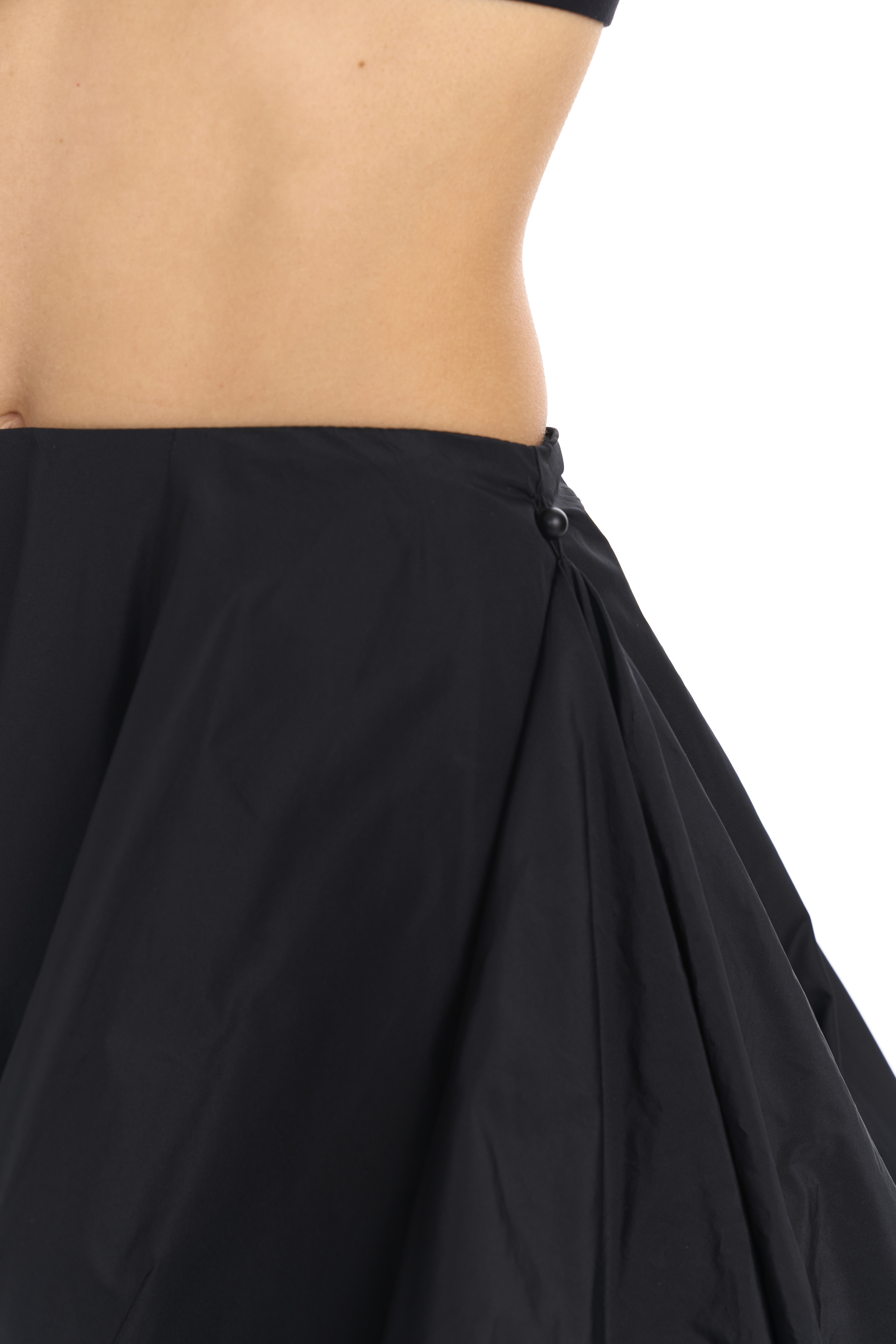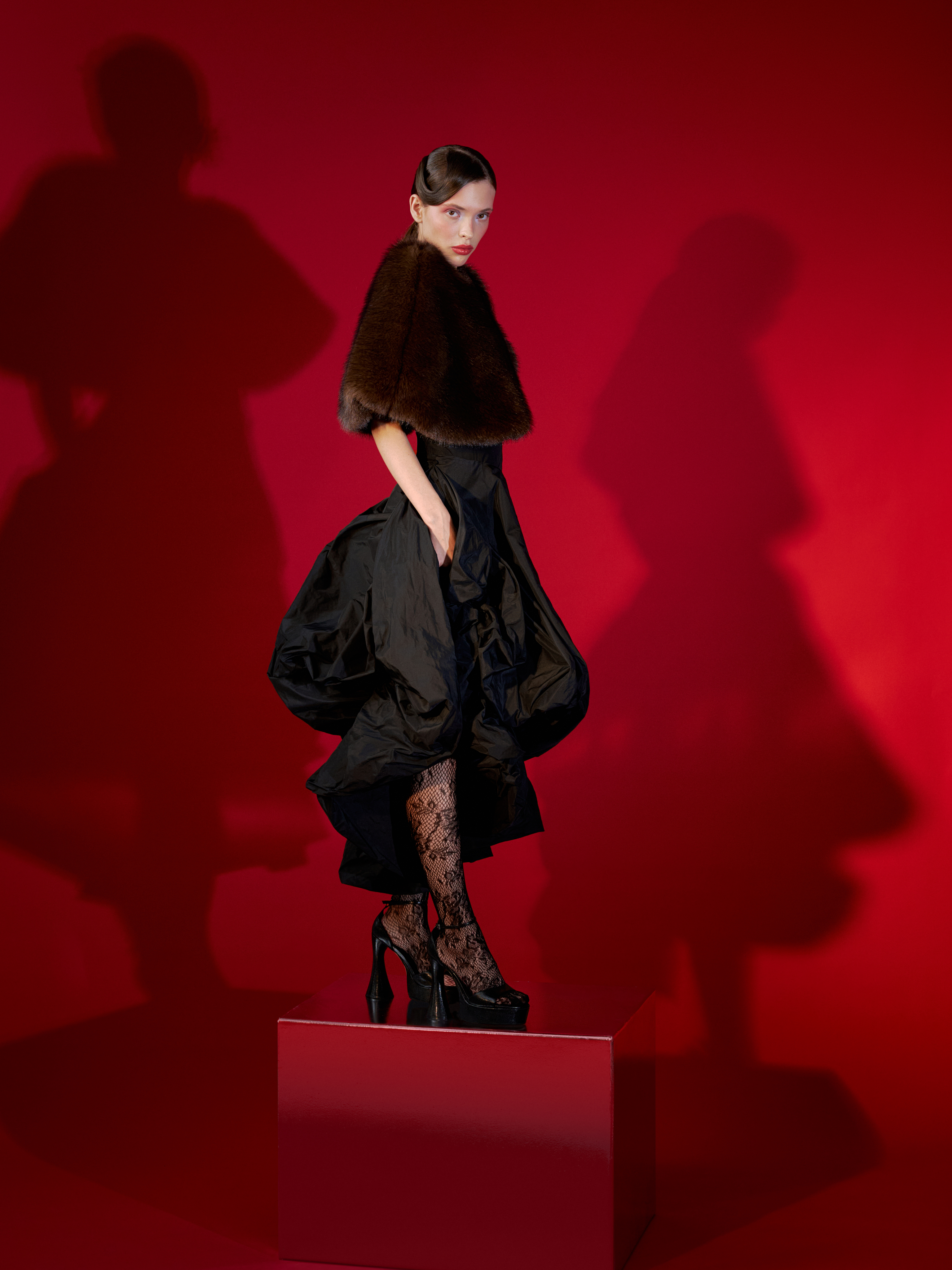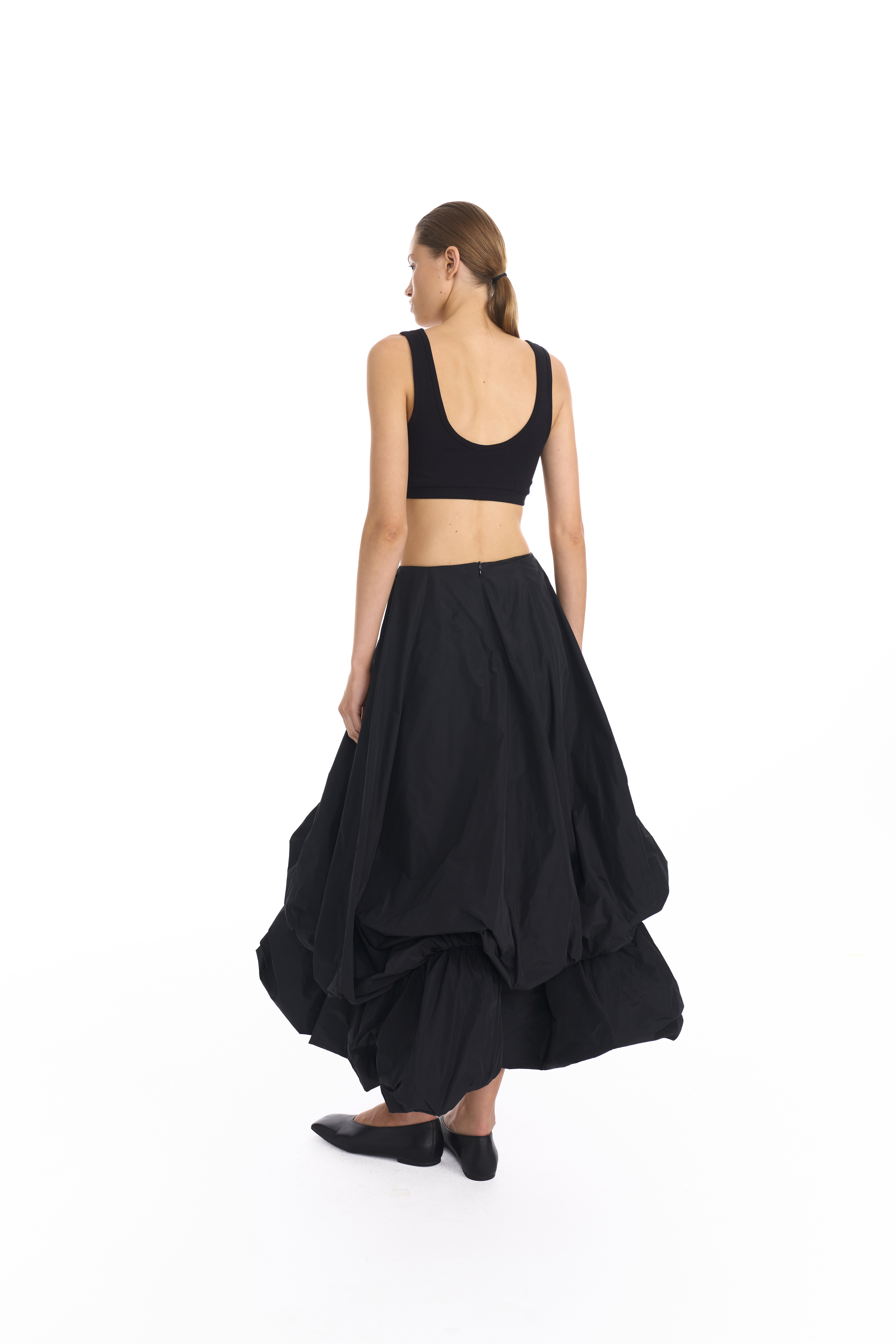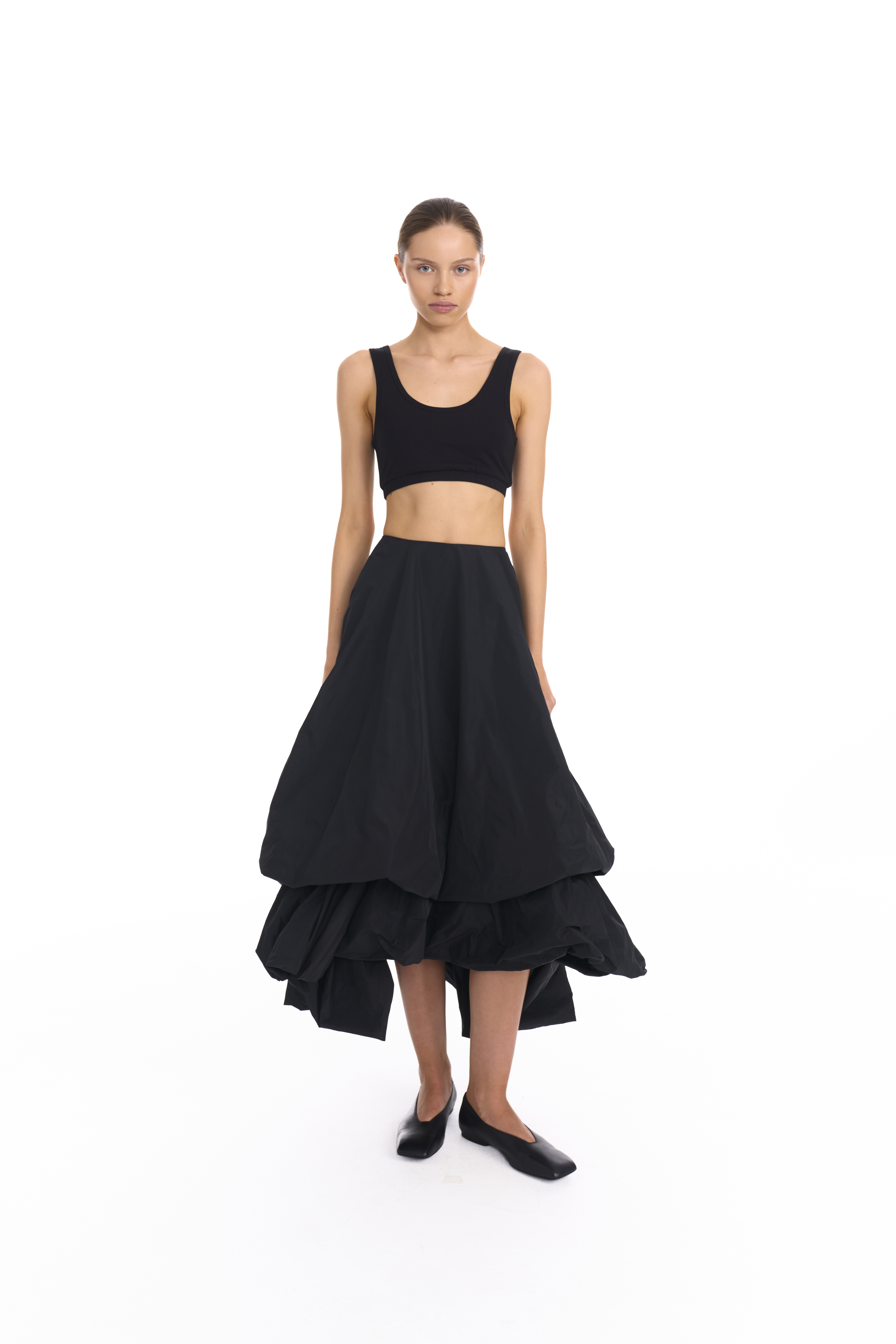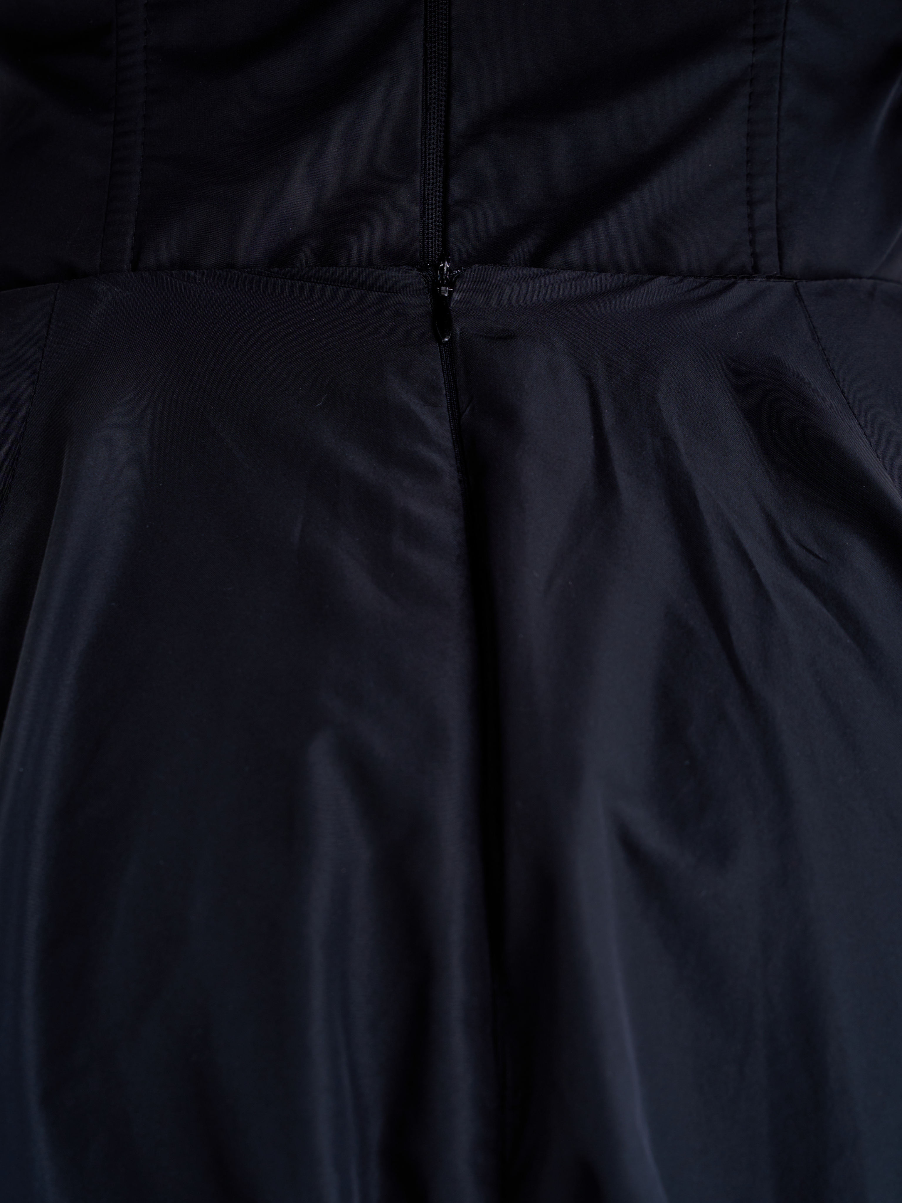 Двойная юбка баллон из тафты, юбка имеет асимметричную форму спереди чуть короче чем сзади, создавая дополнительный объем. Застегивается на потайную молнию. Юбка имеет скрытую пуговицу в районе талии и незаметную петлю на подоле для создания яркой асимметрии и глубокого выреза.
