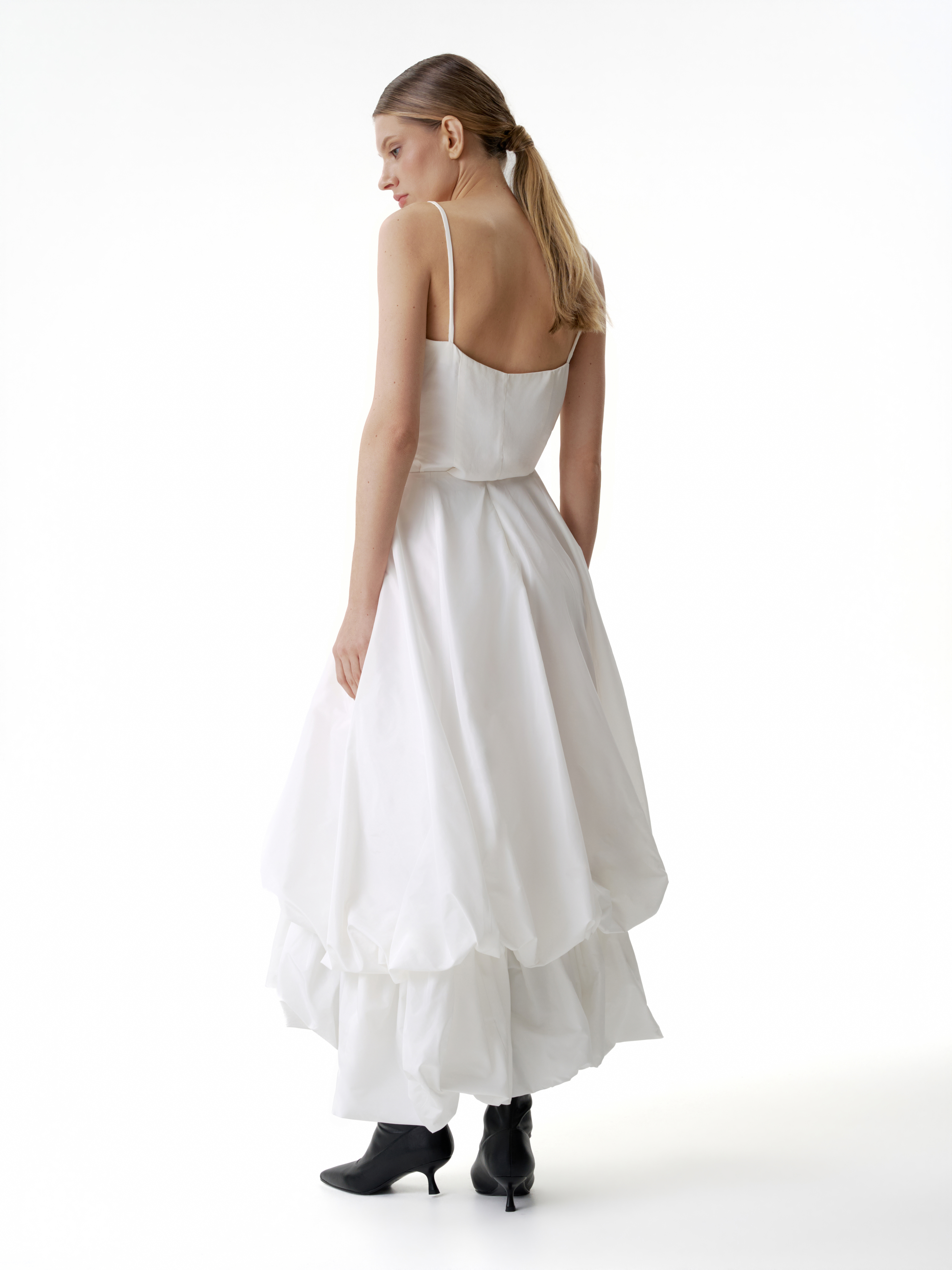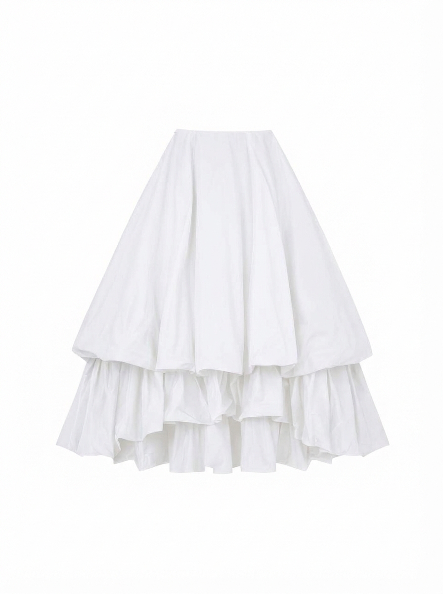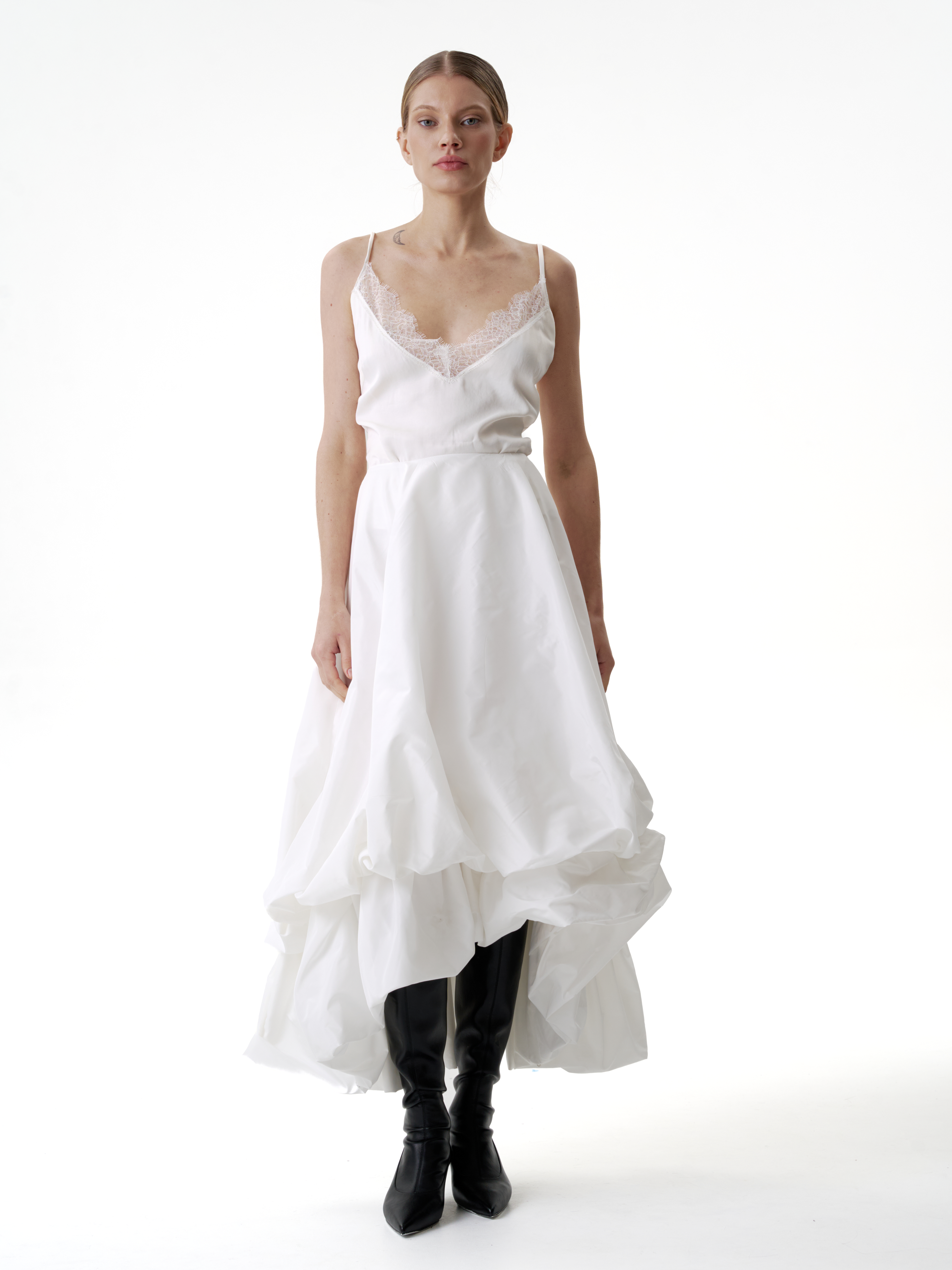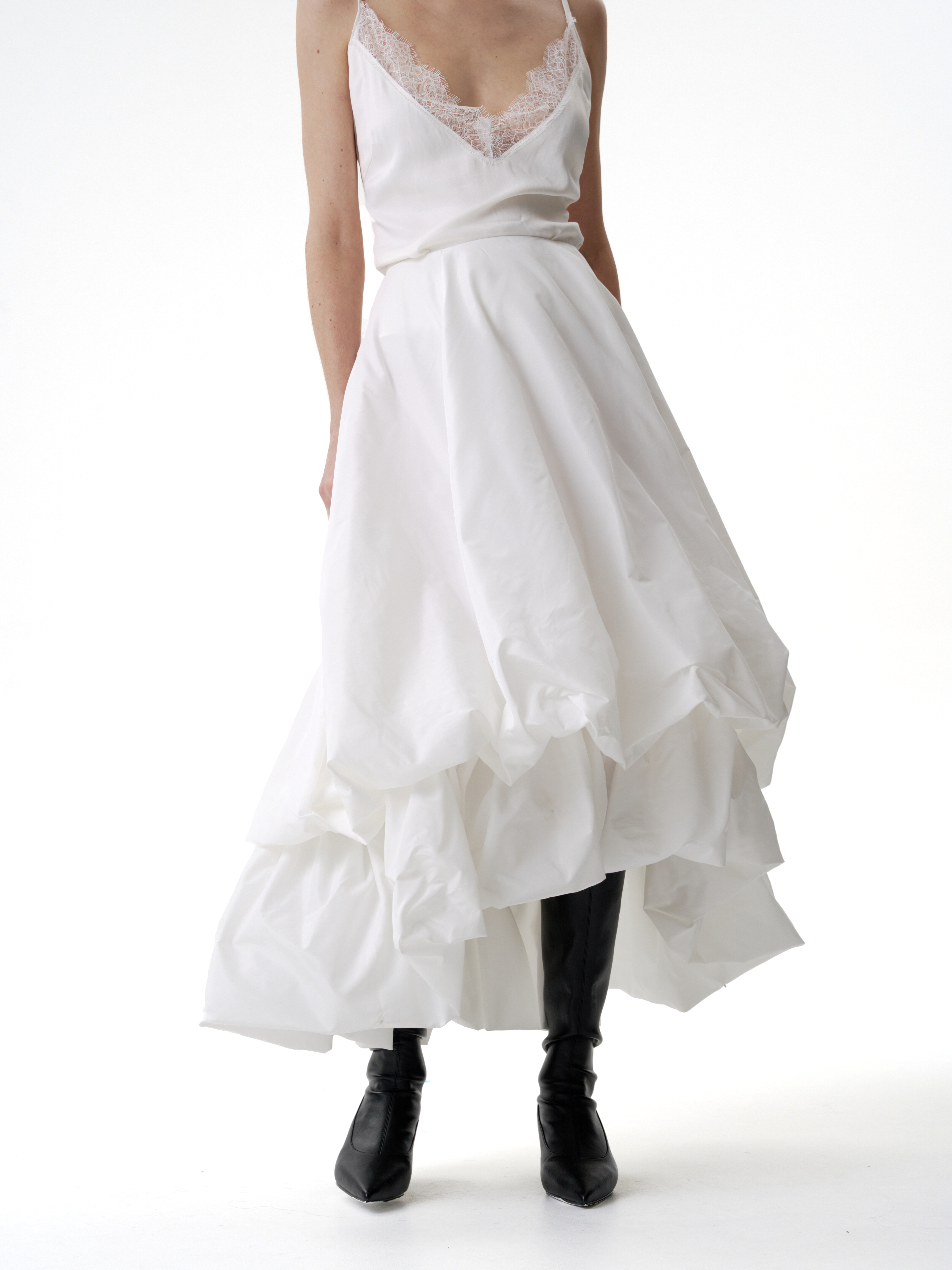 Двойная юбка баллон из тафты, юбка имеет асимметричную форму спереди чуть короче чем сзади, создавая дополнительный объем. Застегивается на потайную молнию. Юбка имеет скрытую пуговицу в районе талии и незаметную петлю на подоле для создания яркой асимметрии и глубокого выреза.