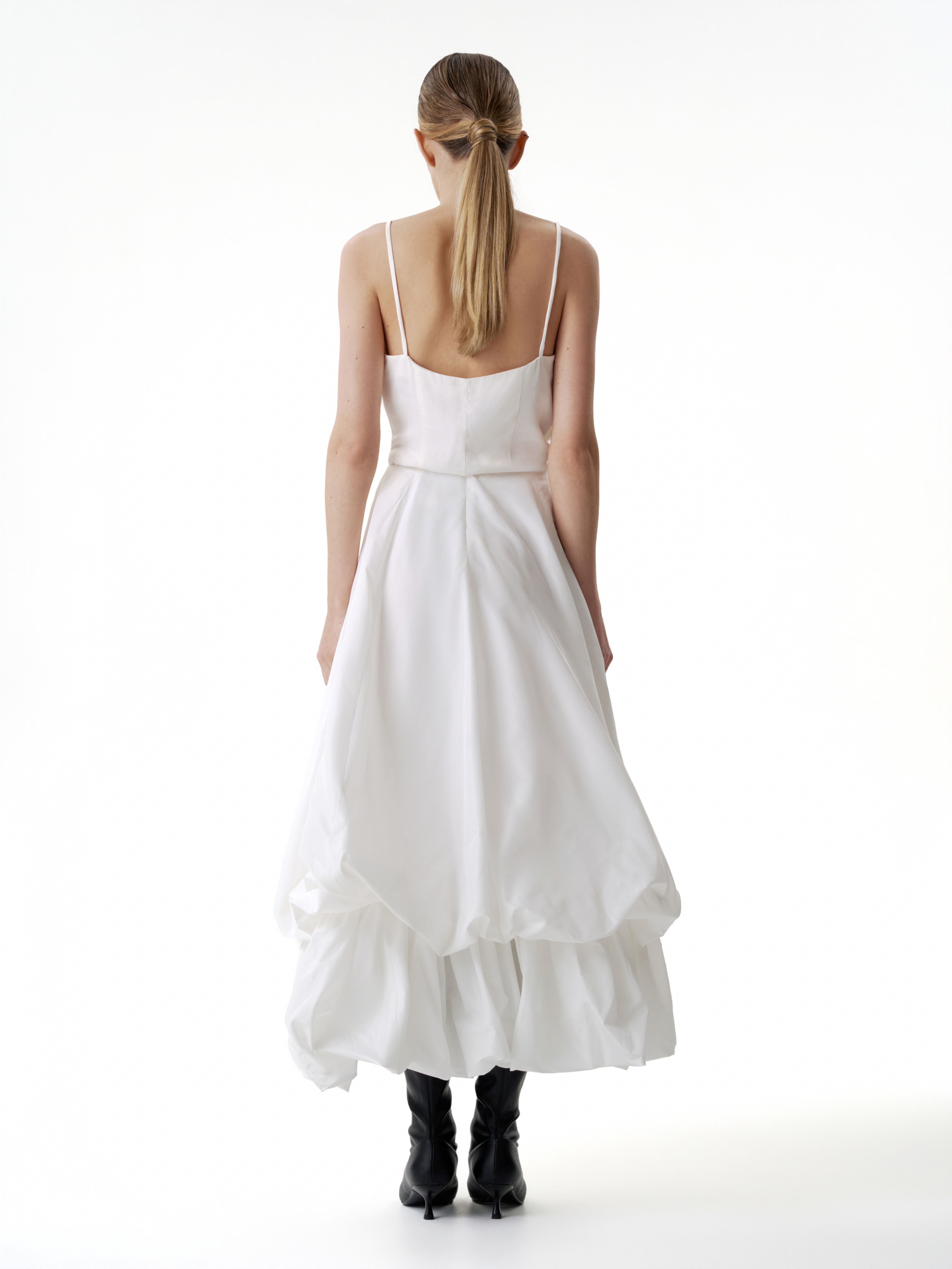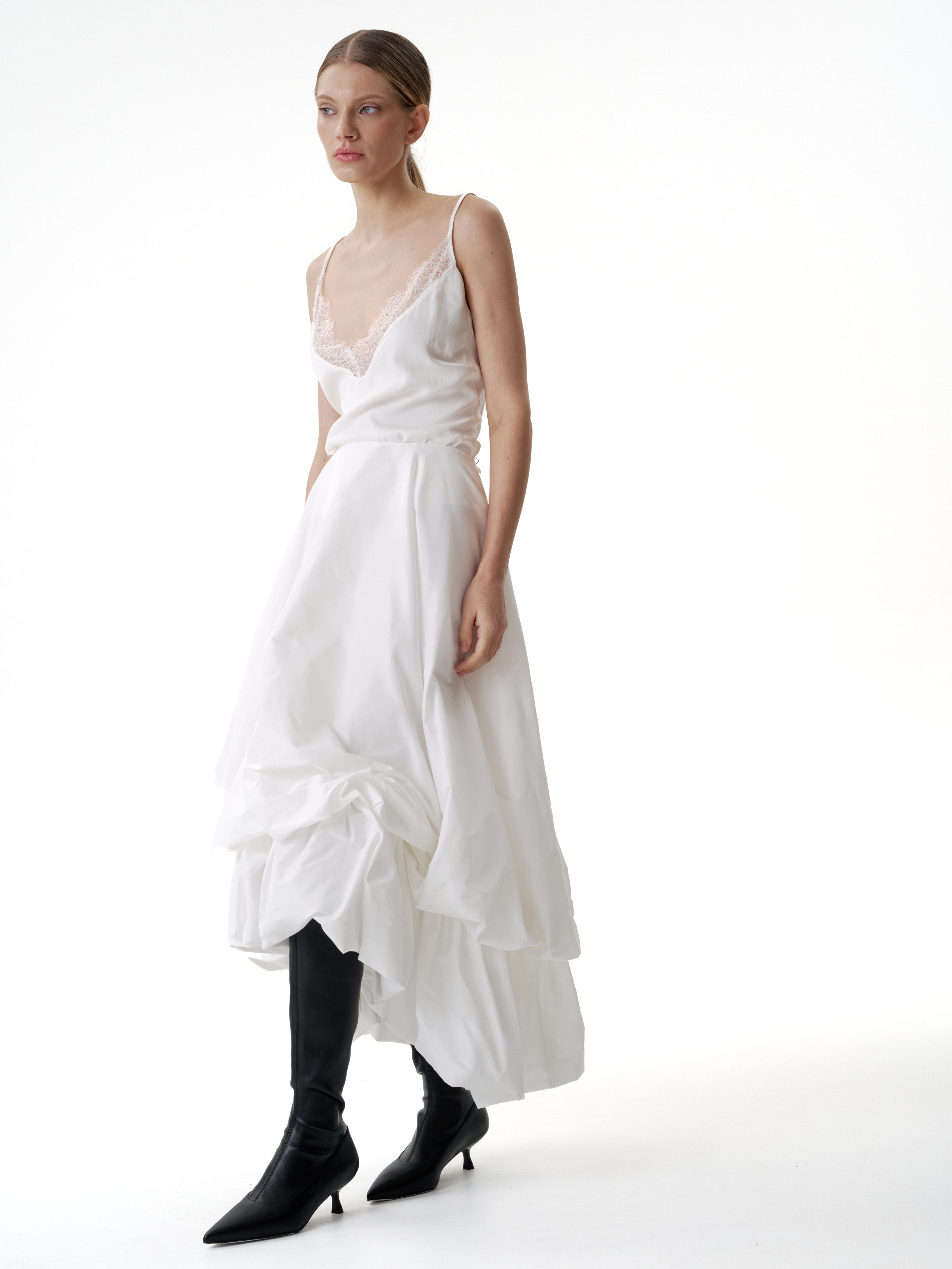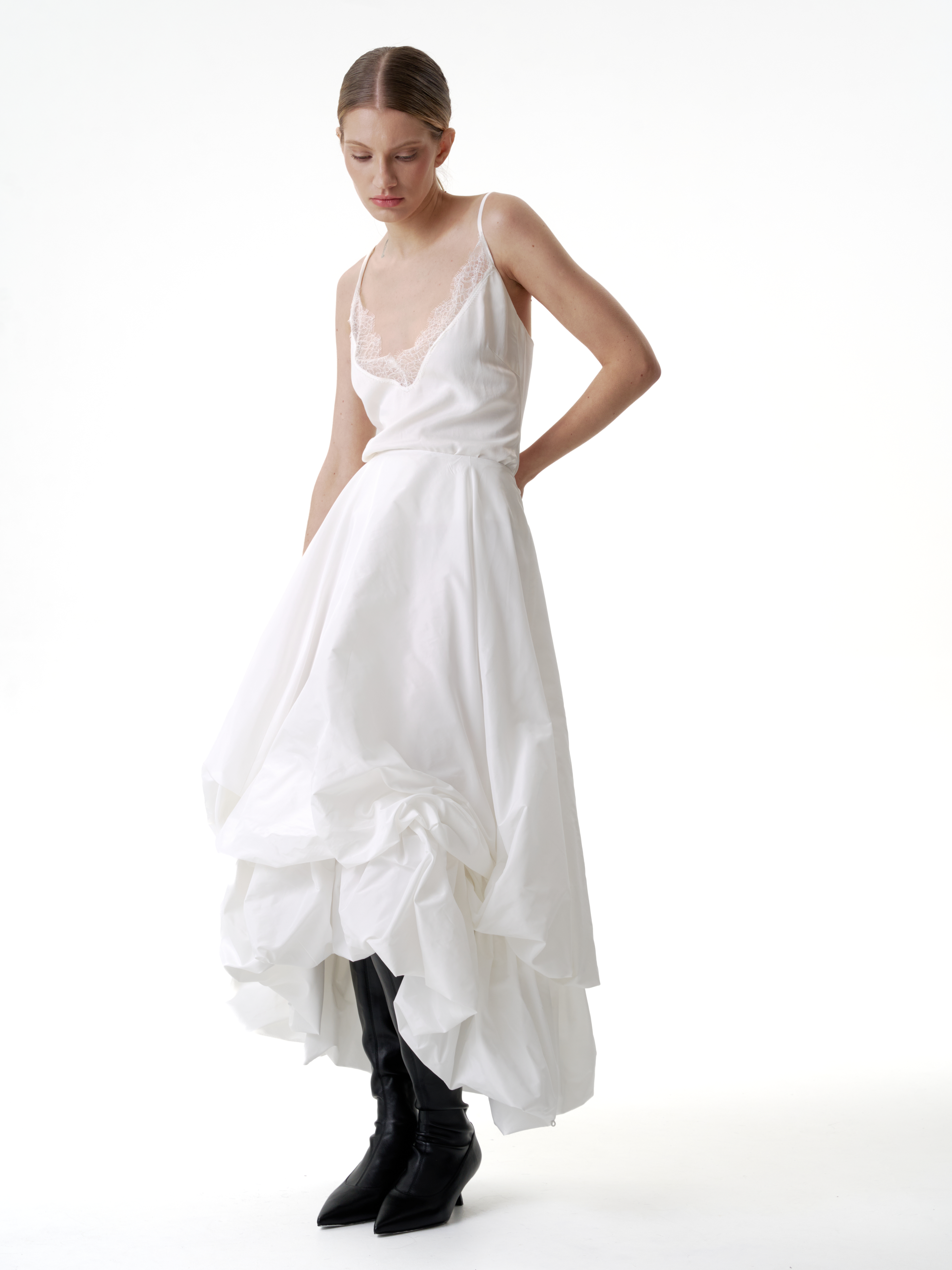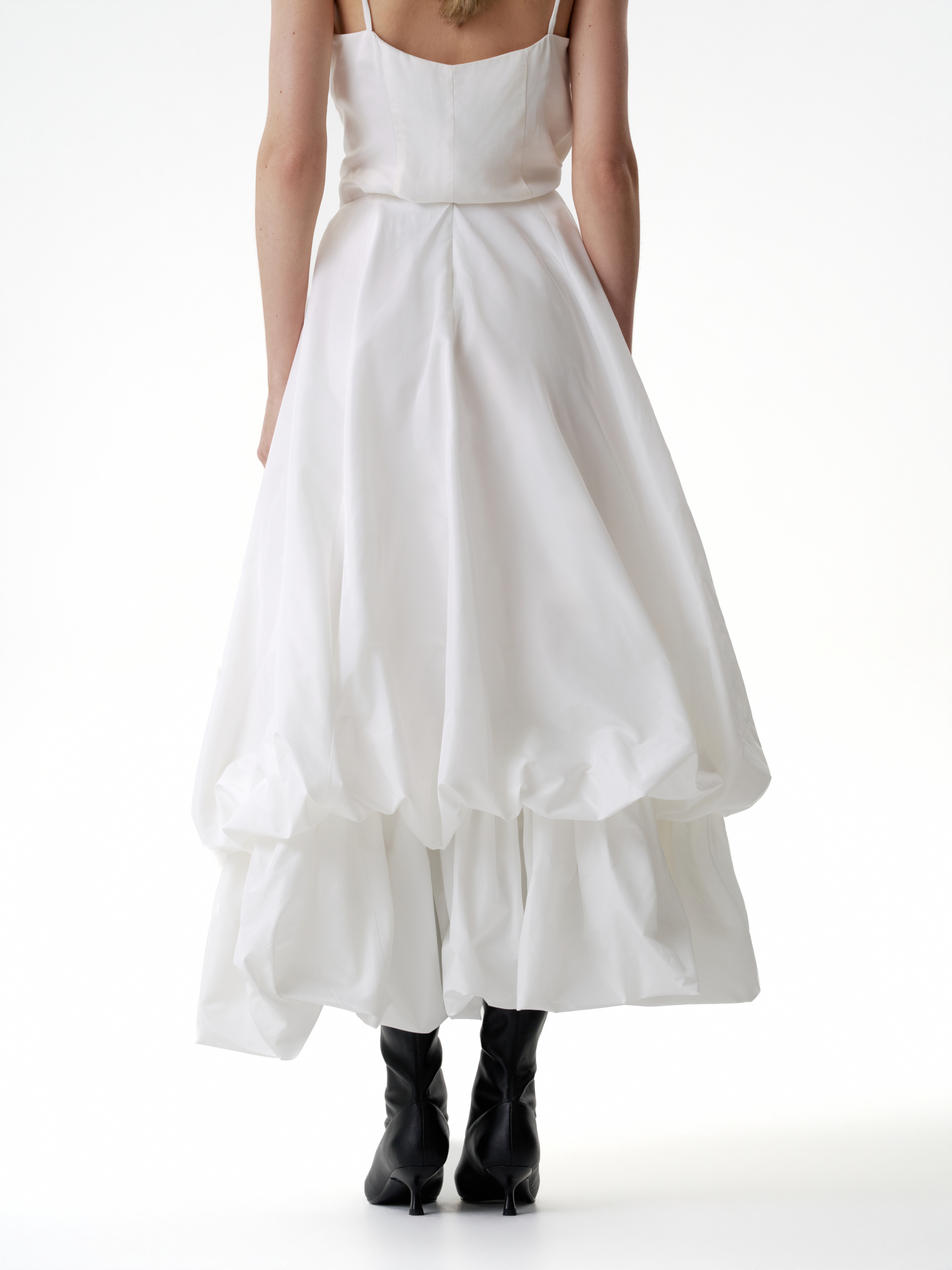 Двойная юбка баллон из тафты, юбка имеет асимметричную форму спереди чуть короче чем сзади, создавая дополнительный объем. Застегивается на потайную молнию. Юбка имеет скрытую пуговицу в районе талии и незаметную петлю на подоле для создания яркой асимметрии и глубокого выреза.