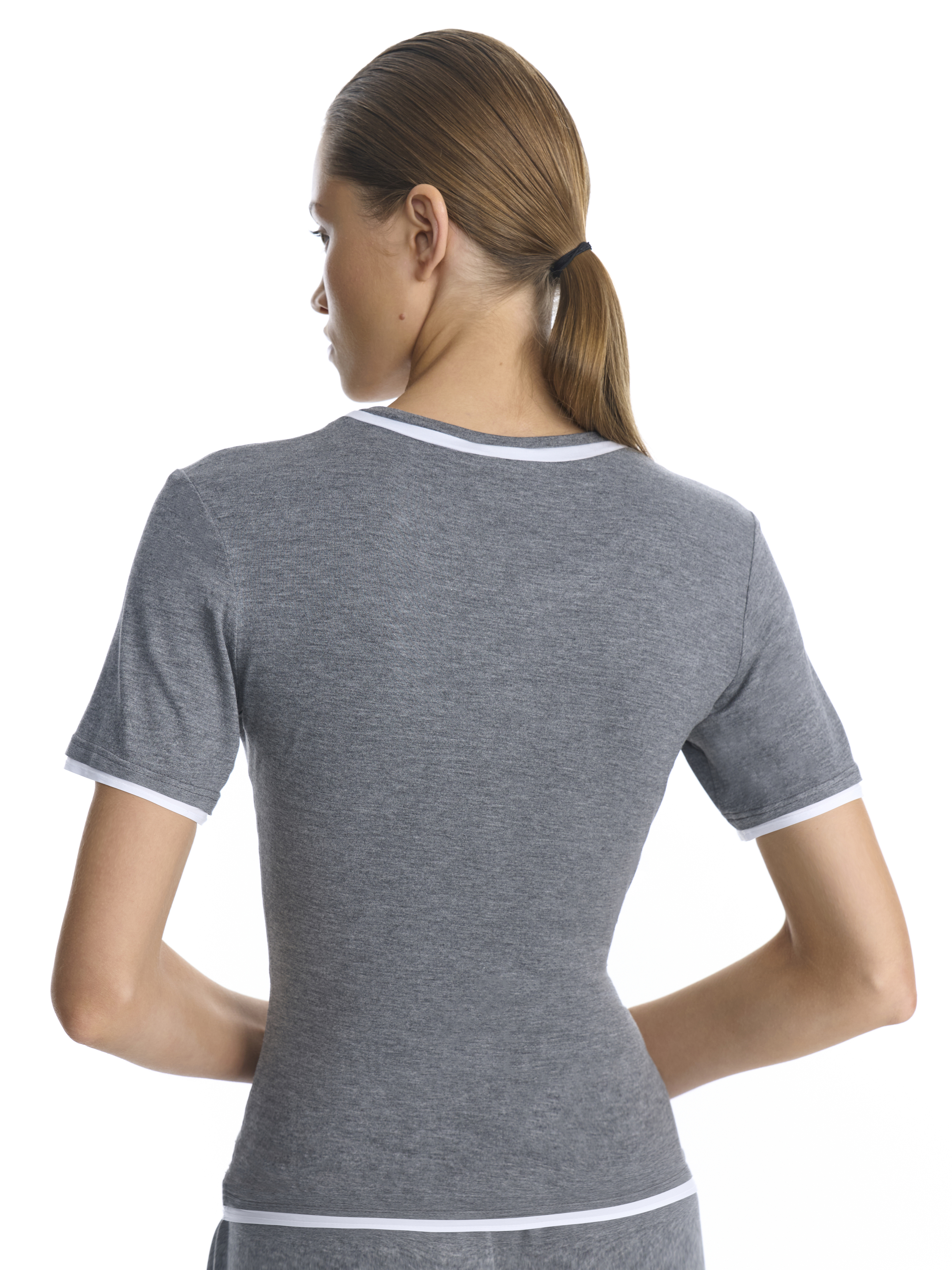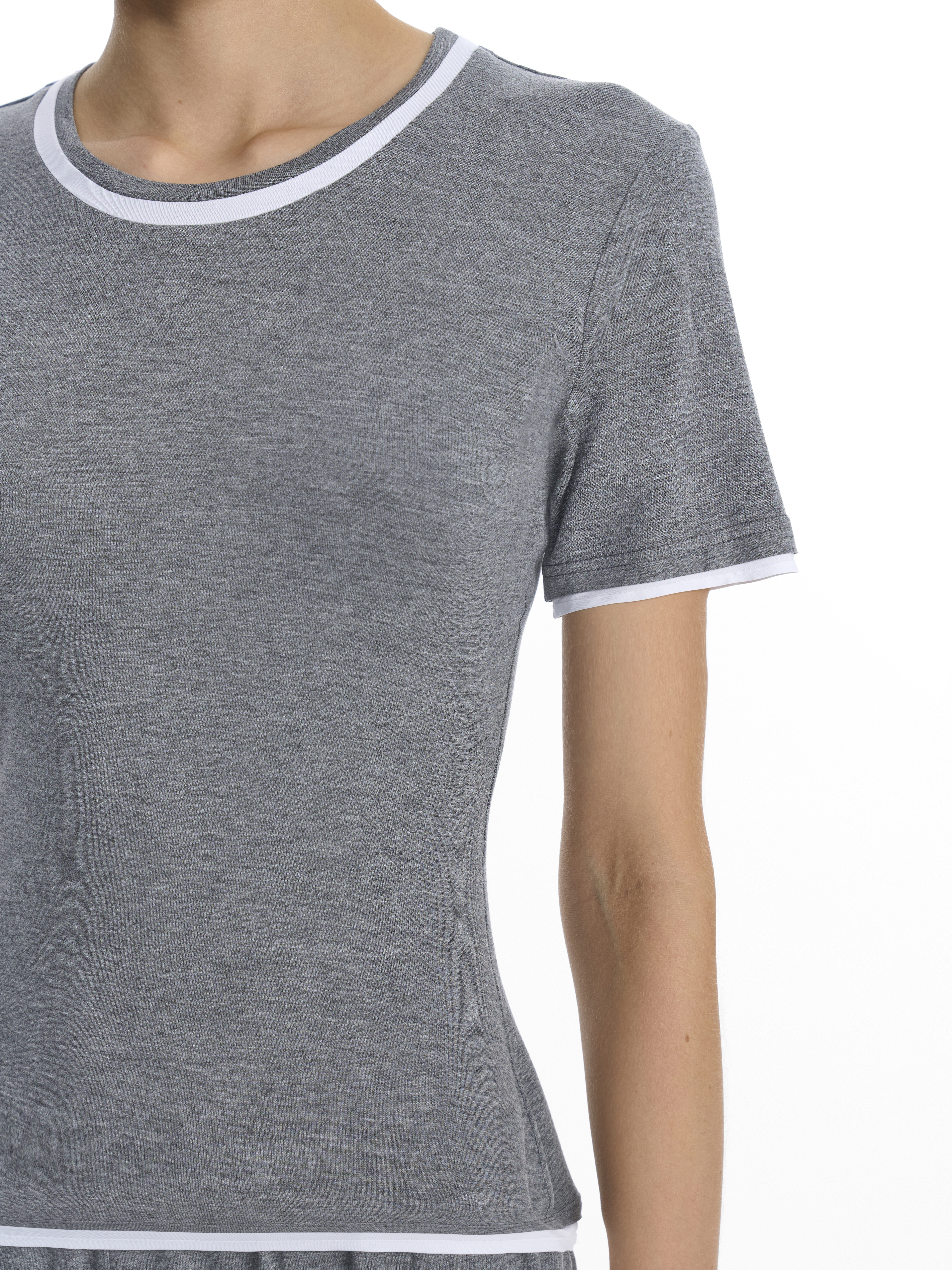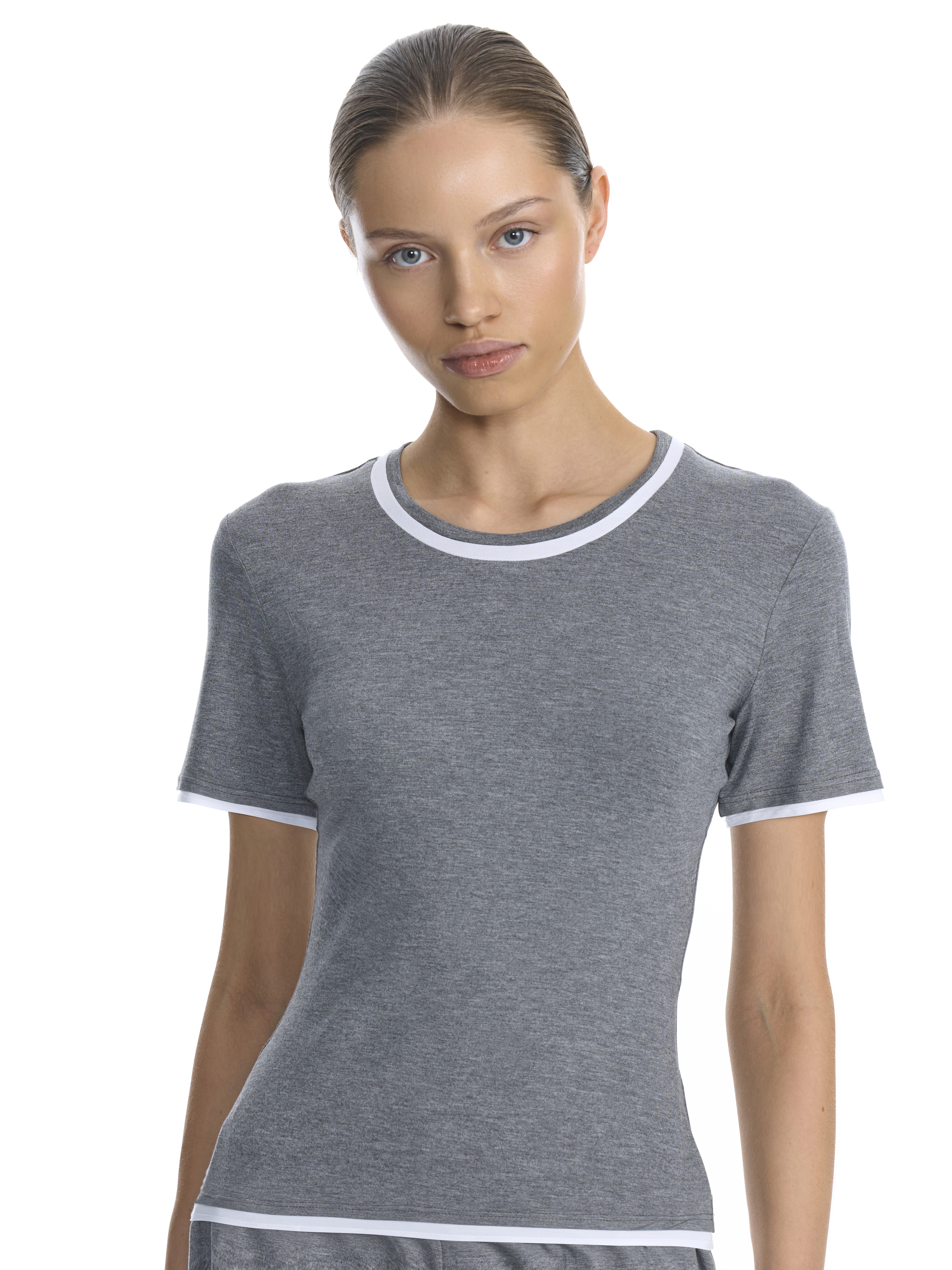 Футболка приталенного силуэта с контрастными вставками на рукавах, горловине и по низу изделия, выполнена из мягкого трикотажа.