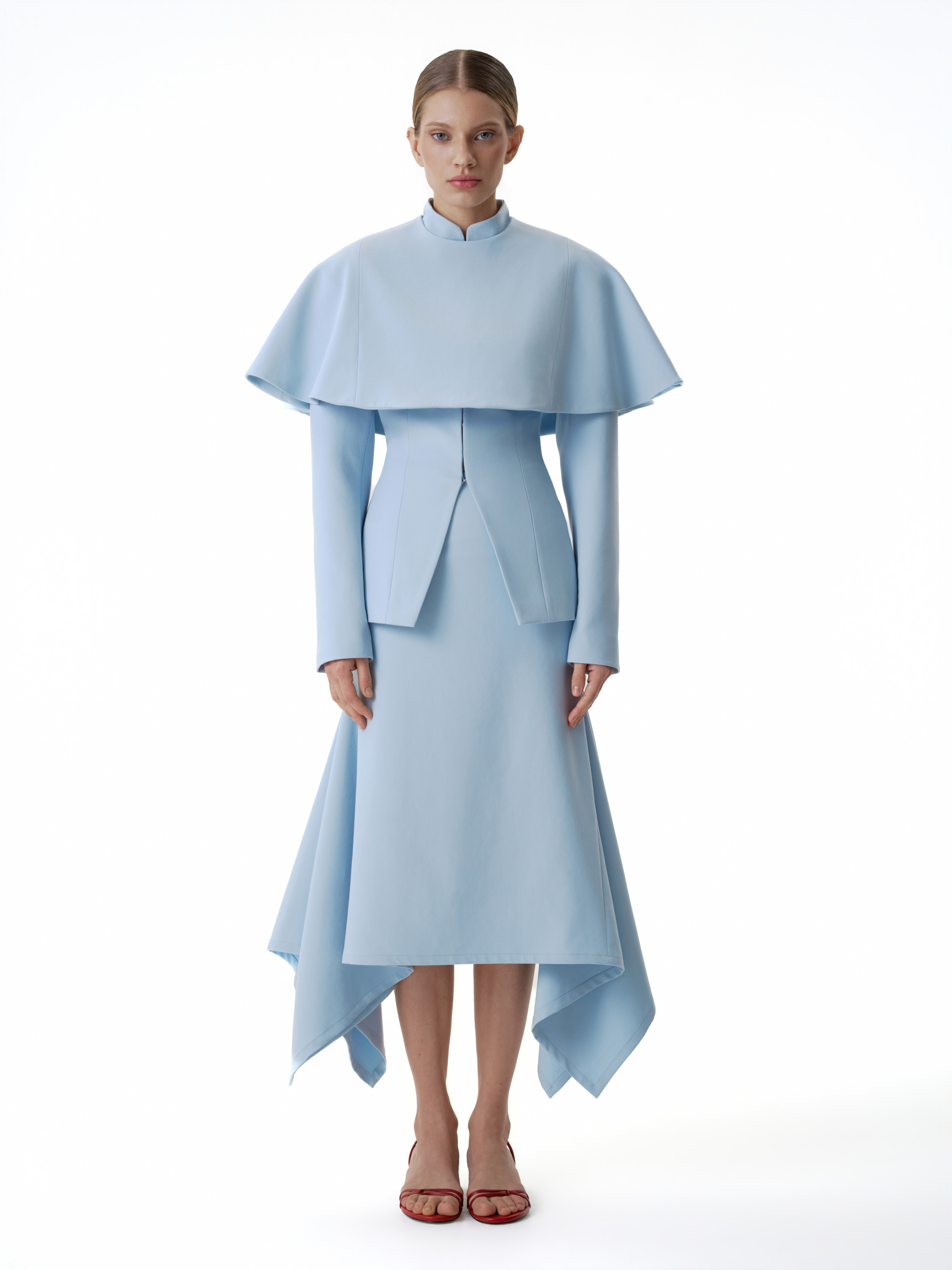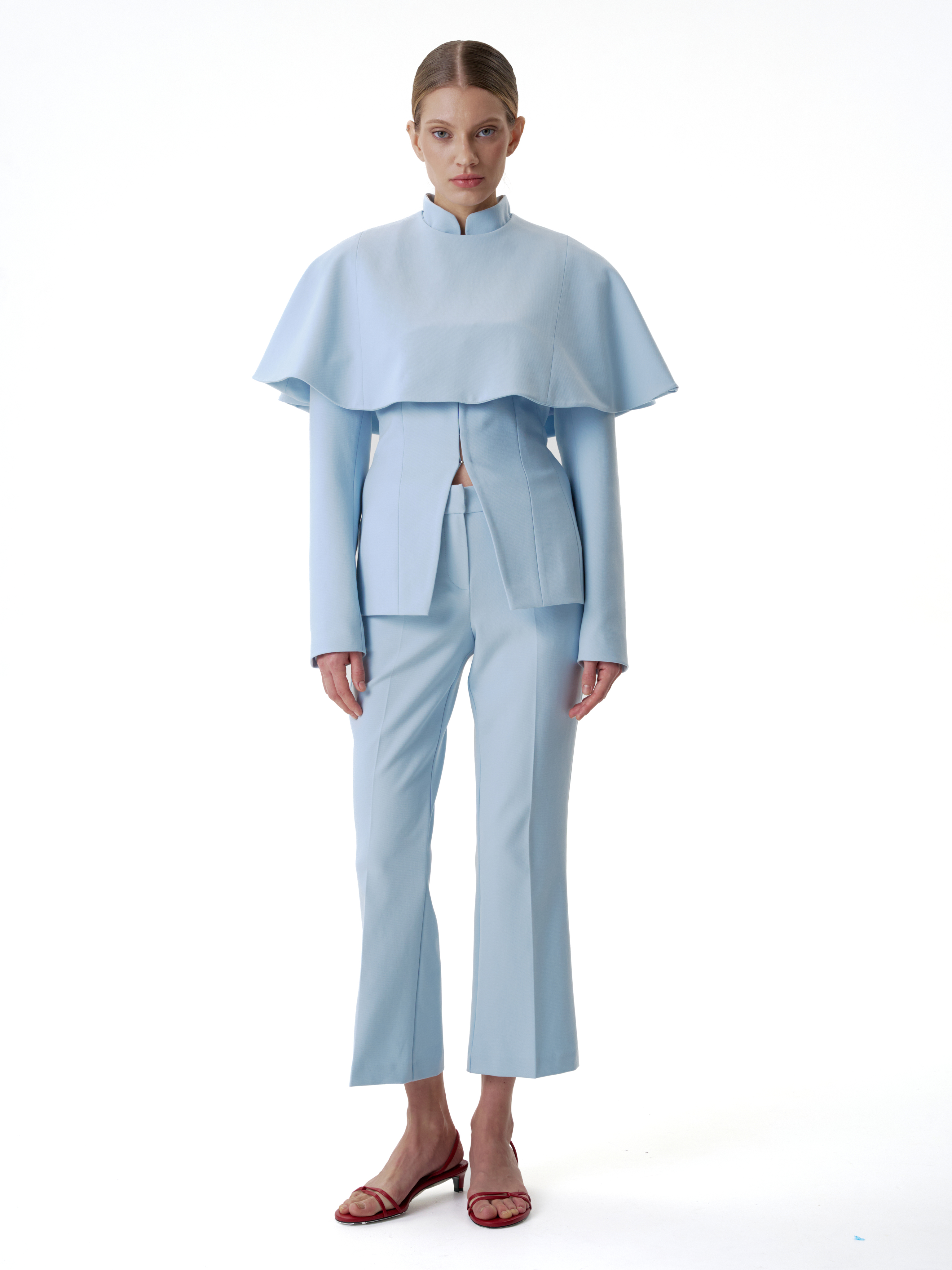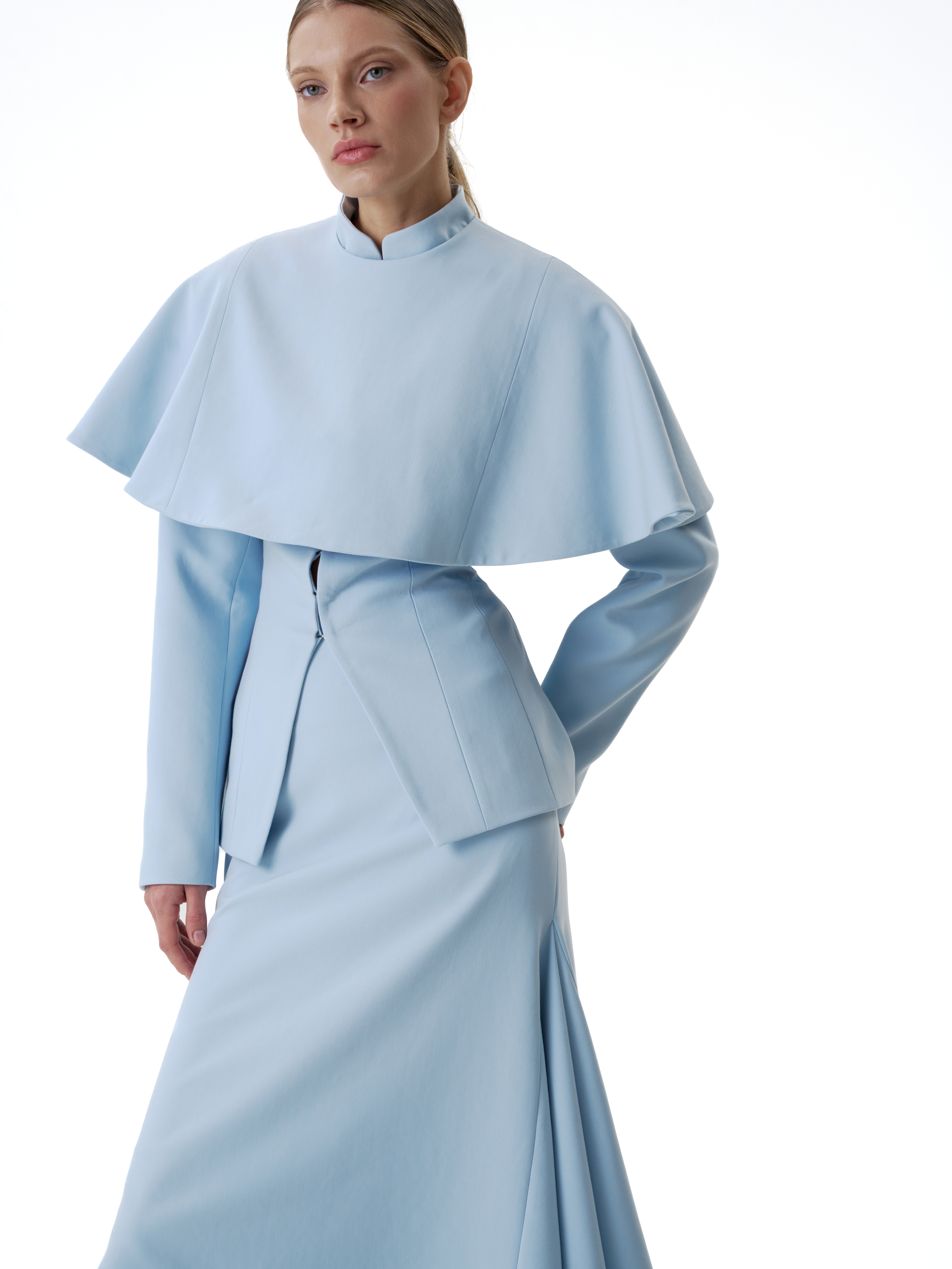 Застежка на потайные кнопки расположена сзади, благодаря чему перед остается лаконичным. Горжетку можно носить поверх жакета в тон, усиливая многослойность комплекта, или как самостоятельный акцент в образе.