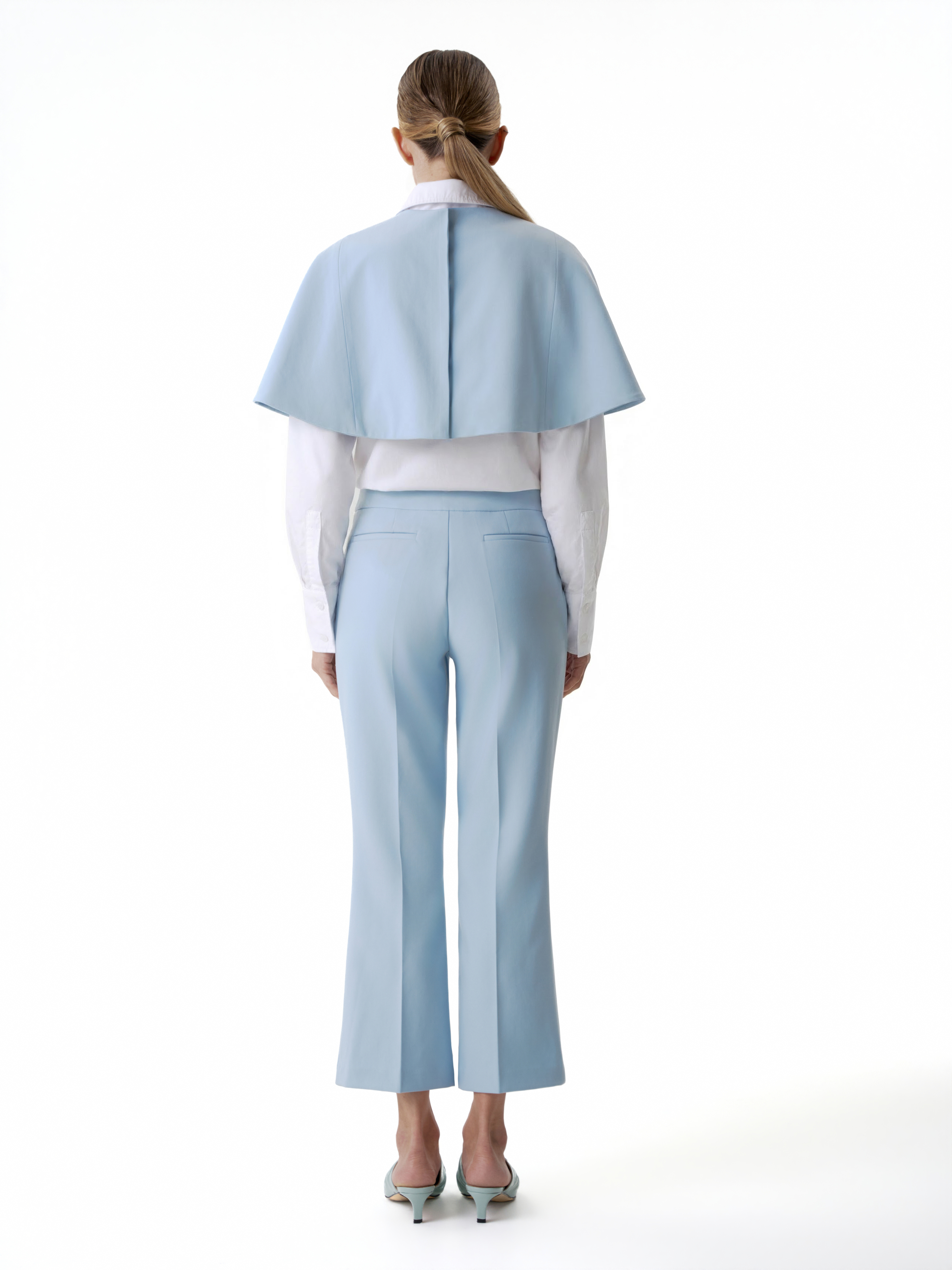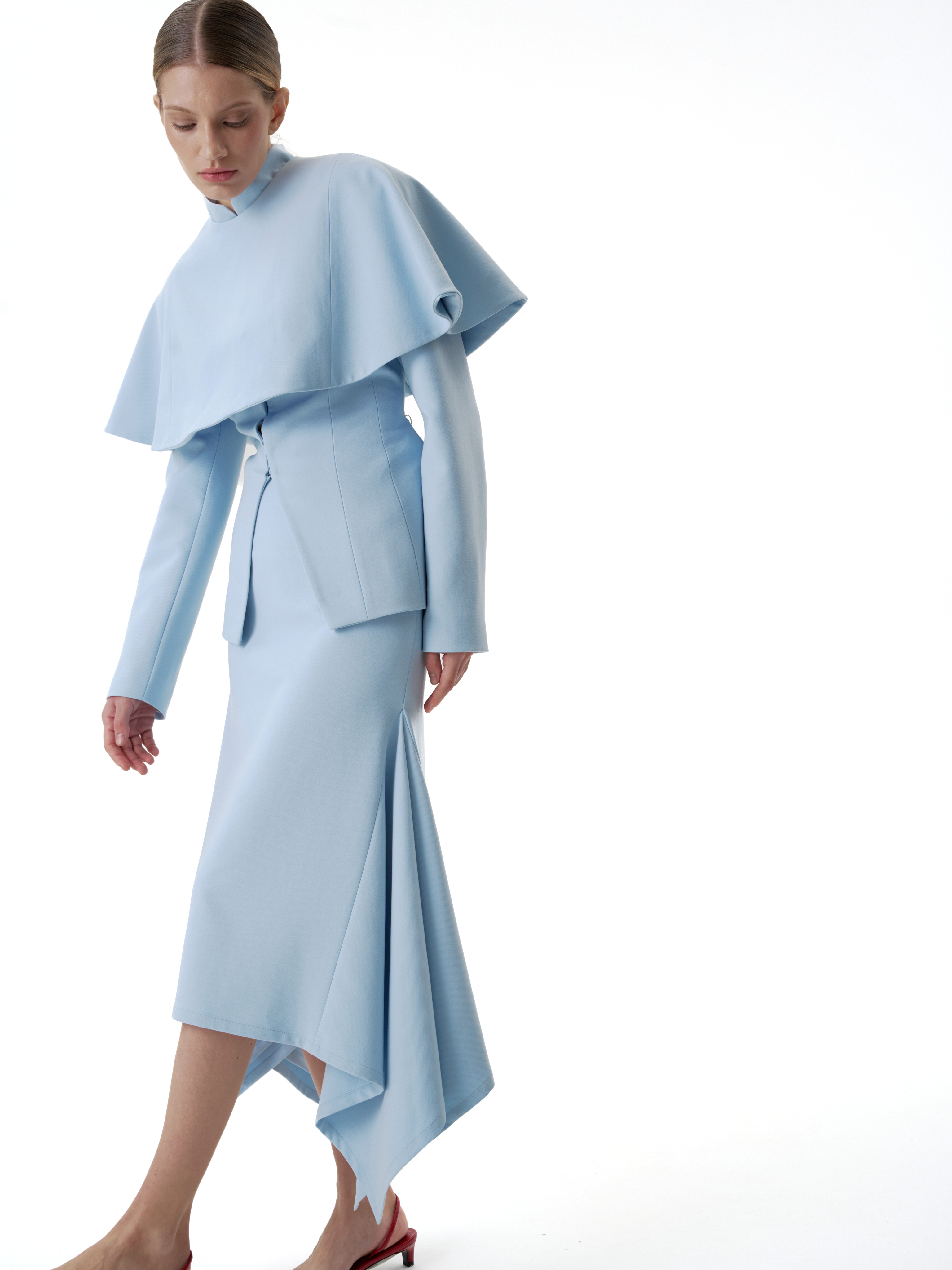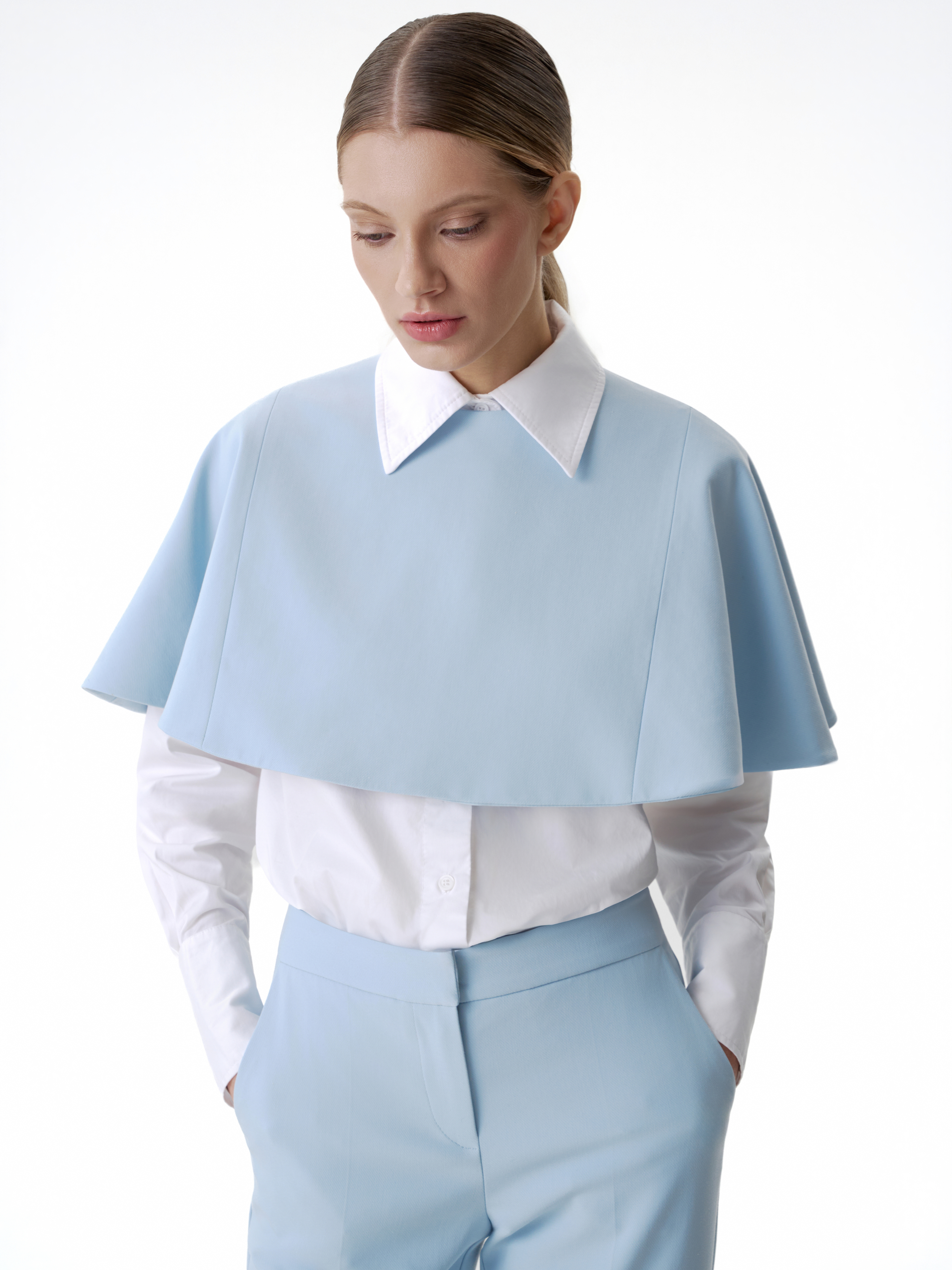 Застежка на потайные кнопки расположена сзади, благодаря чему перед остается лаконичным. Горжетку можно носить поверх жакета в тон, усиливая многослойность комплекта, или как самостоятельный акцент в образе.