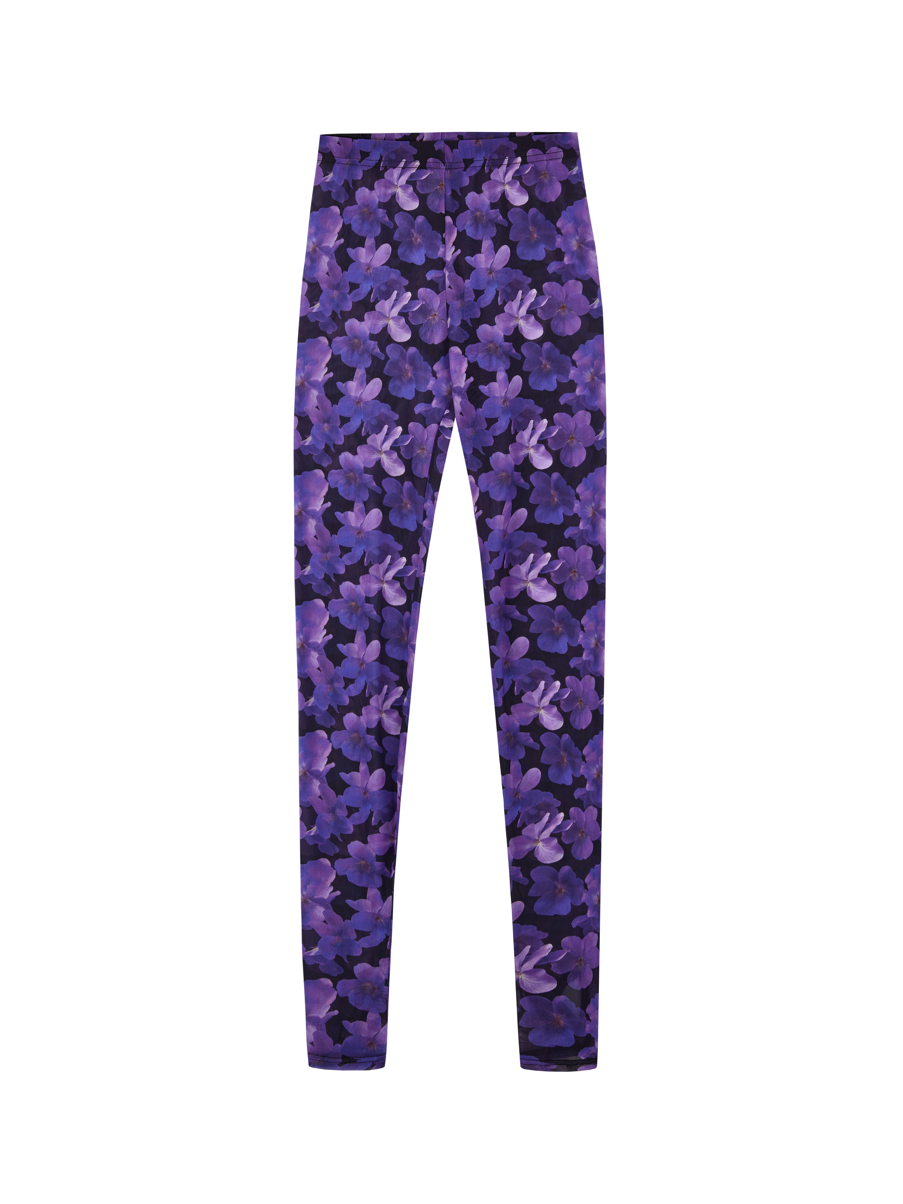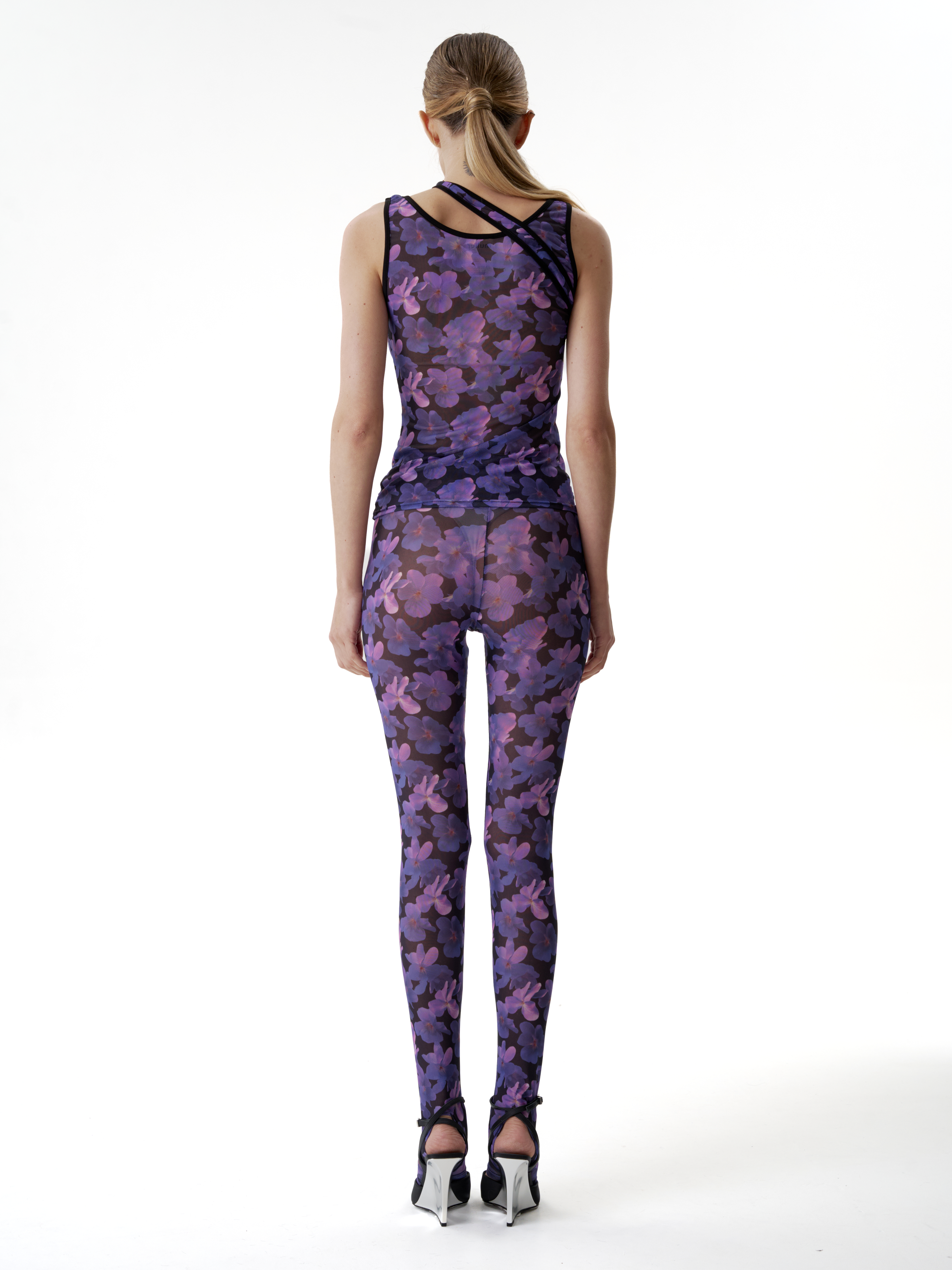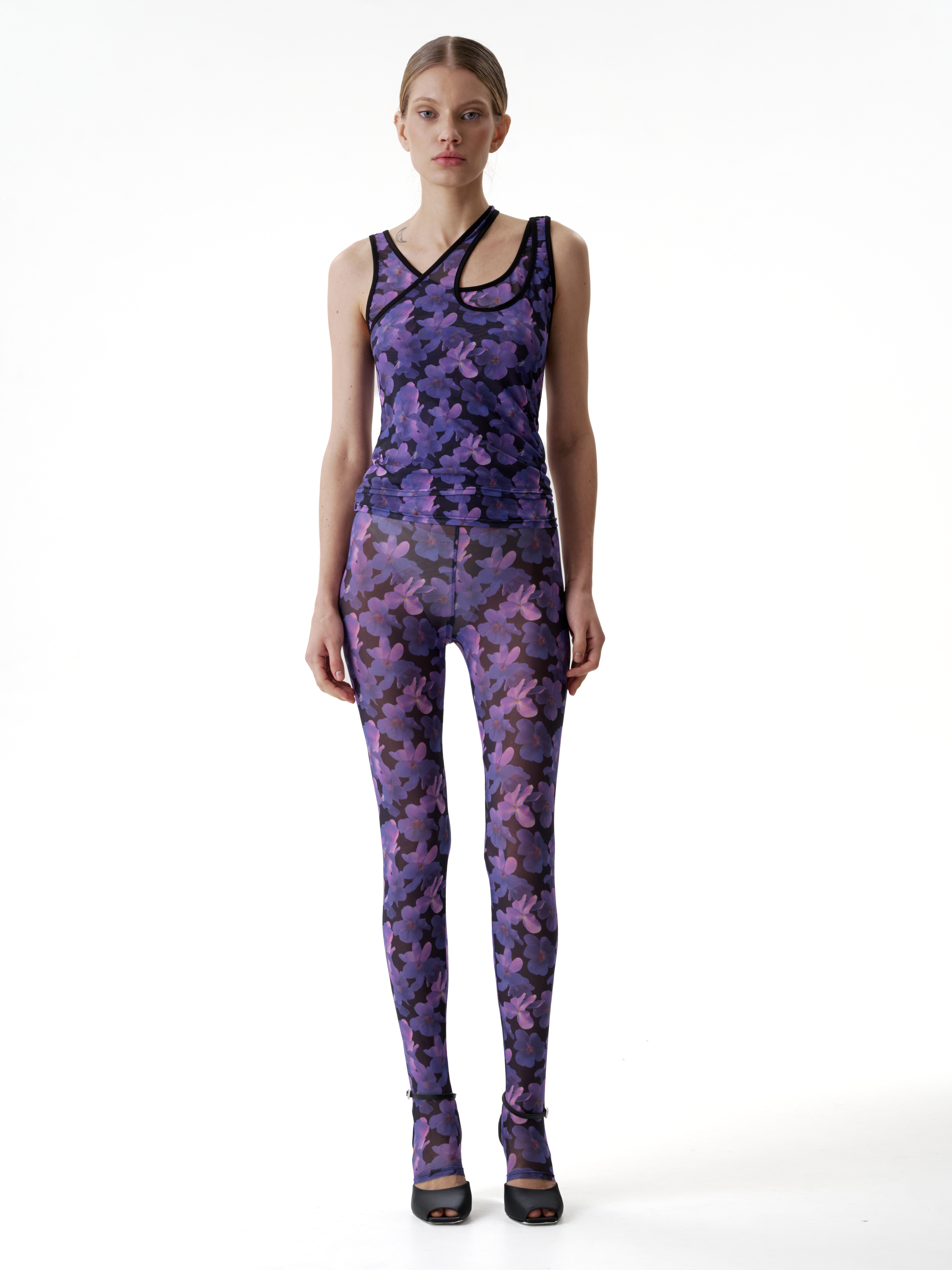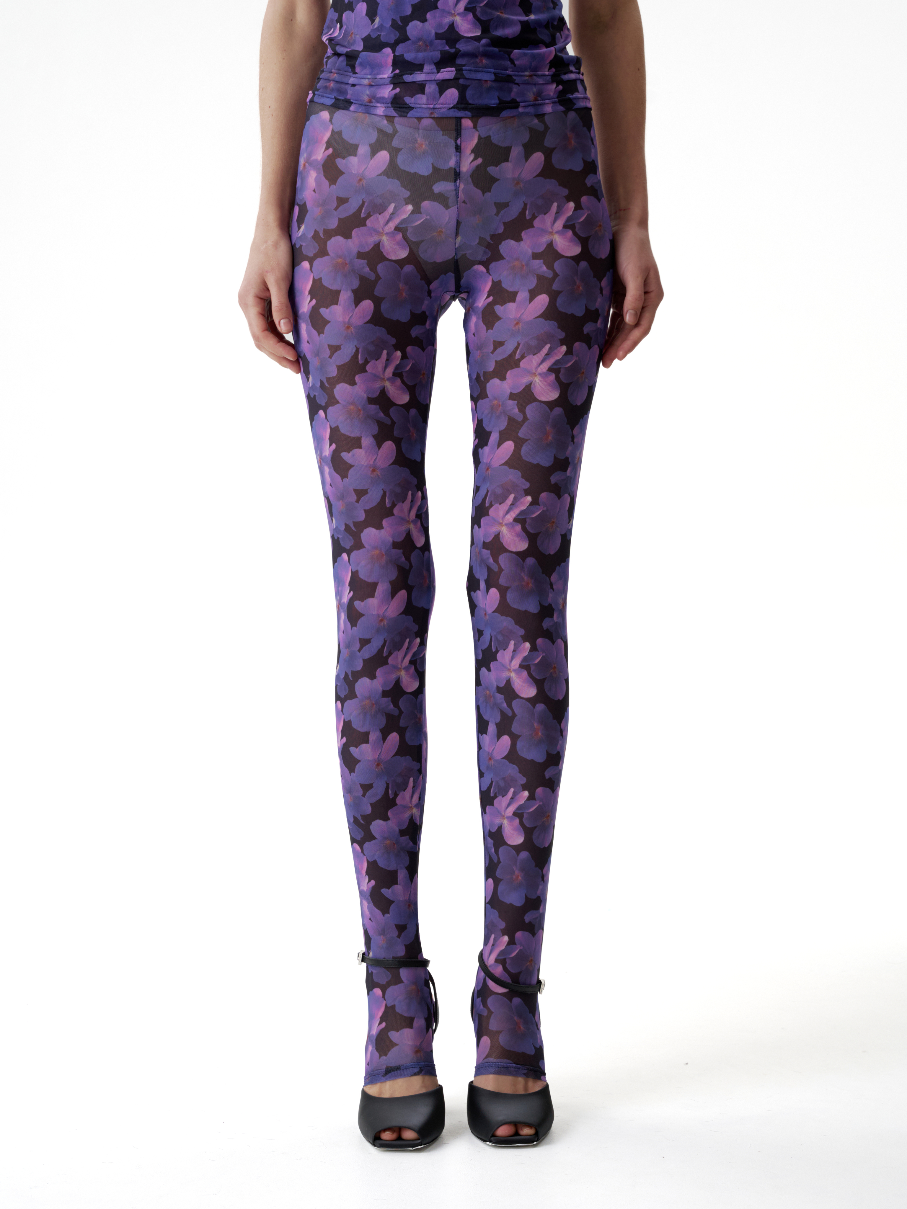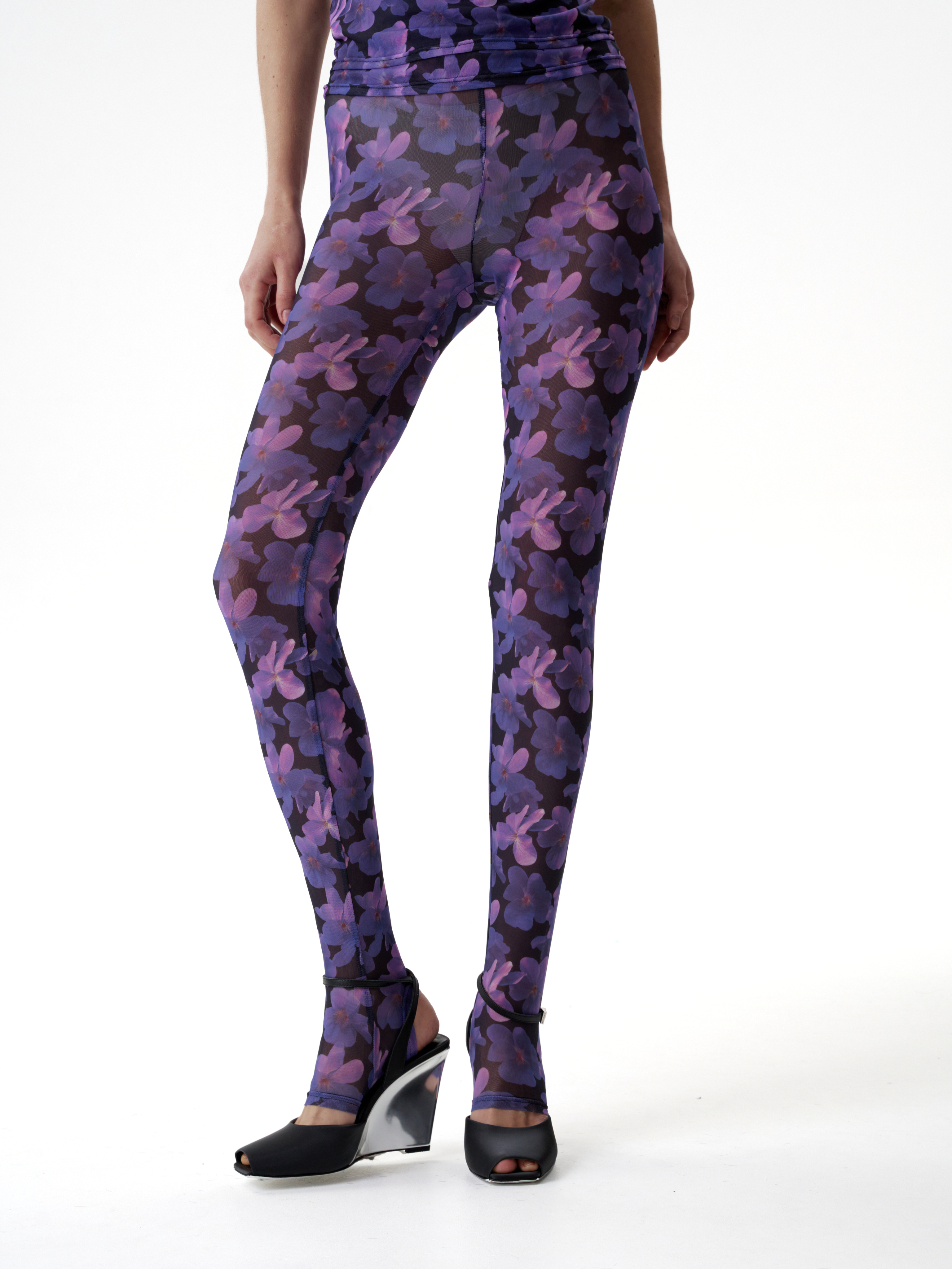Леггинсы выполнены из мягкой эластичной сетки с авторским принтом фиалок. Оттенки сиреневого и насыщенного фиолетового создают эффект глубины: цветы словно наслаиваются друг на друга, оживая в движении и подчеркивая пластику силуэта.