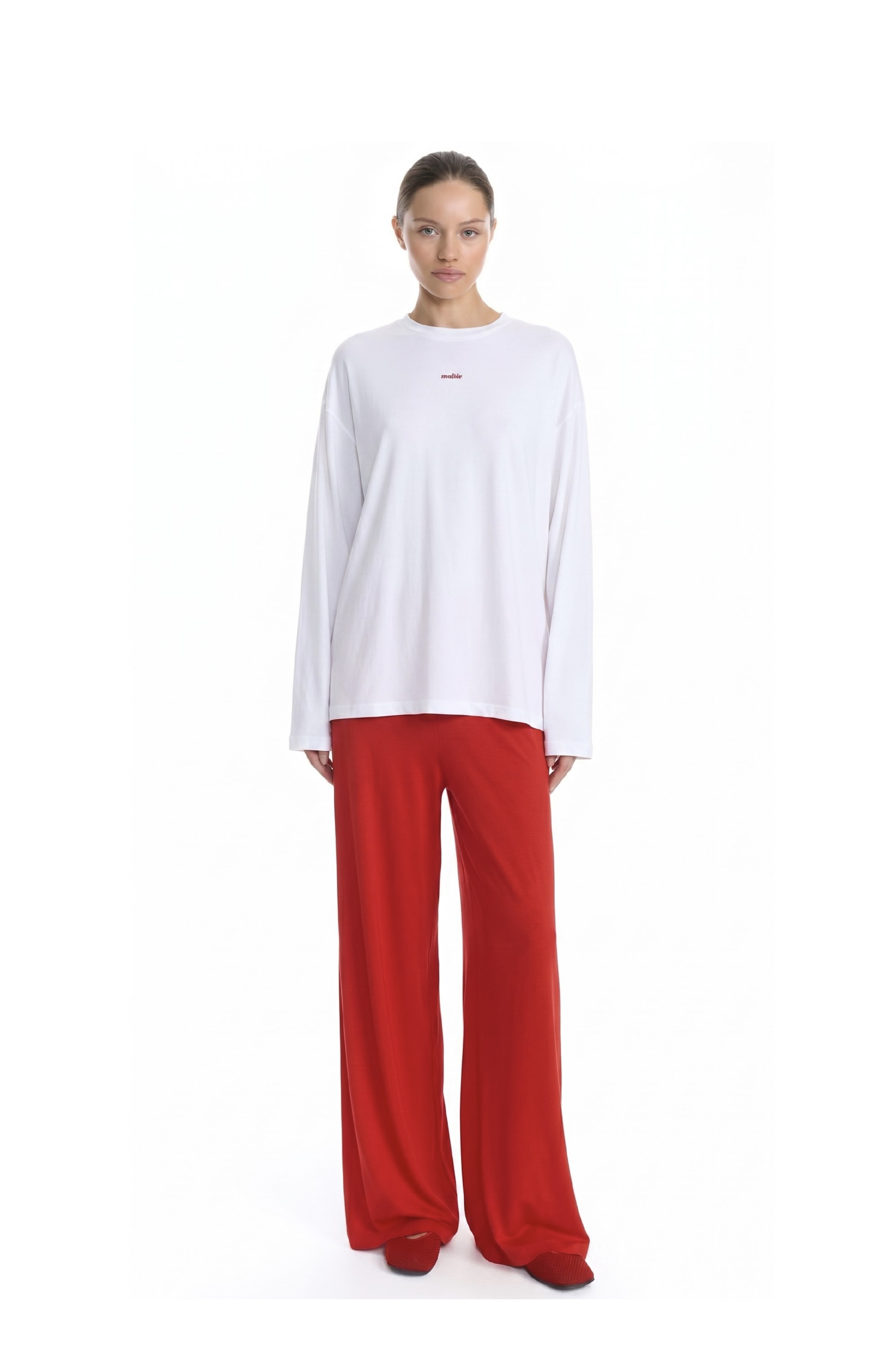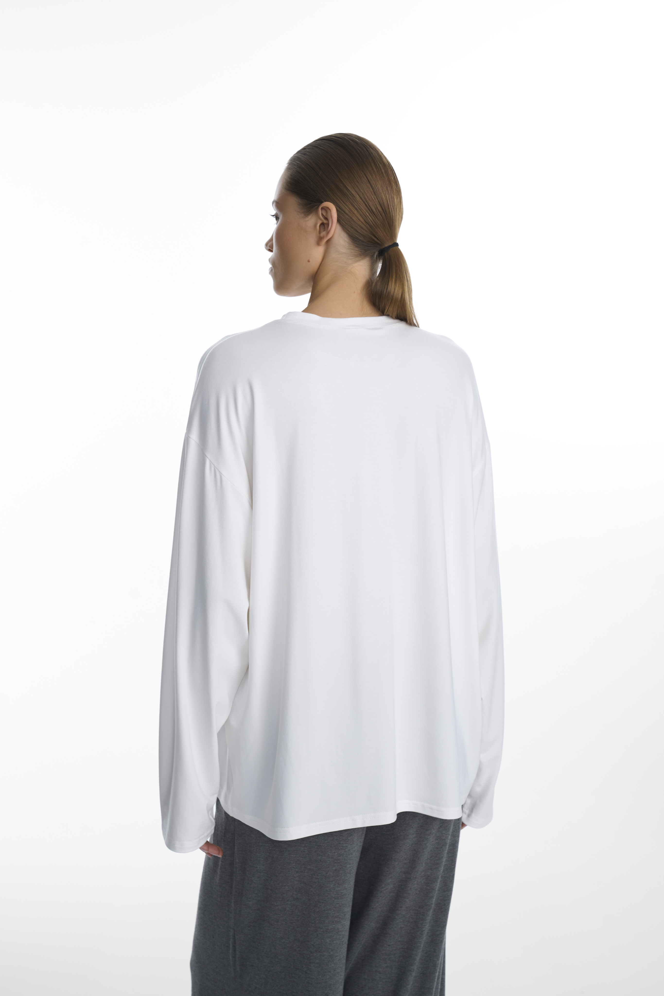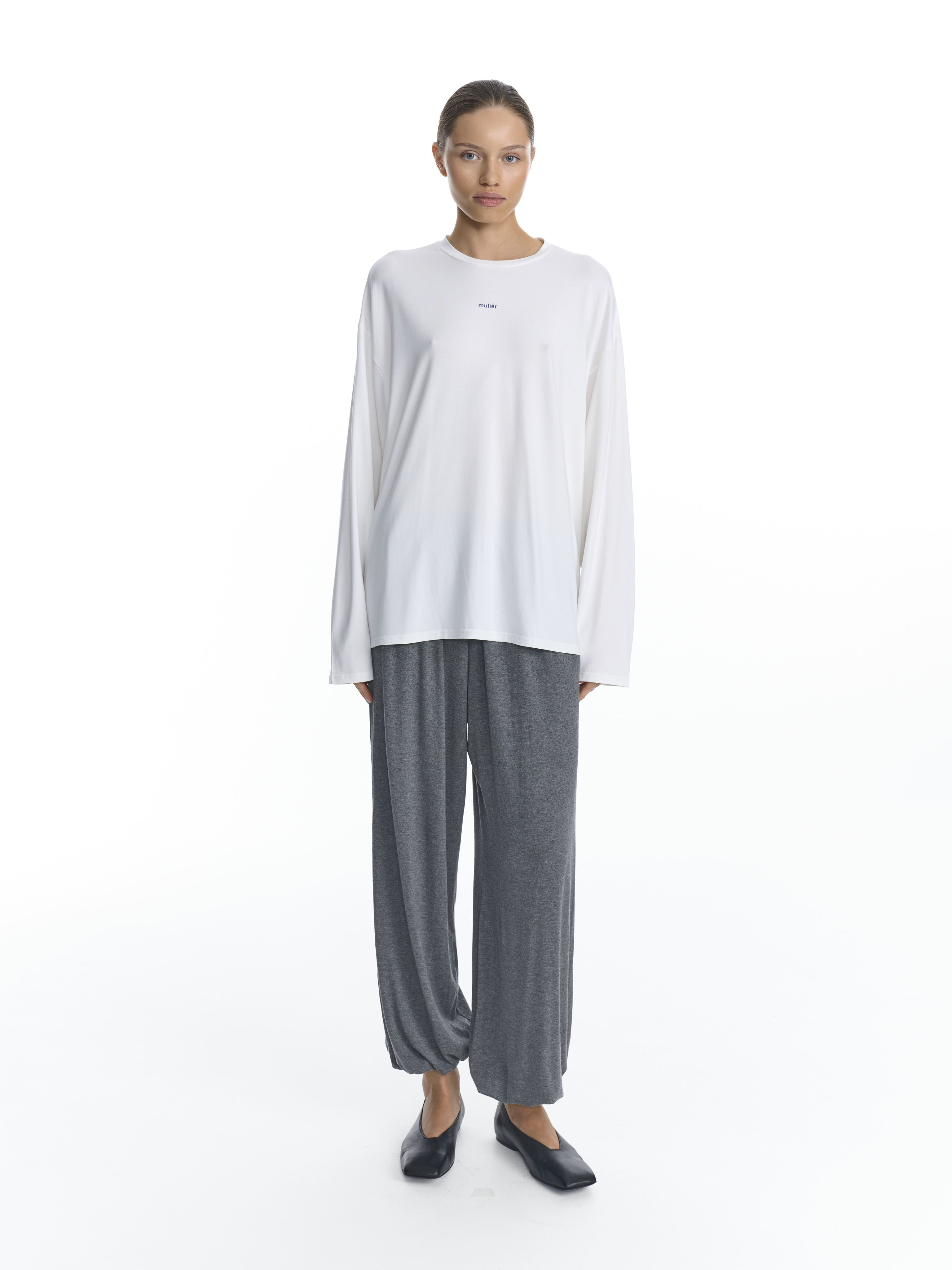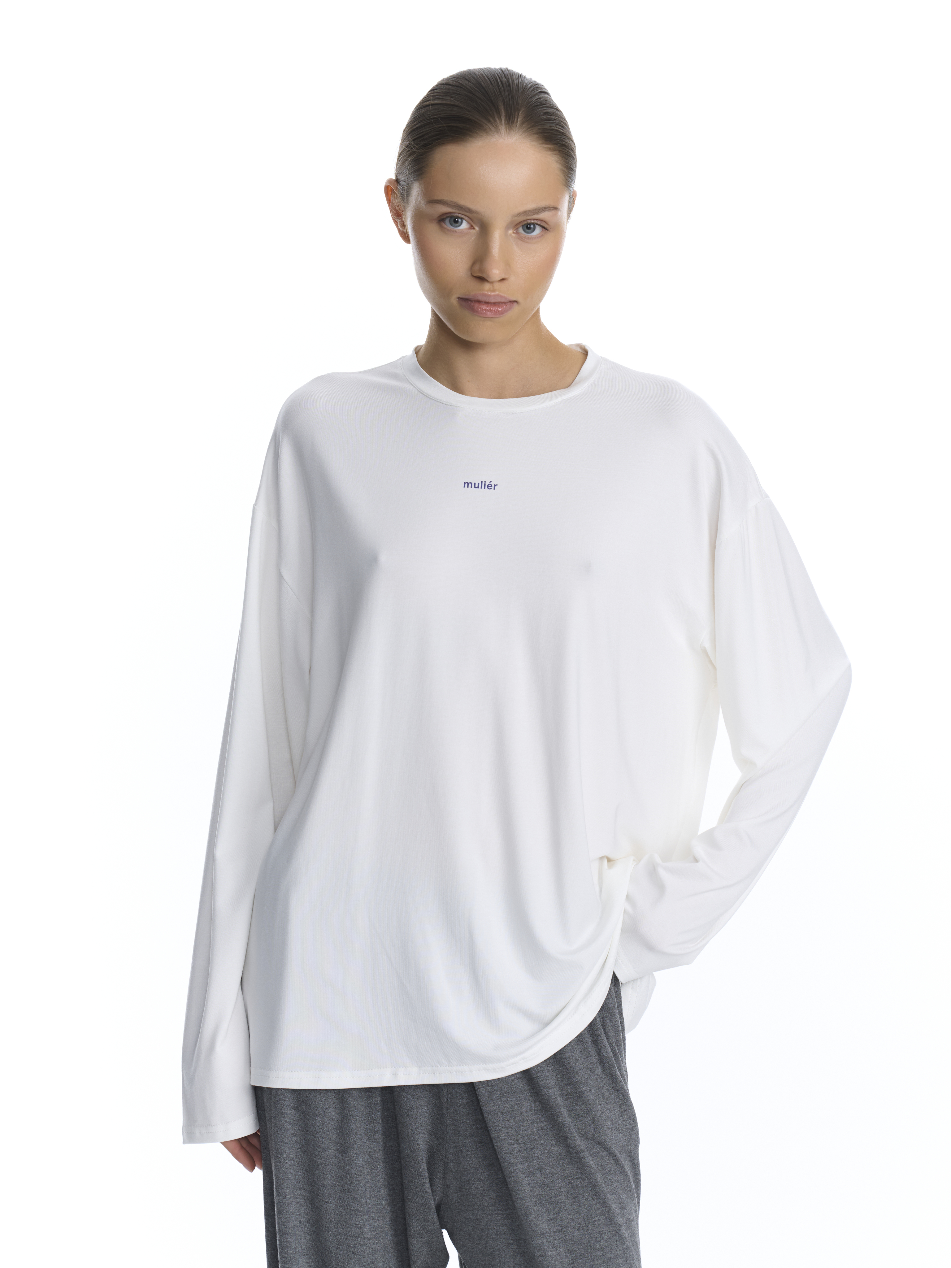 Лонгслив выполнен из тонкого вискозного трикотажа – тактильно приятного материала, который мягко драпируется и сохраняет форму в течение дня. Свободный силуэт с спущенной линией плеча подойдет любому типу фигуры, не сковывая движений. Минималистичный принт «muliér» под горловиной выступает в роли тонкого фирменного кода — он заметен лишь при внимательном рассмотрении, сохраняя чистоту линий и не нарушая целостности образа.