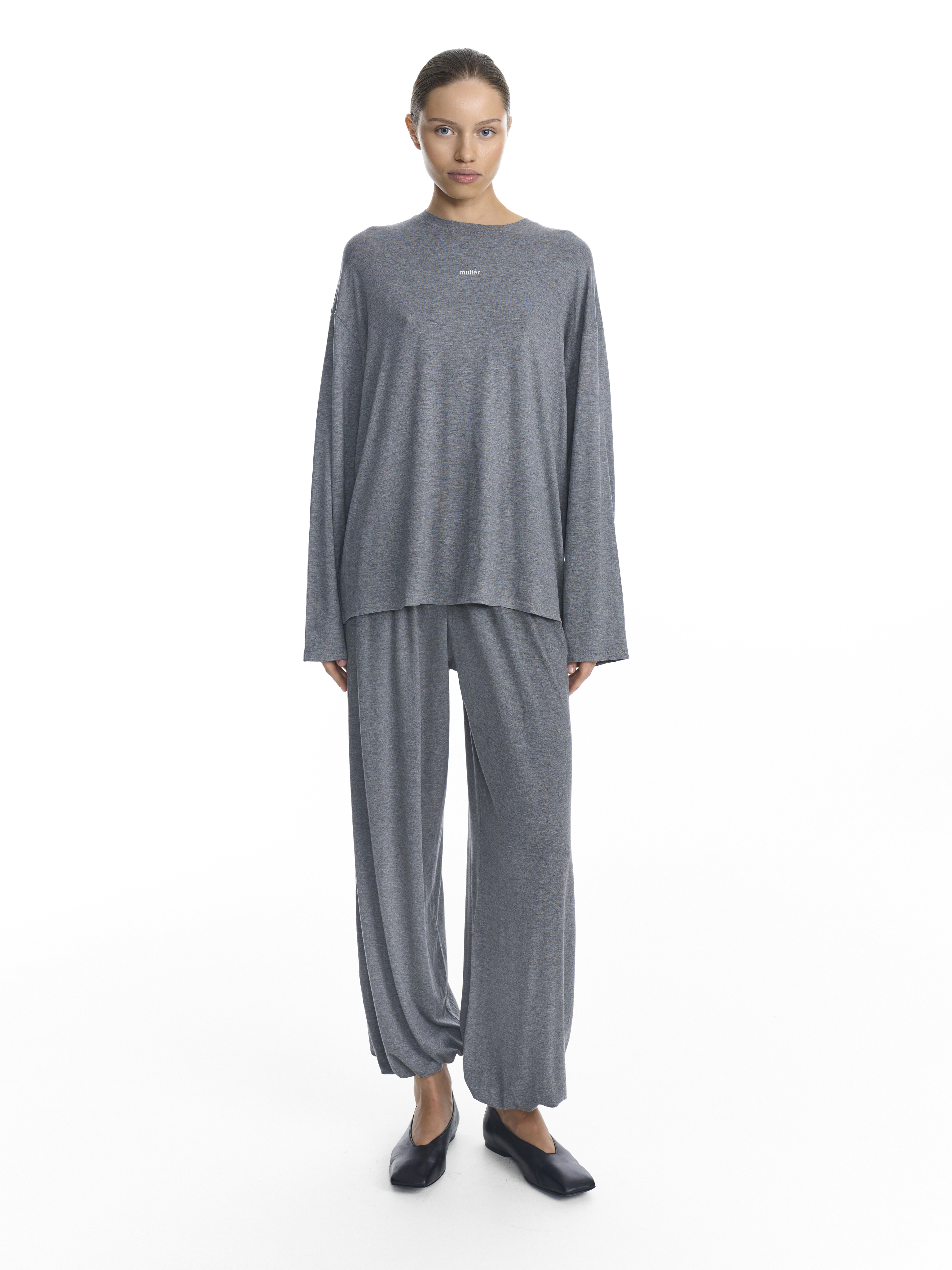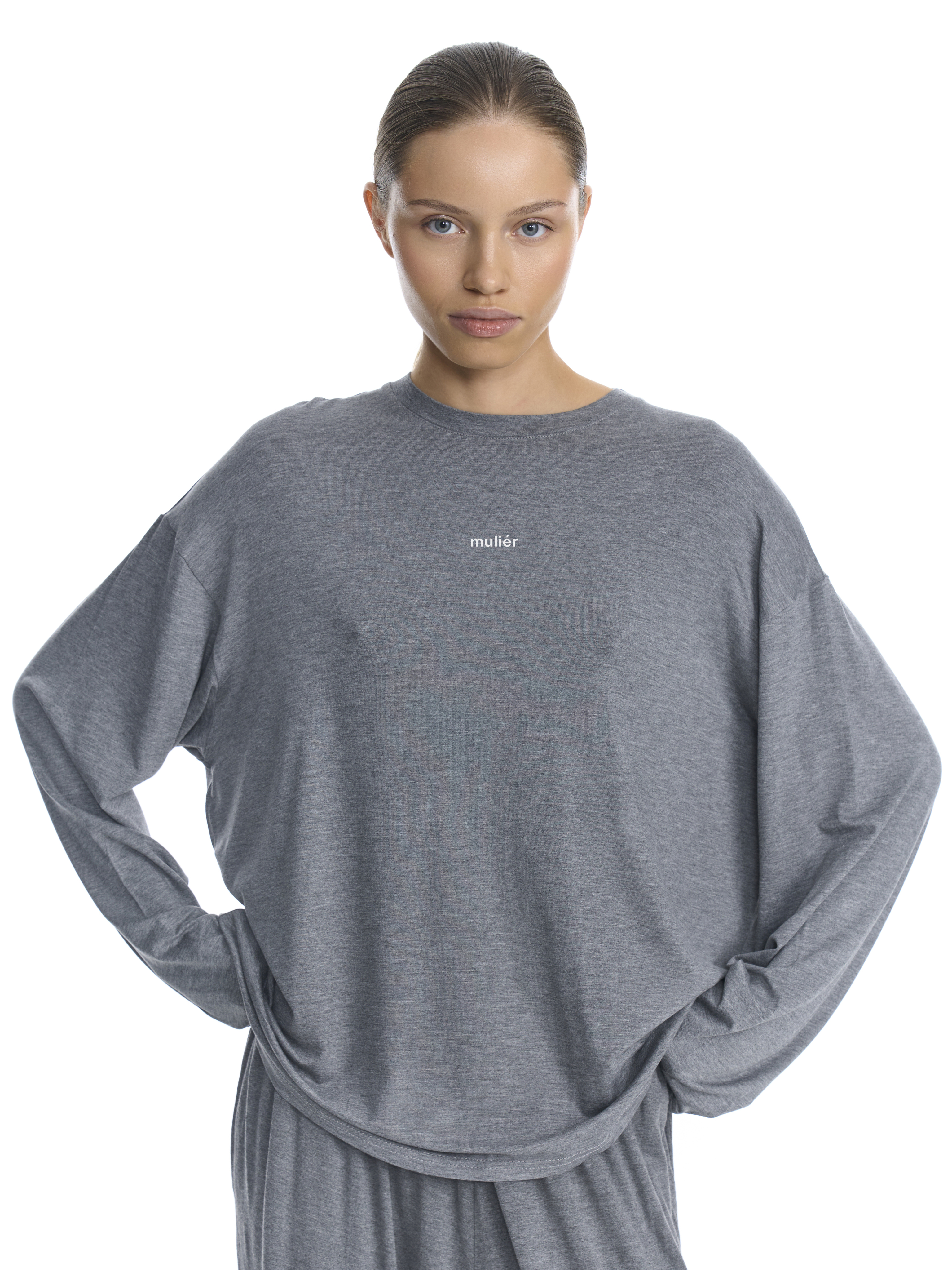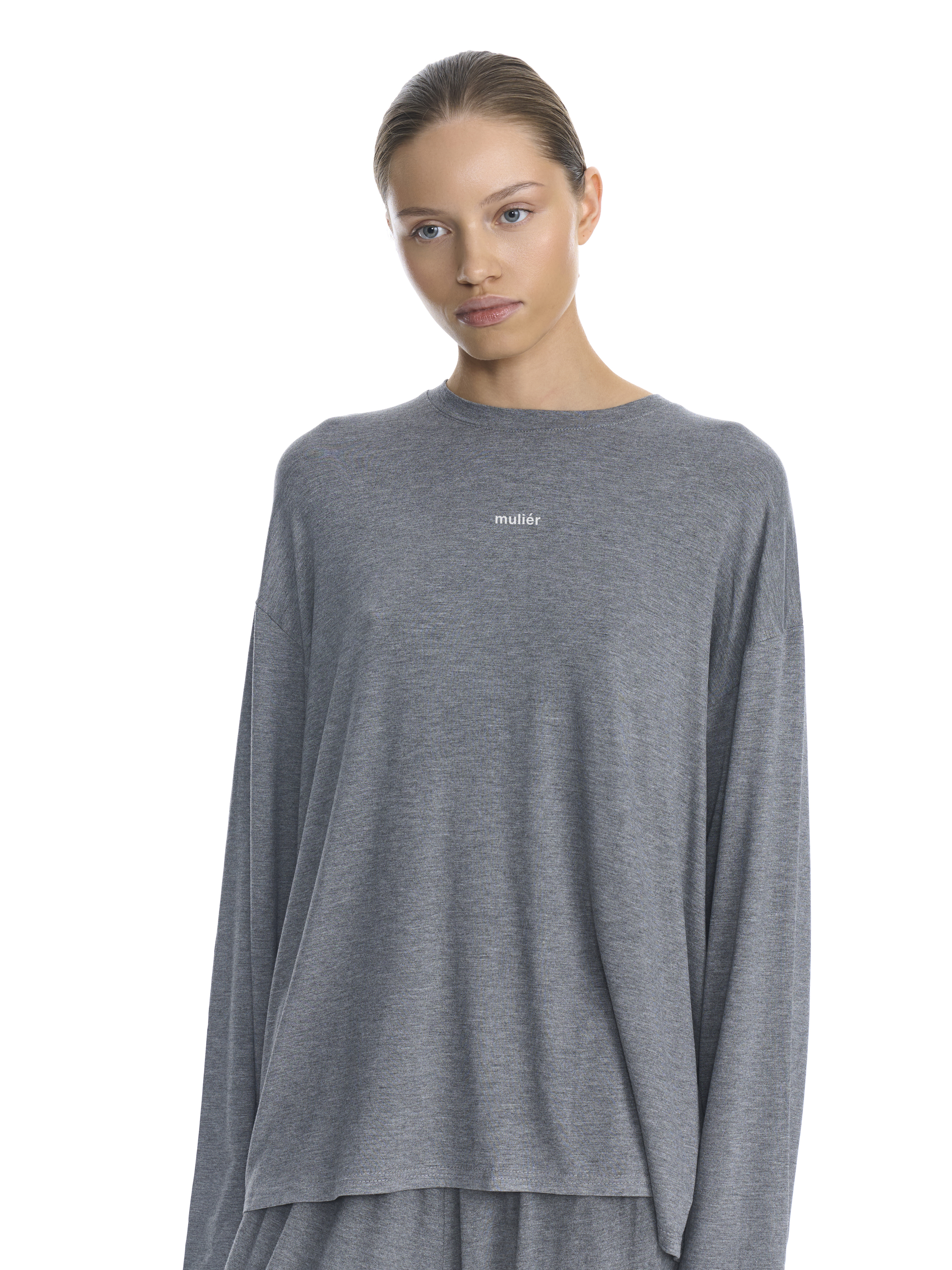 Лонгслив выполнен из тонкого меланжевого трикотажа — тактильно приятного материала, который мягко драпируется и сохраняет форму в течение дня. Свободный силуэт с спущенной линией плеча подойдет любому типу фигуры, не сковывая движений. Минималистичный принт «muliér» под горловиной выступает в роли тонкого фирменного кода — он заметен лишь при внимательном рассмотрении, сохраняя чистоту линий и не нарушая целостности образа.