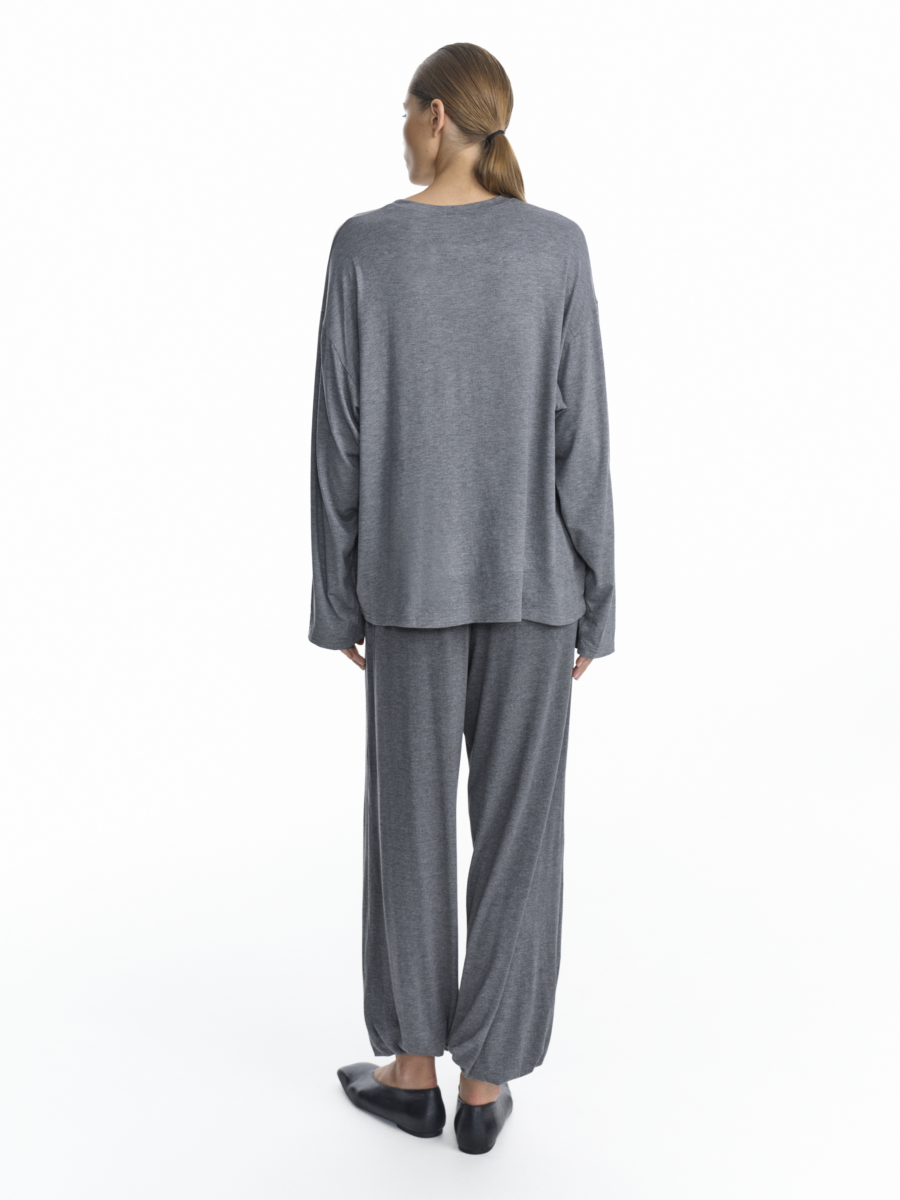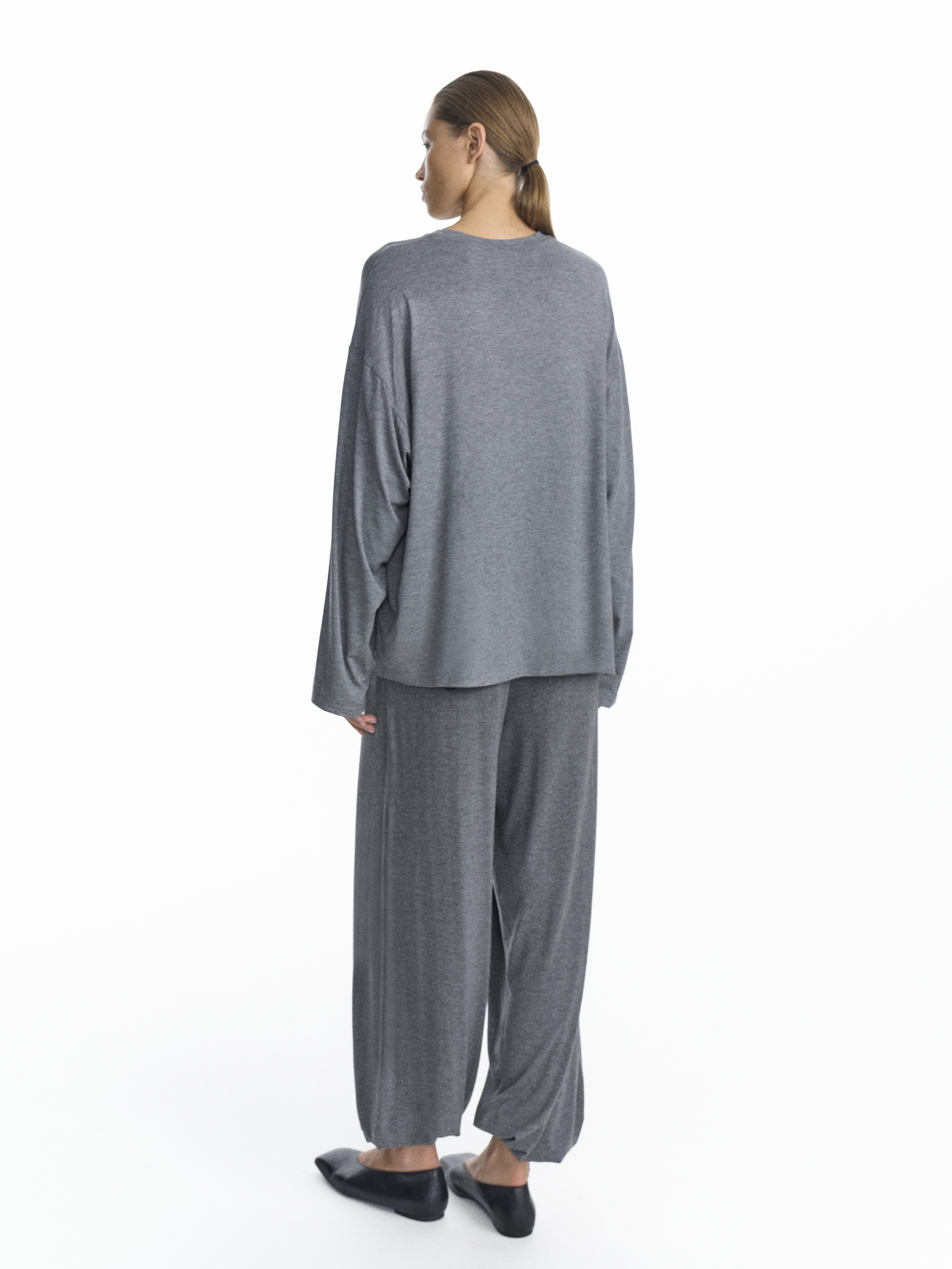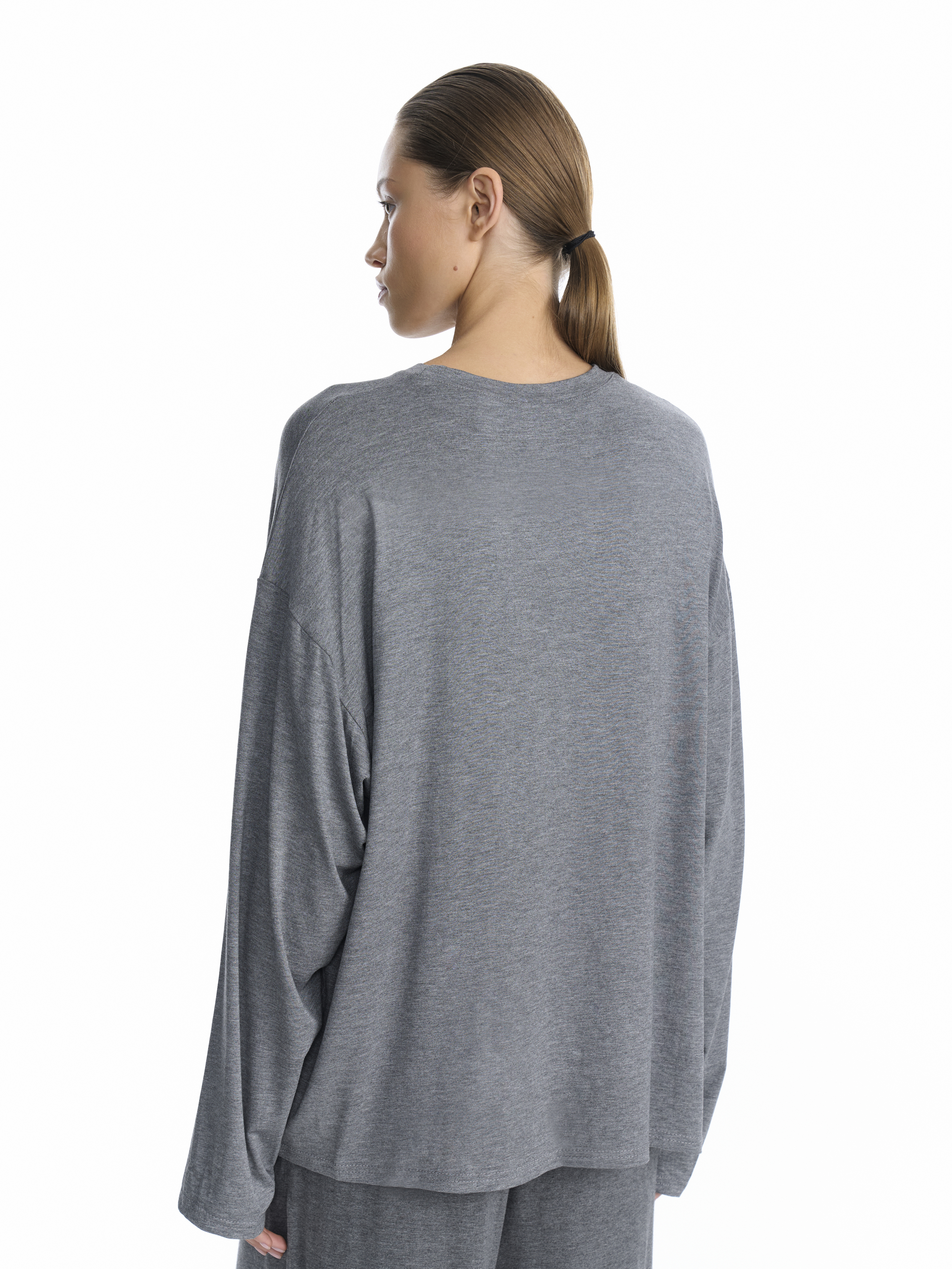 Лонгслив выполнен из тонкого меланжевого трикотажа — тактильно приятного материала, который мягко драпируется и сохраняет форму в течение дня. Свободный силуэт с спущенной линией плеча подойдет любому типу фигуры, не сковывая движений. Минималистичный принт «muliér» под горловиной выступает в роли тонкого фирменного кода — он заметен лишь при внимательном рассмотрении, сохраняя чистоту линий и не нарушая целостности образа.