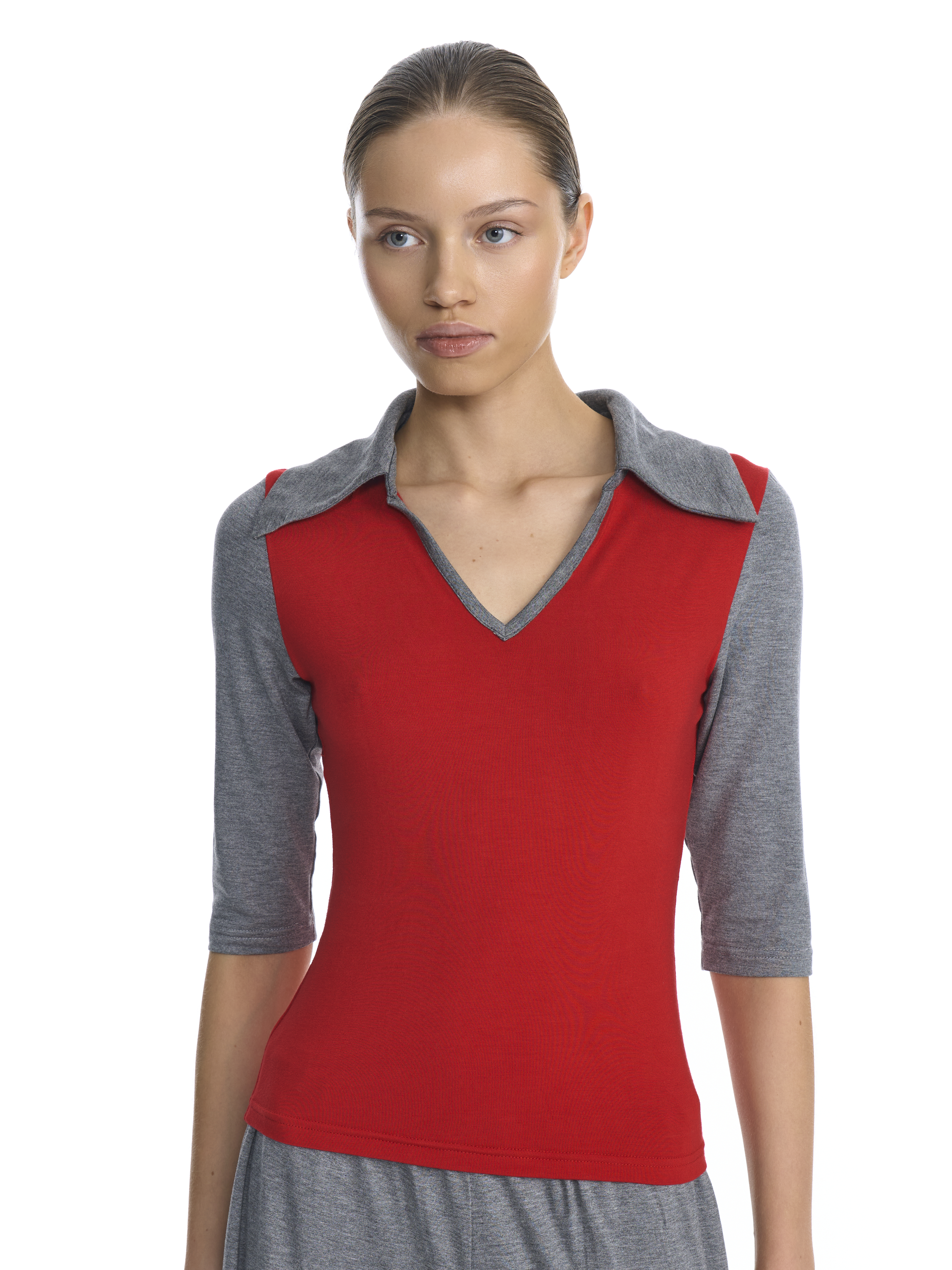 Лонгслив‑поло приталенного силуэта выполнен из мягкого трикотажа. Контрастные рукава 3/4 создают выразительный визуальный акцент: четкая граница цветов подчеркивает геометрию кроя. Отложной воротник сохраняет узнаваемые черты поло с акцентом на чистоту линий. Фигурный вырез деликатно подчеркивает линию декольте, не нарушая общей сдержанности образа.