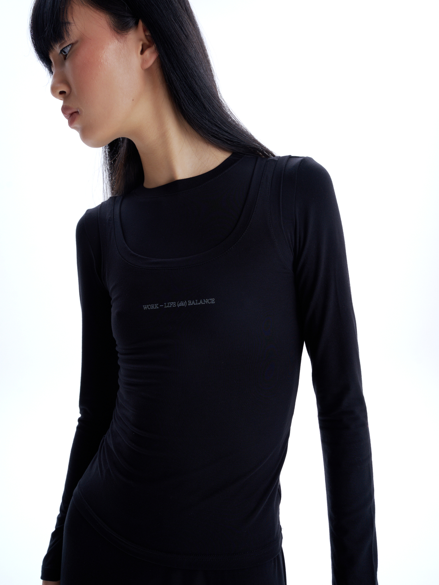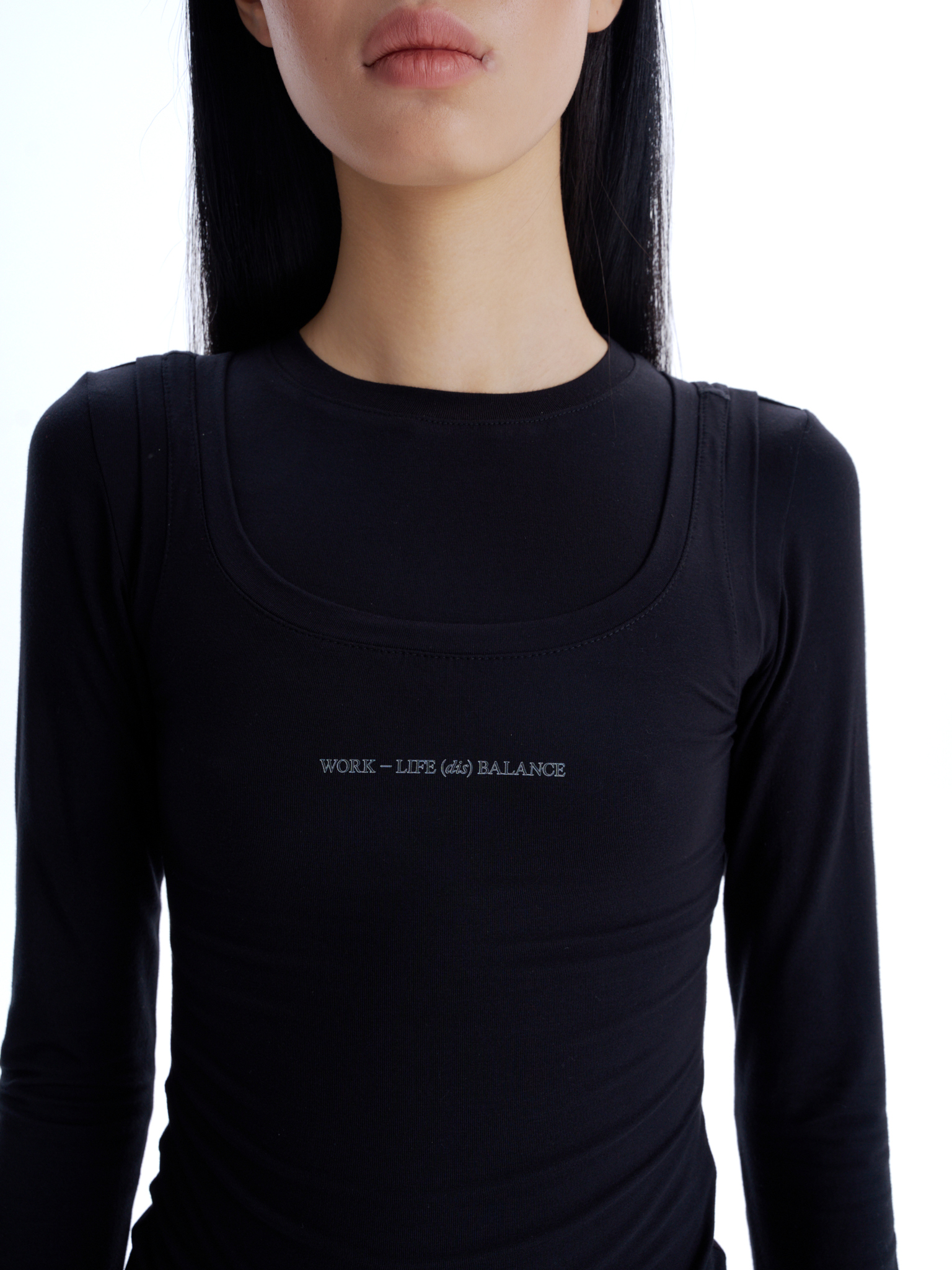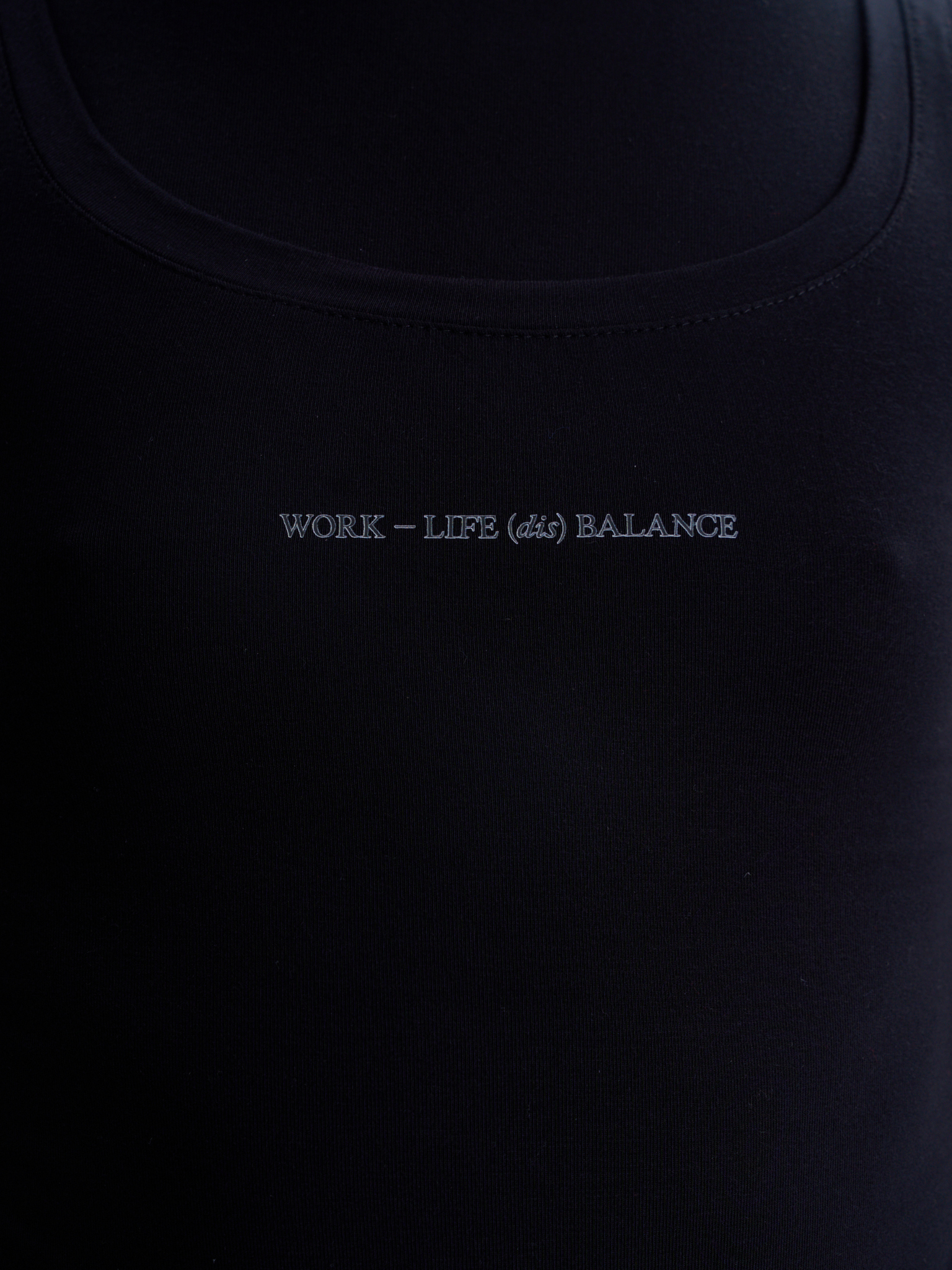Майка выполнена из тонкого трикотажа. Имеет приталенный силуэт, широкие бретели и принт "WORK-LIFE (dis) BALANCE" на груди.