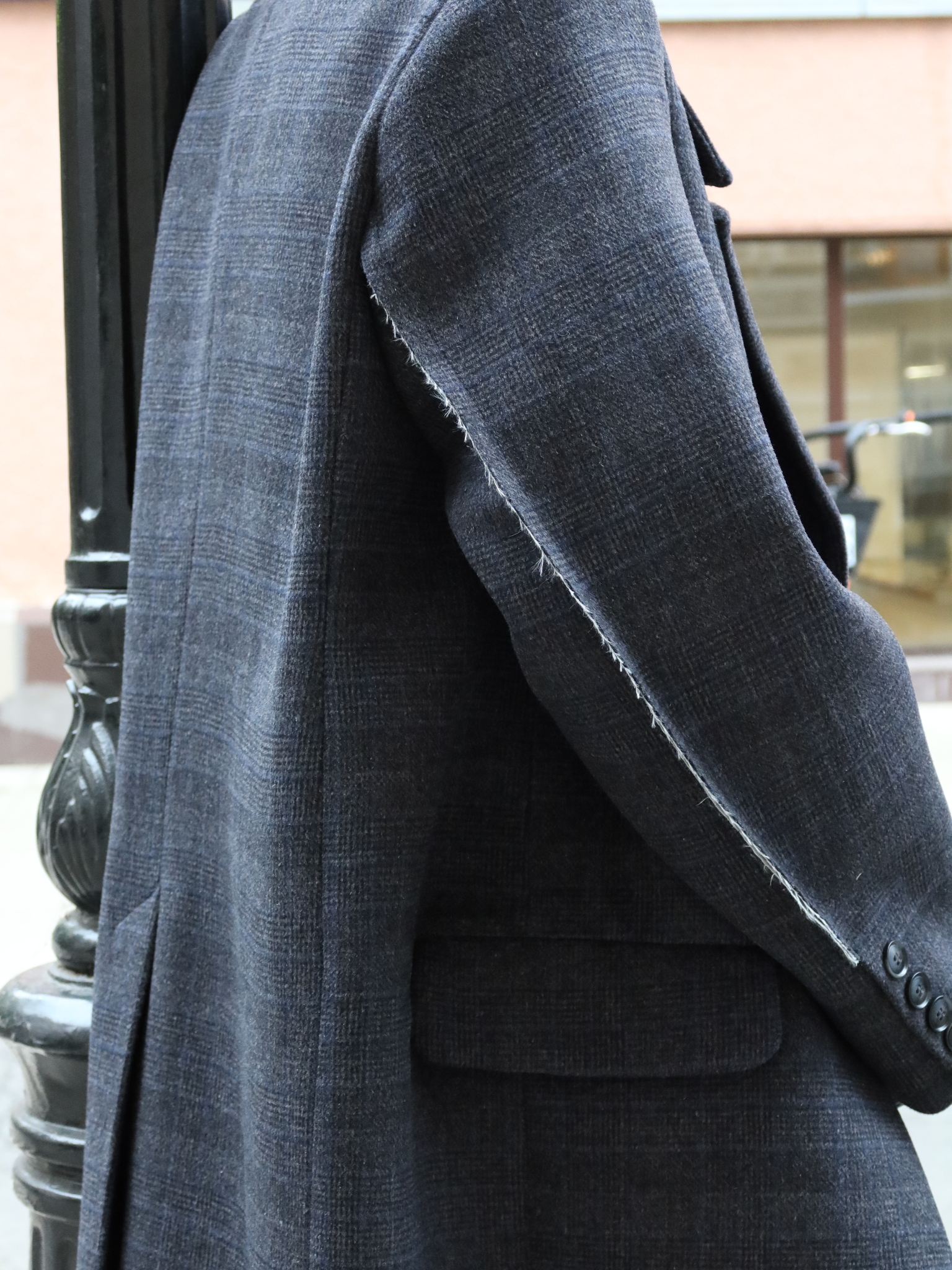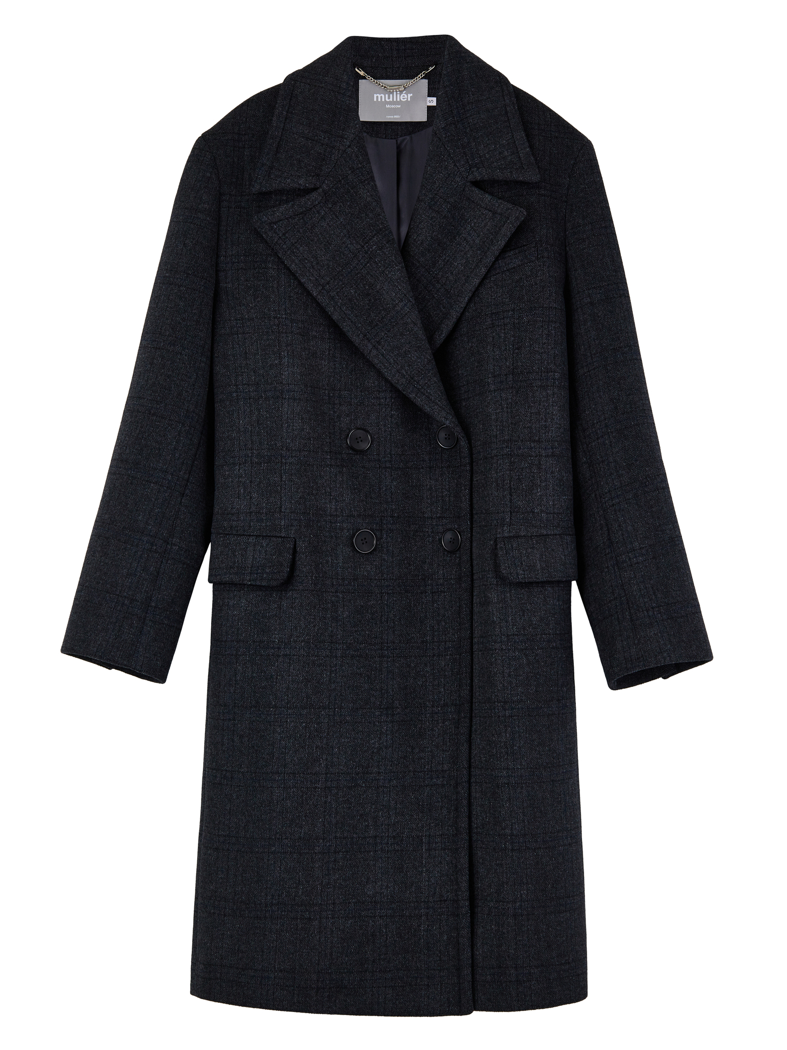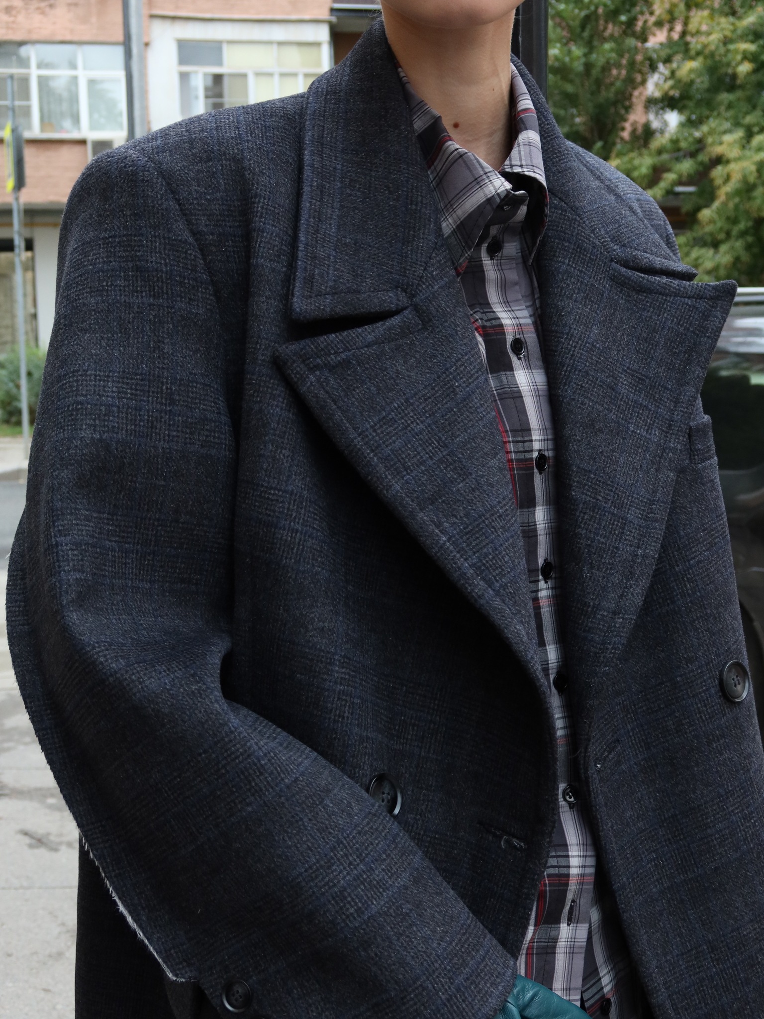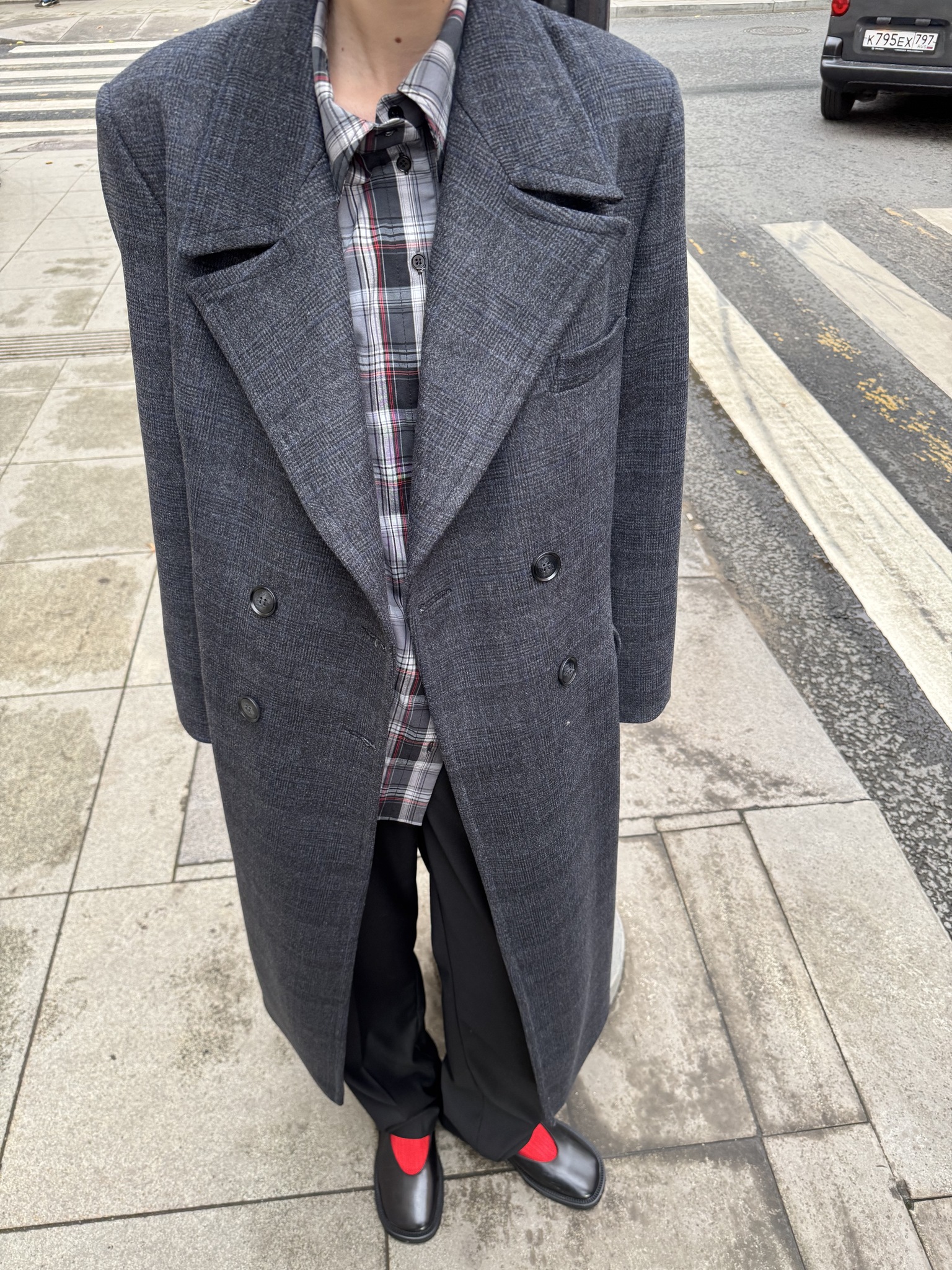 Двубортное пальто свободного силуэта серое в деликатную клетку. На задней стороне рукавов — фирменные открытые срезы нашего бренда. Отстрочка по воротнику. Сзади — увеличенная шлица для комфортной походки, застегивается на две внешние пуговицы и одну внутри для ровной посадки. Пальто выполнено из премиальной шерсти, согреет в осеннюю погоду и прослужит не один сезон за счет универсального кроя и качественного материала, а уникальные дизайнерские элементы на воротнике и рукавах придадут даже самому повседневному образу яркие акценты.