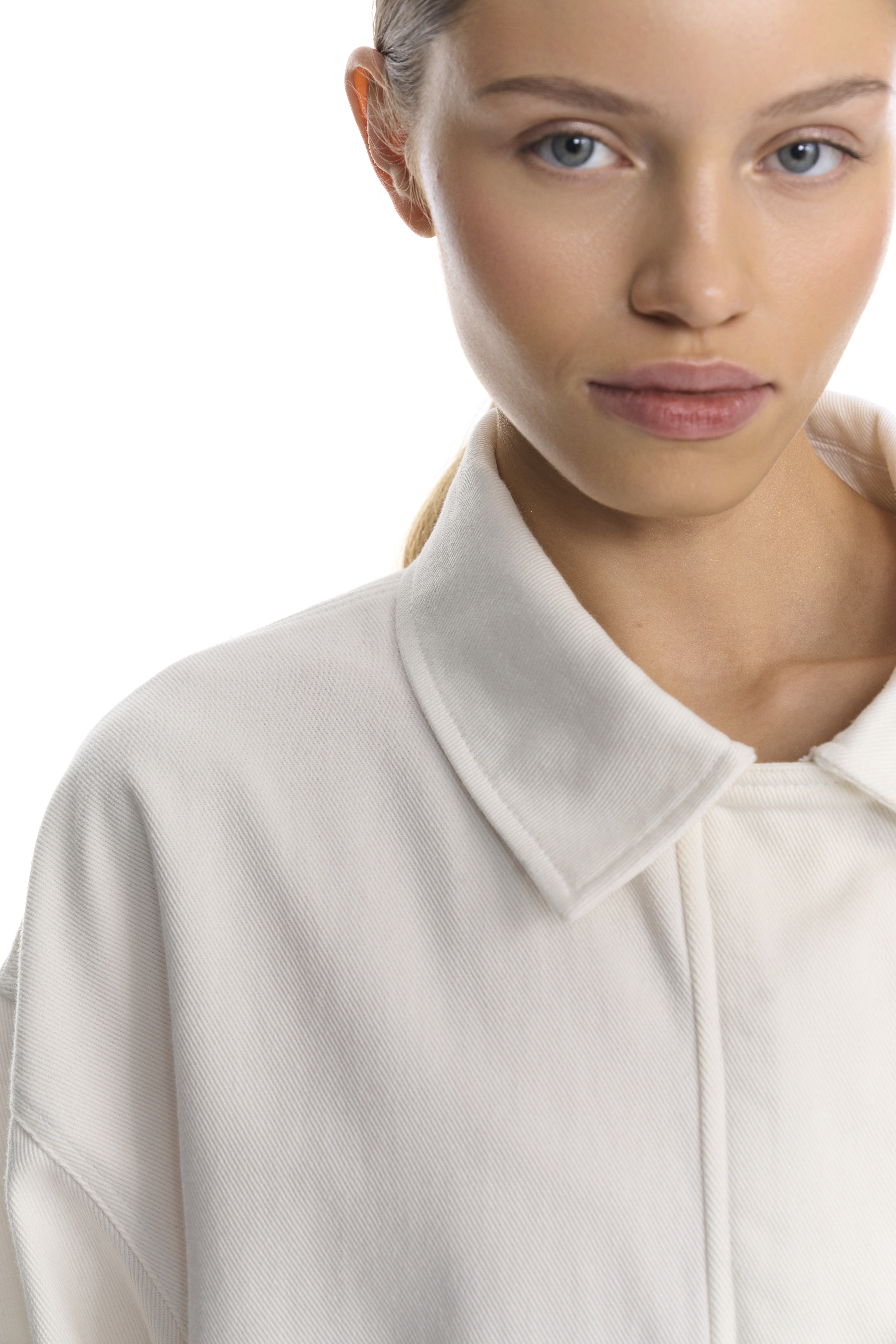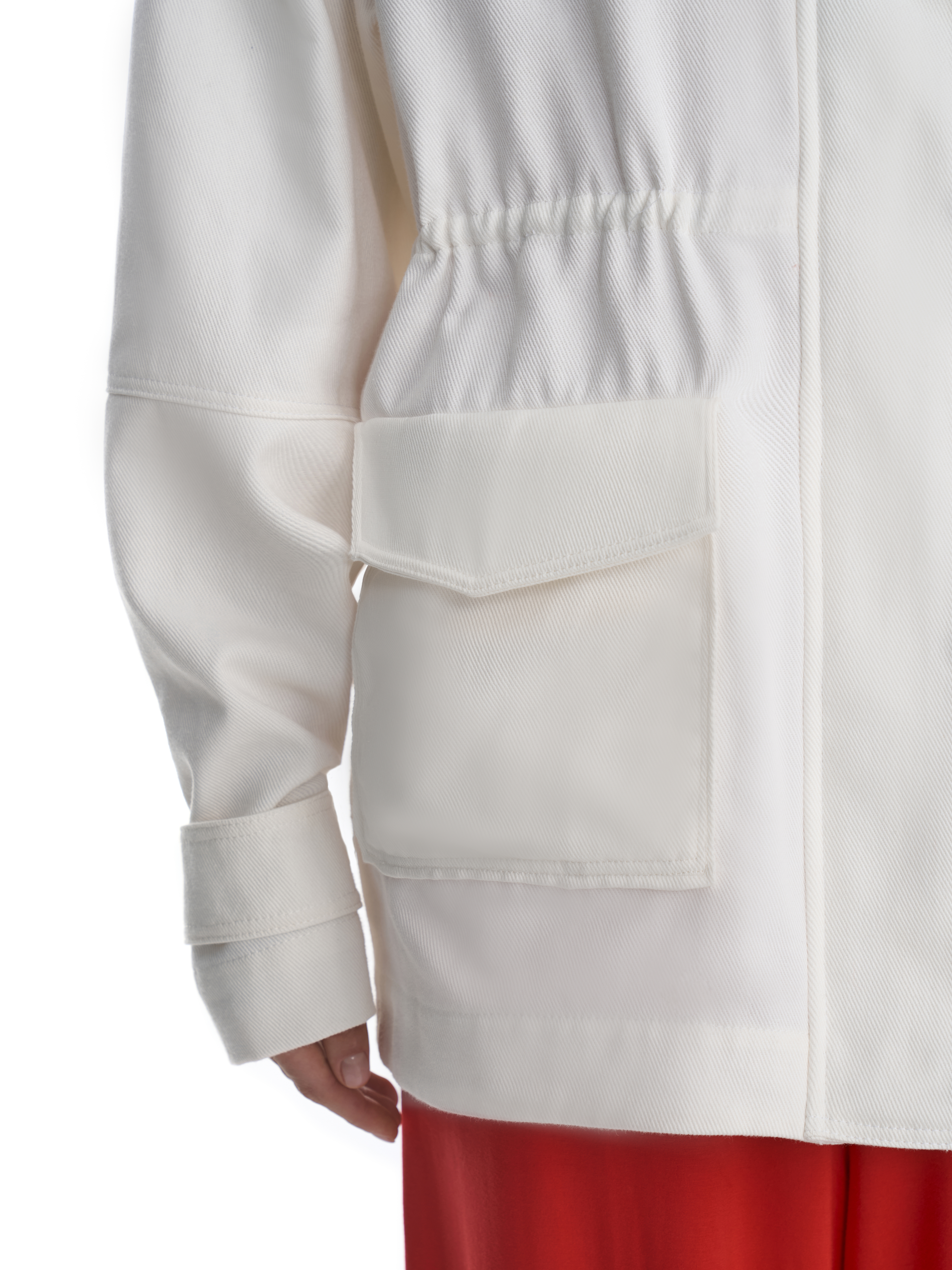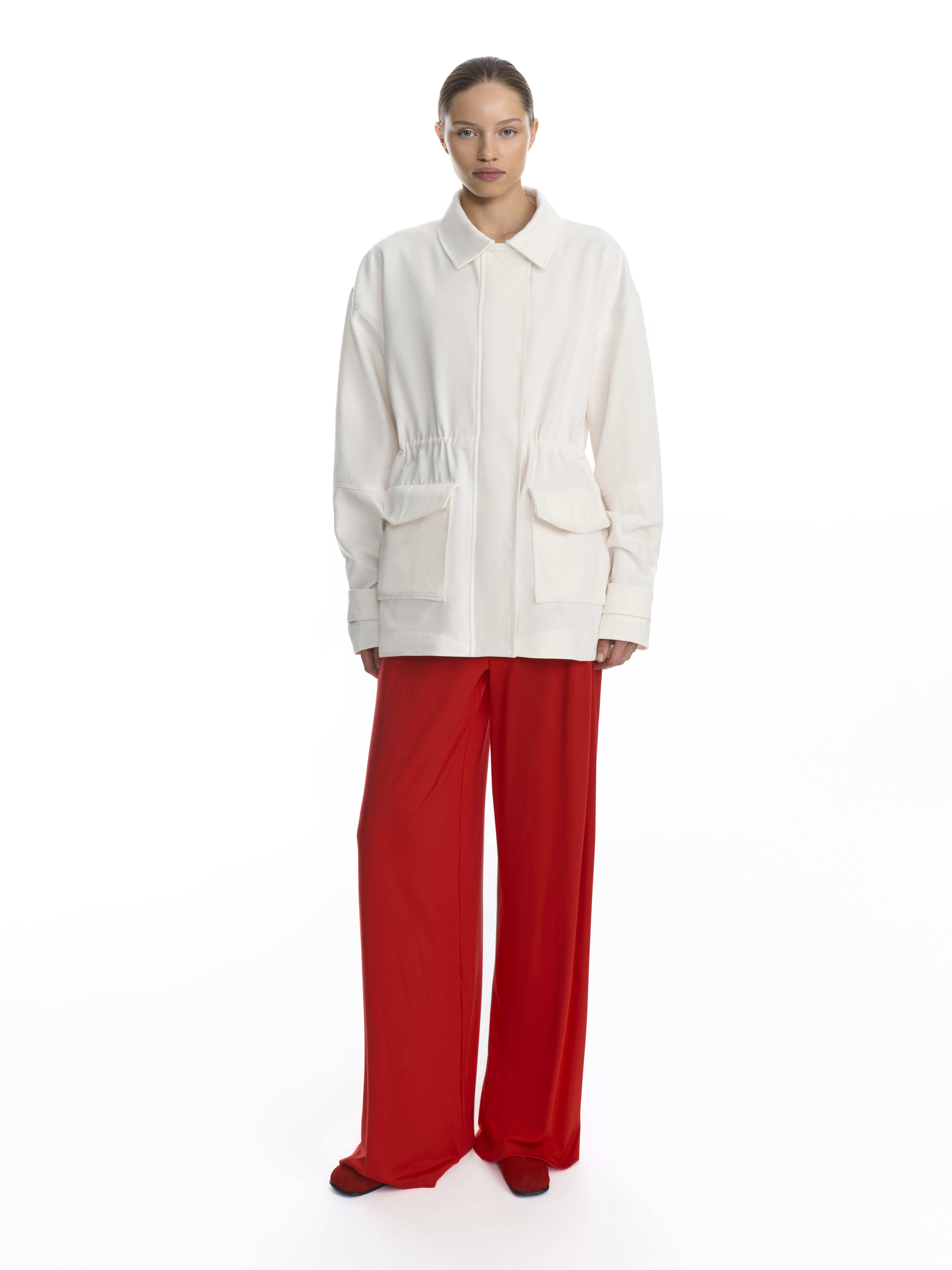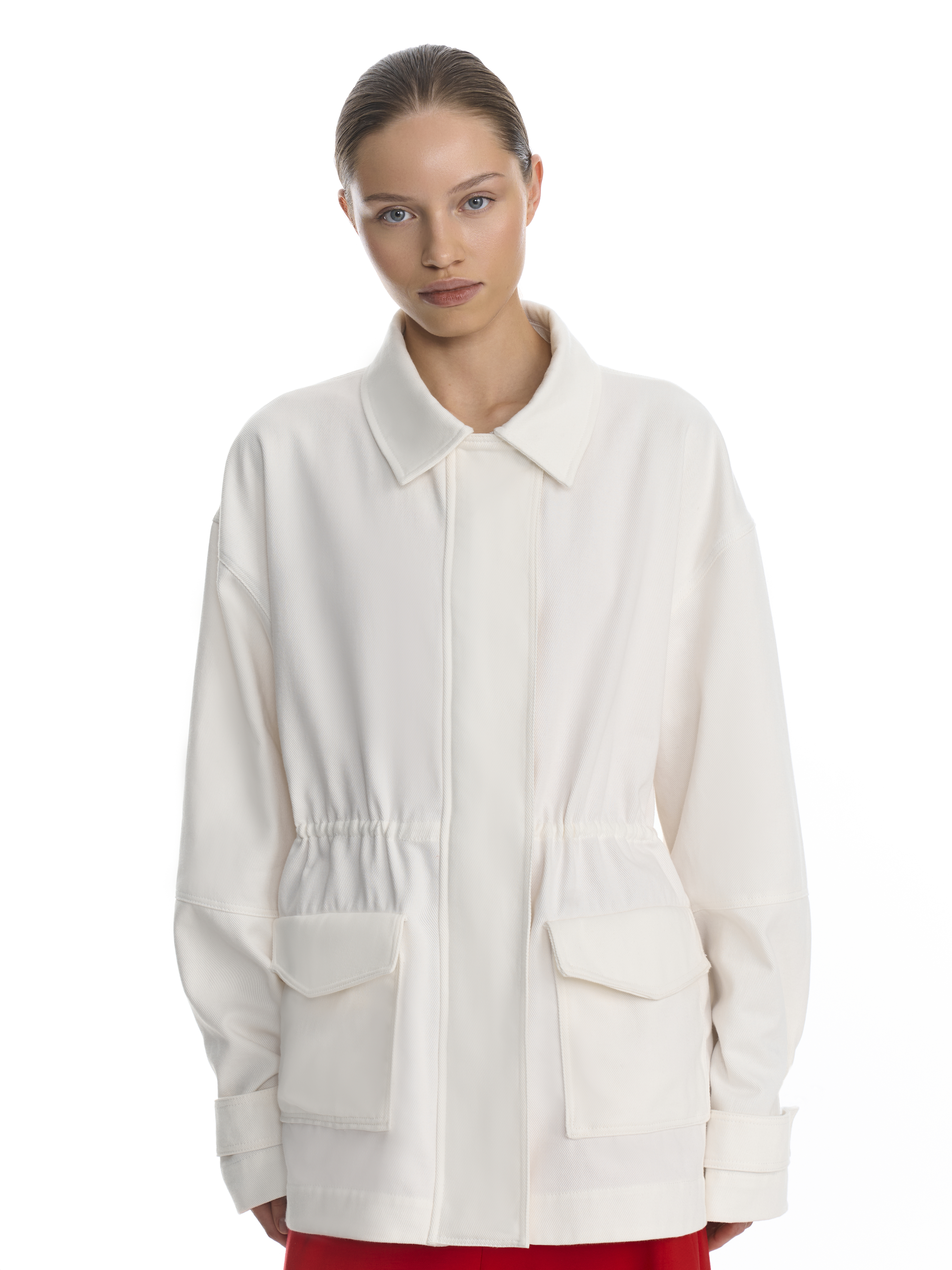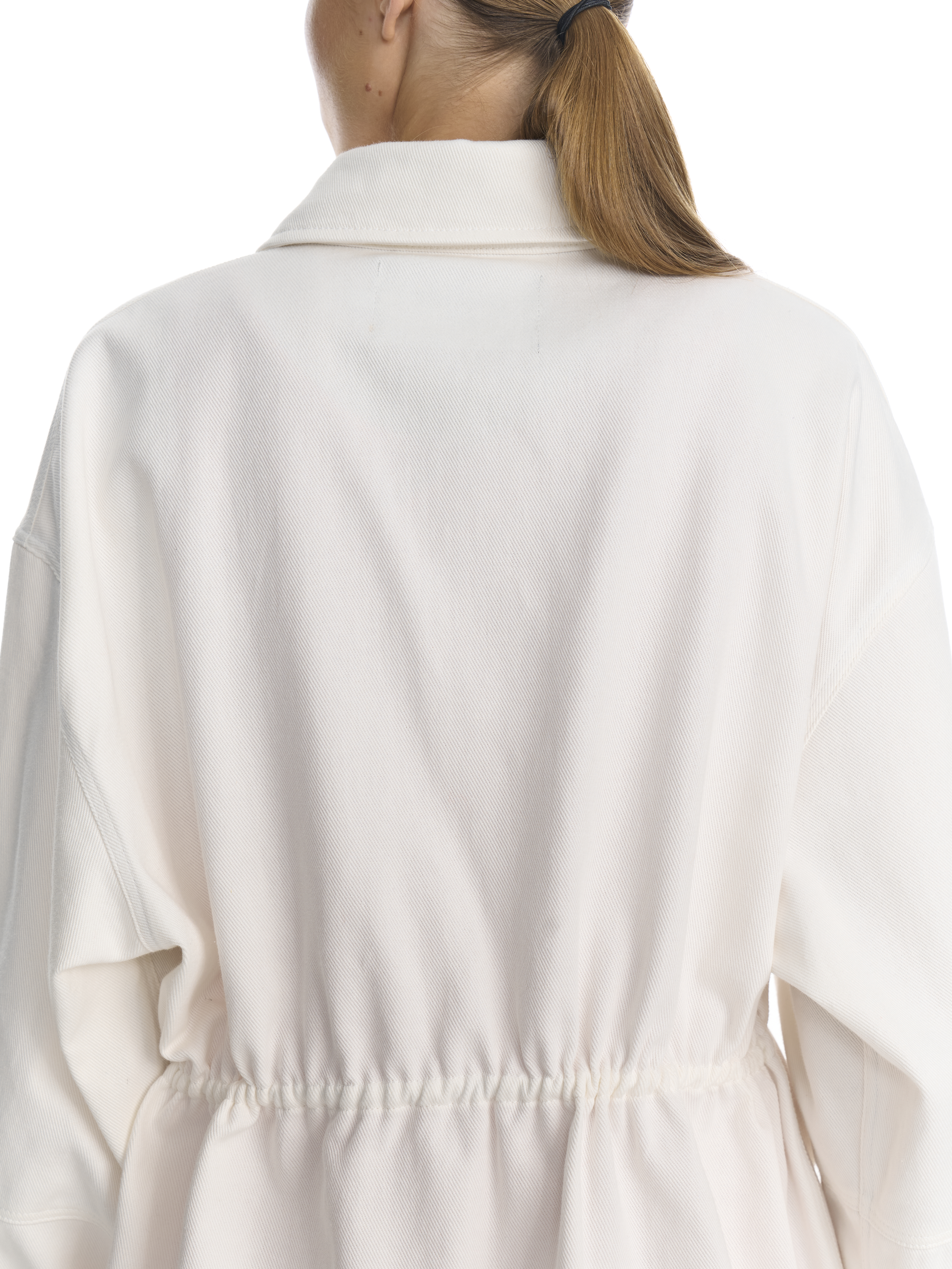 Парка свободного силуэта выполнена из белой 100 % хлопковой джинсовой ткани — материал держит форму, оставаясь при этом тактильно комфортным. Высокий воротник создает дополнительную защиту от ветра, а внутренняя кулиска на хлопковом шнуре позволяет варьировать силуэт: подчеркнуть талию для более структурированного образа или сохранить свободный крой для расслабленного настроения.