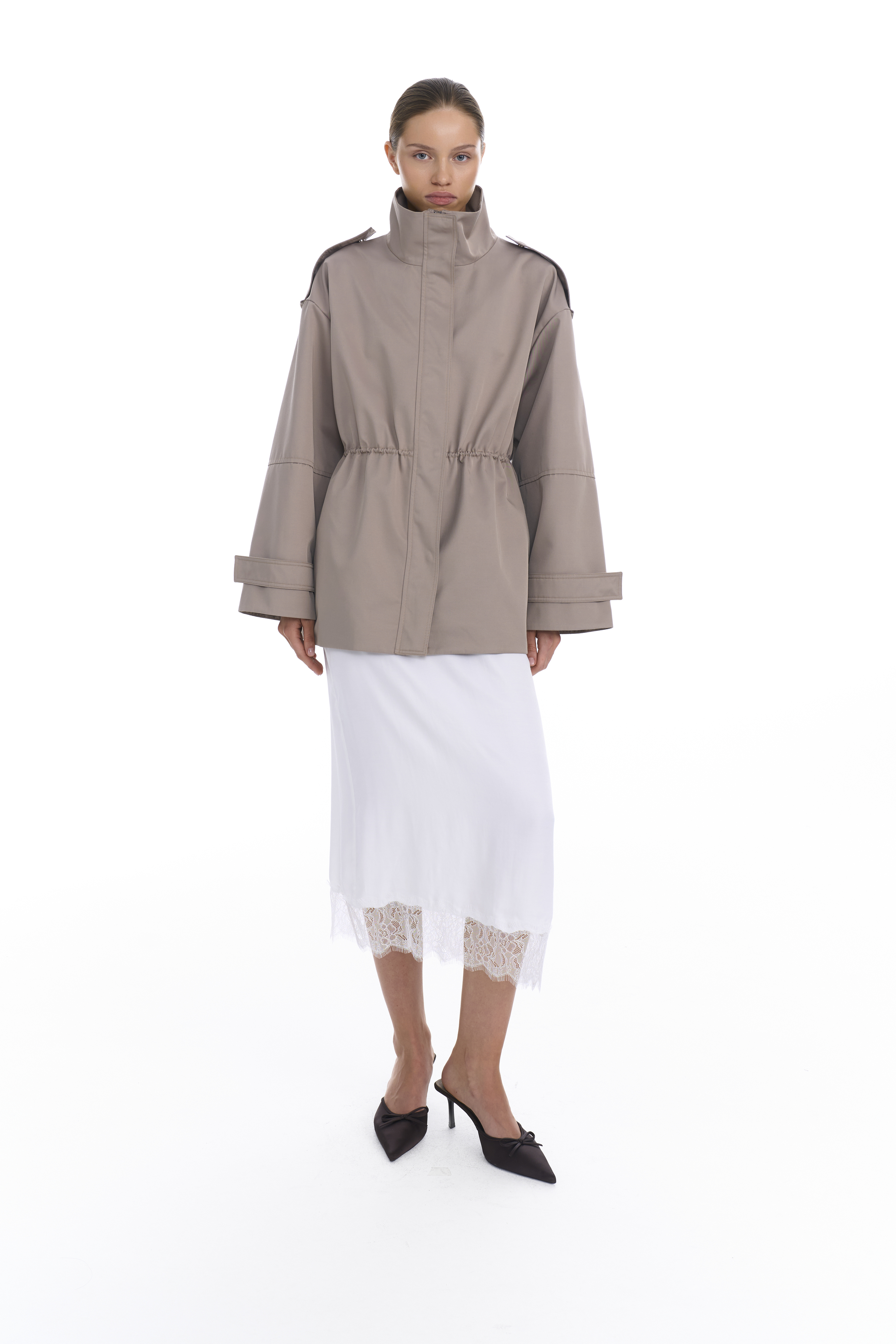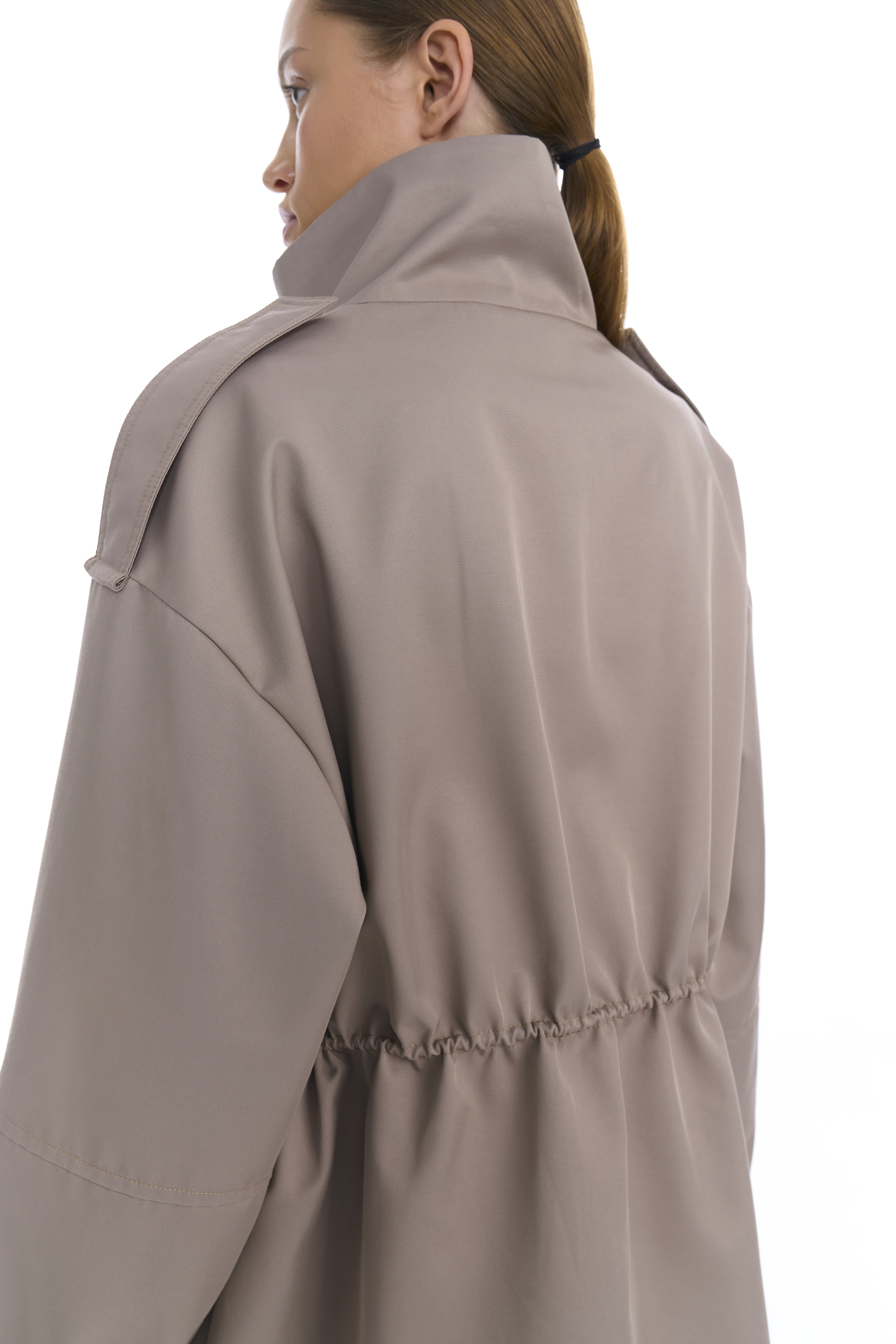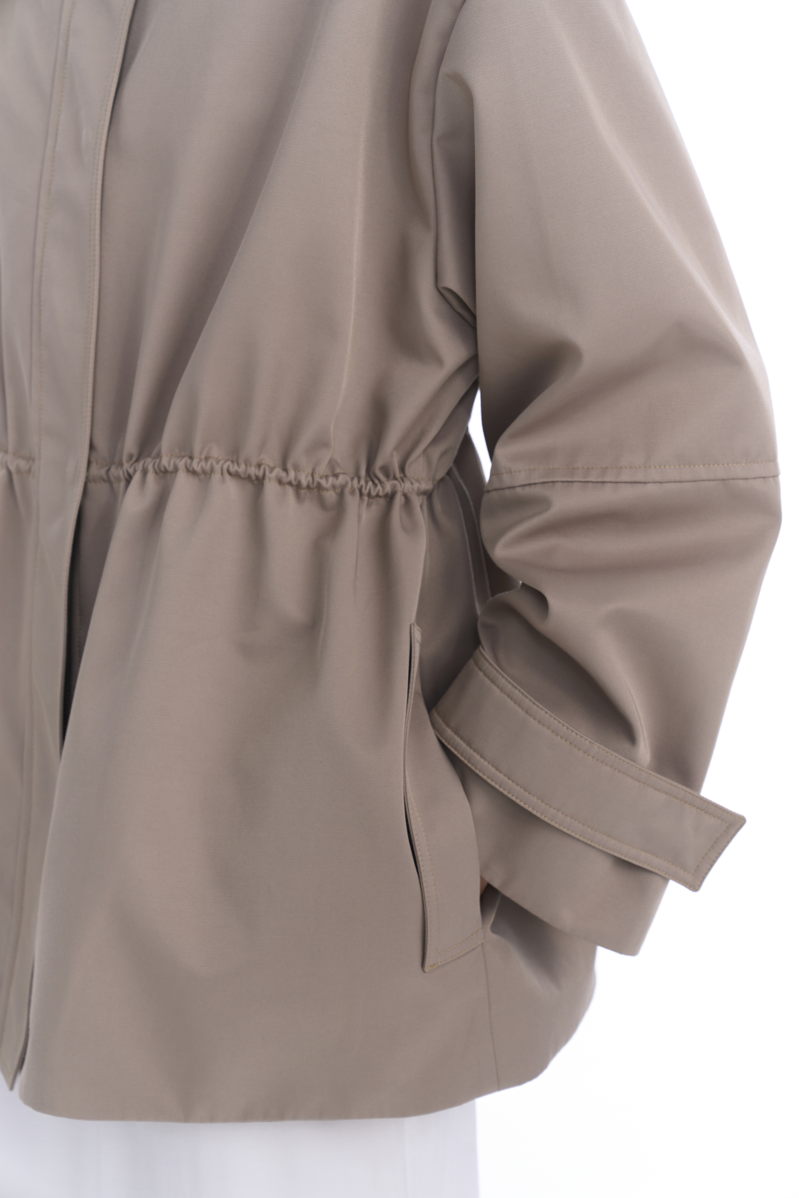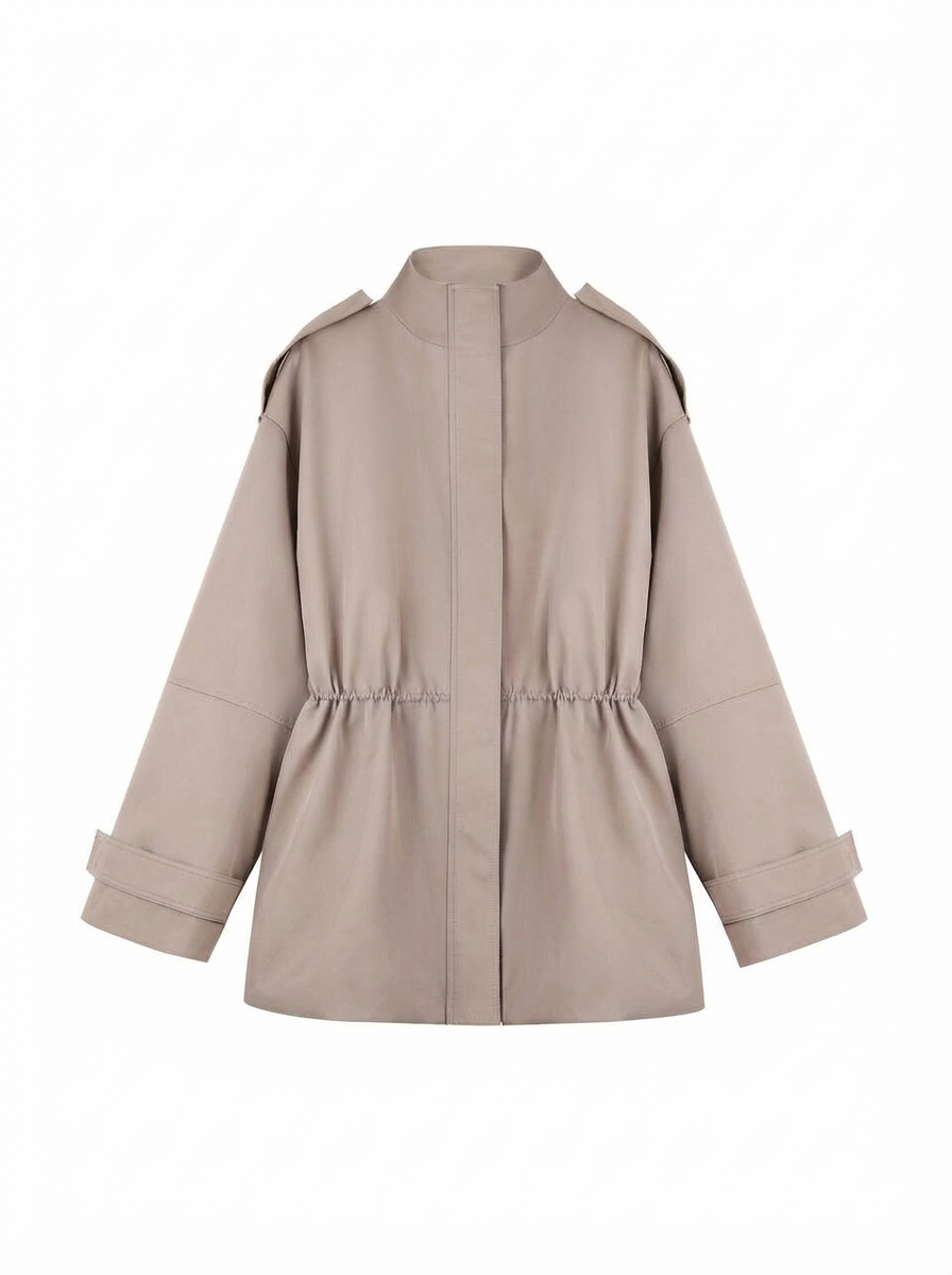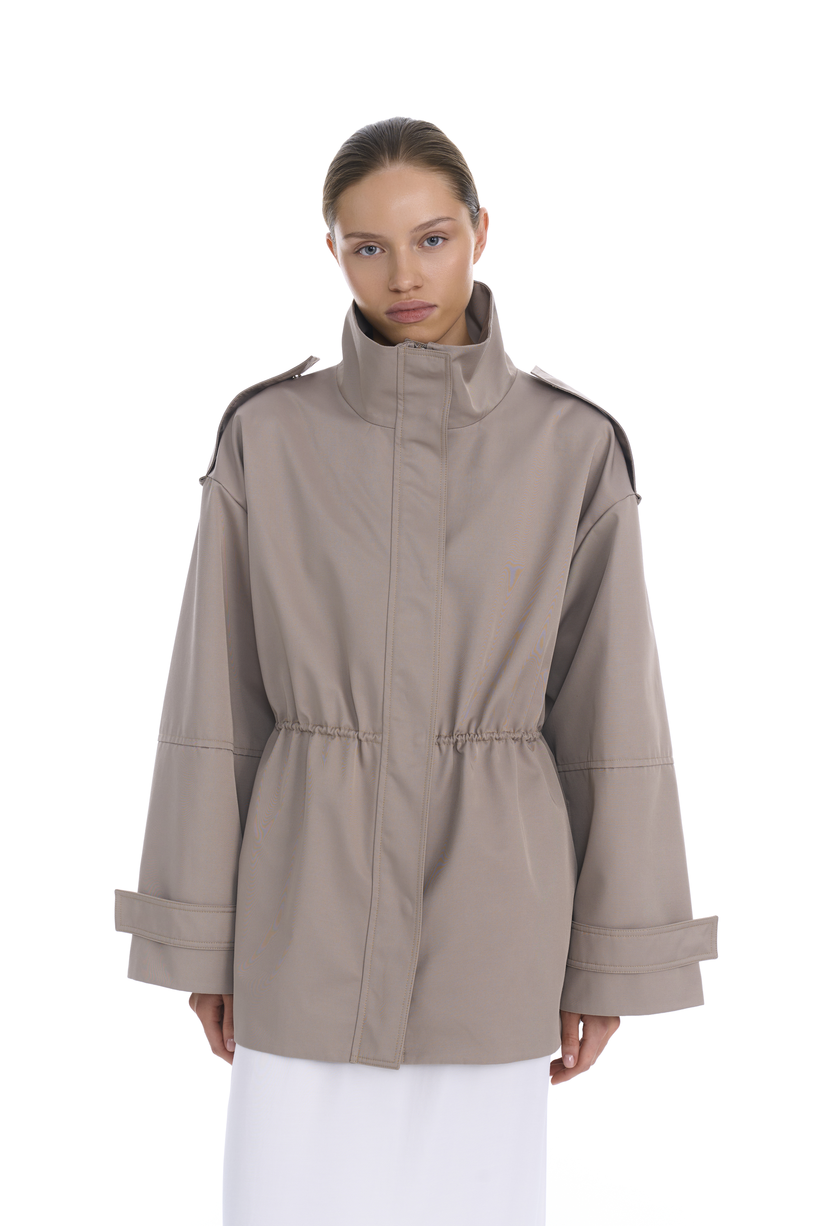 Металлическая молния скрыта под широкой планкой на кнопках — это делает посадку аккуратной и минималистичной. Линия талии регулируется внутренним шнурком, позволяя варьировать силуэт от прямого до более собранного. Рукава дополнены регулируемыми манжетами, на плечах также добавлены манжеты, по бокам два кармана с широкими клапанами.