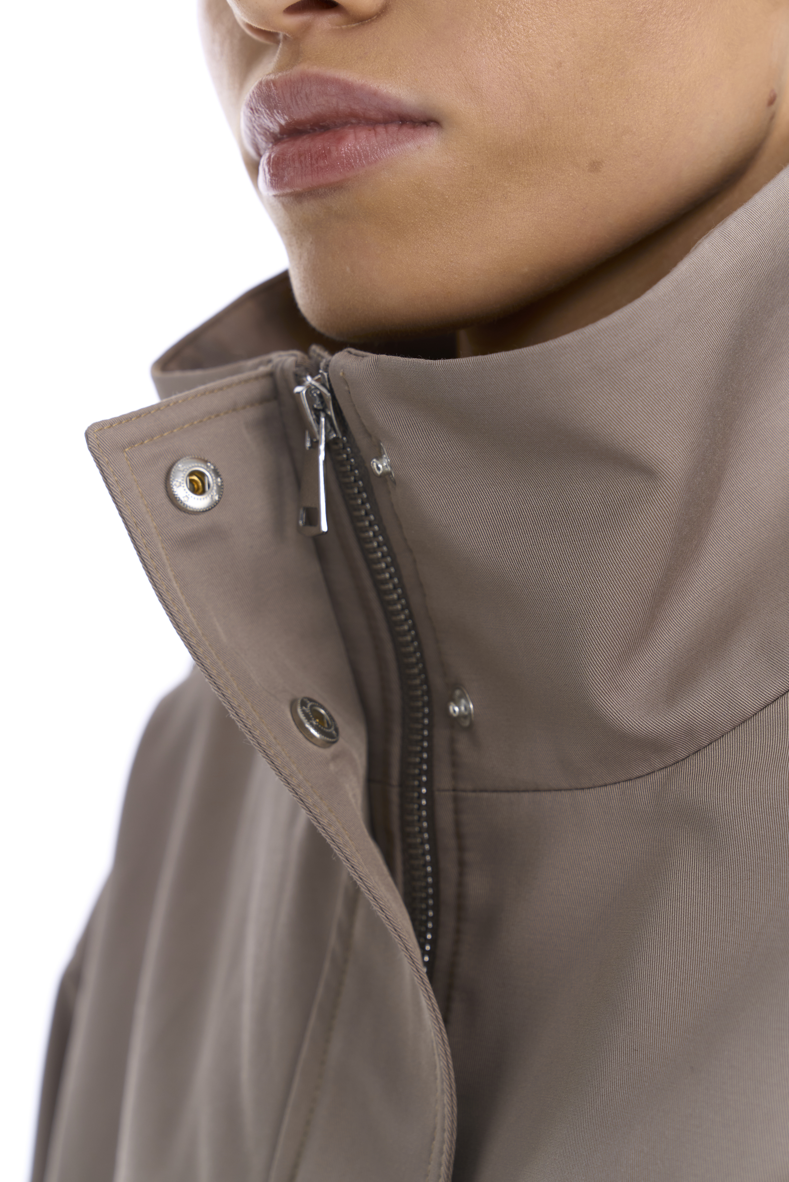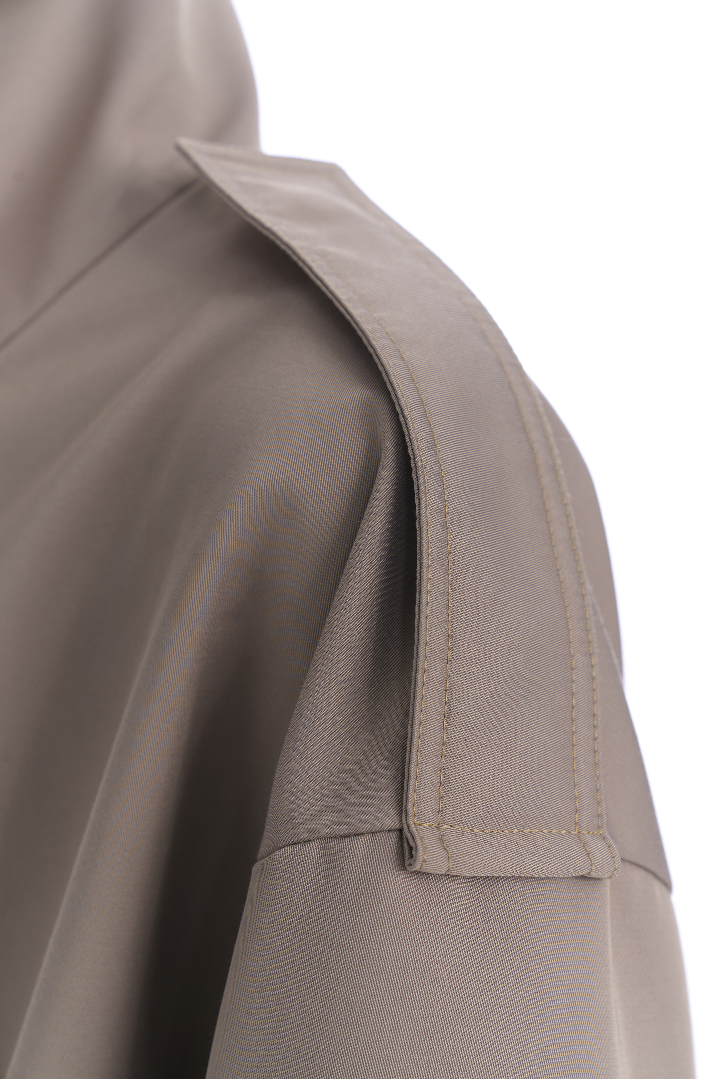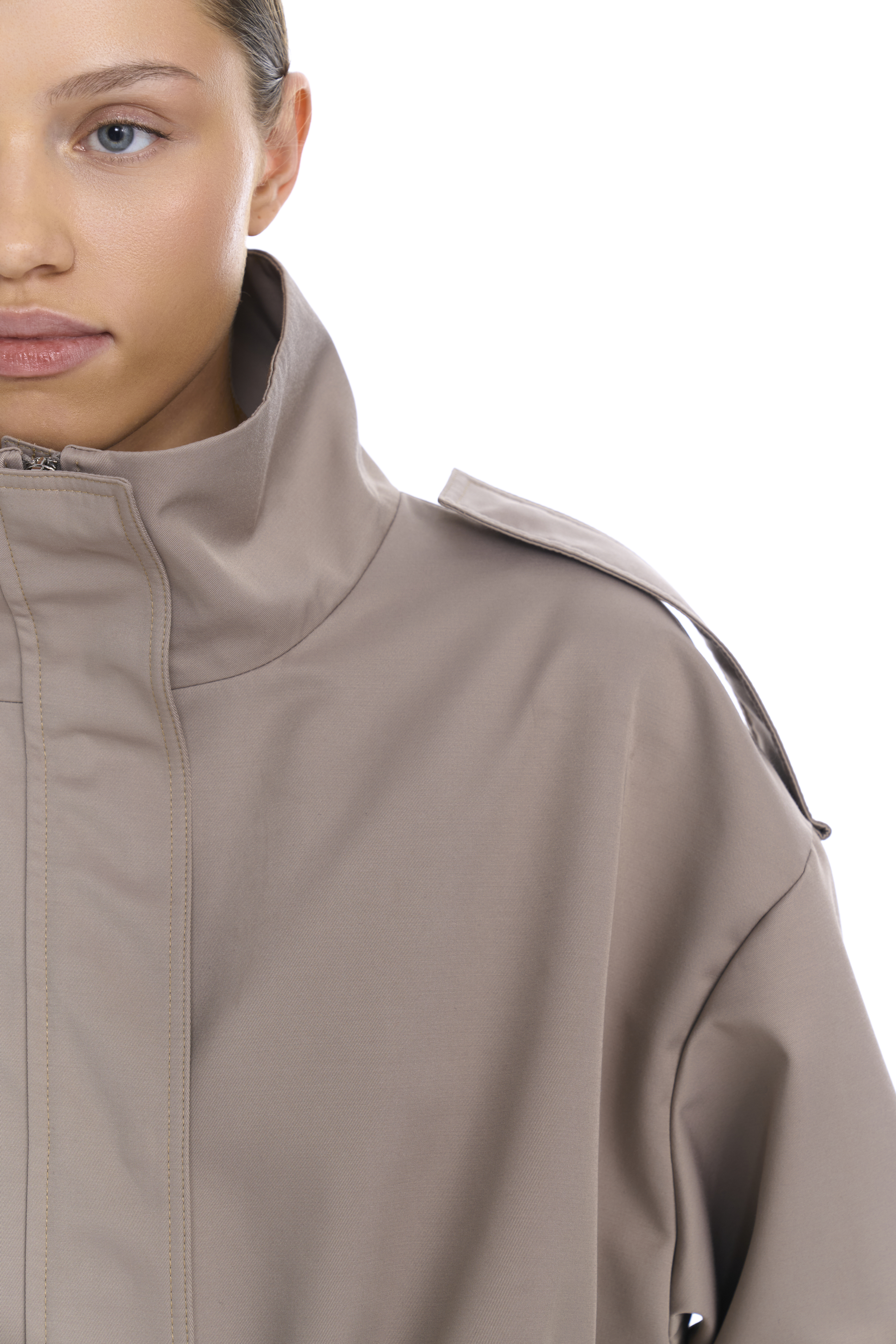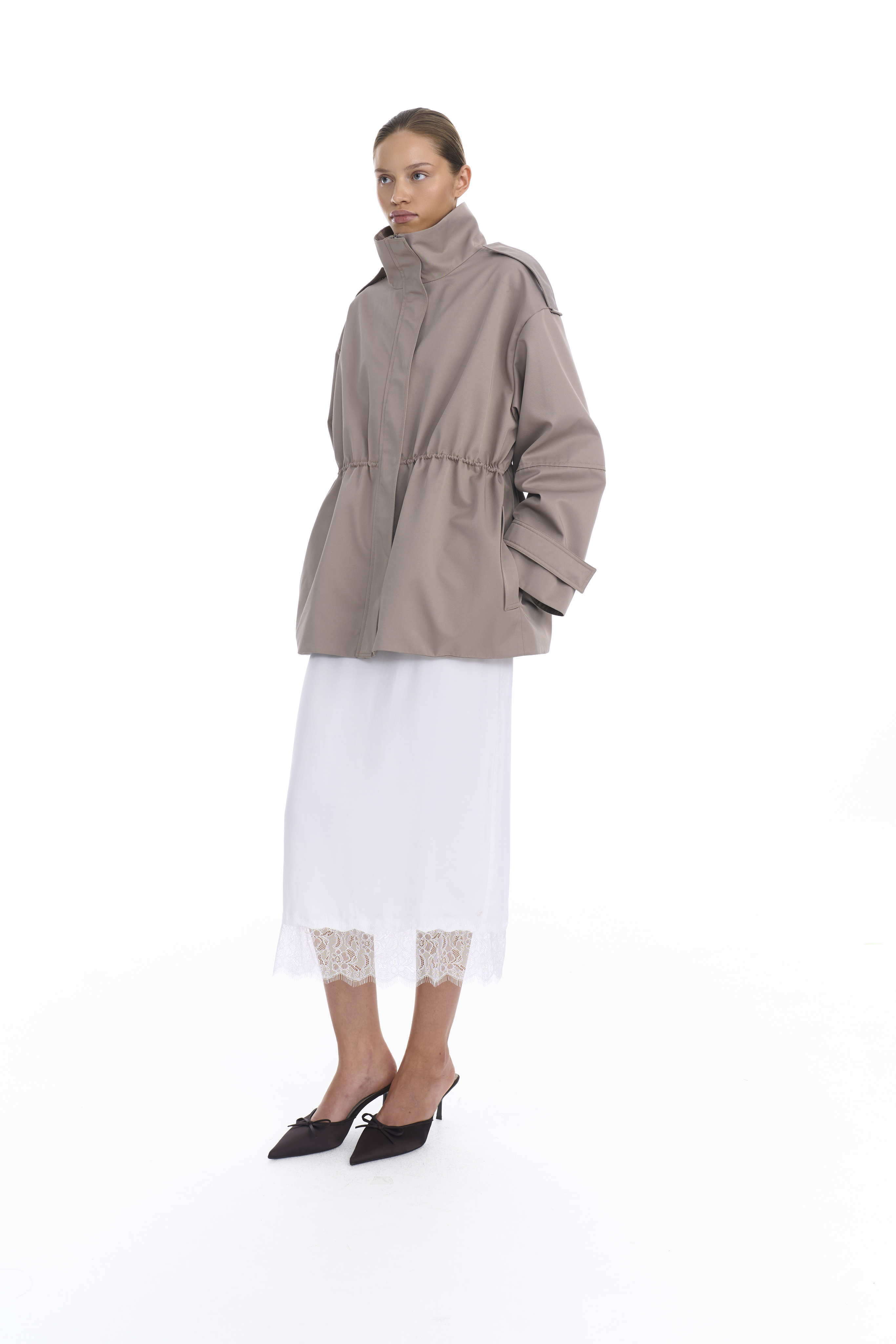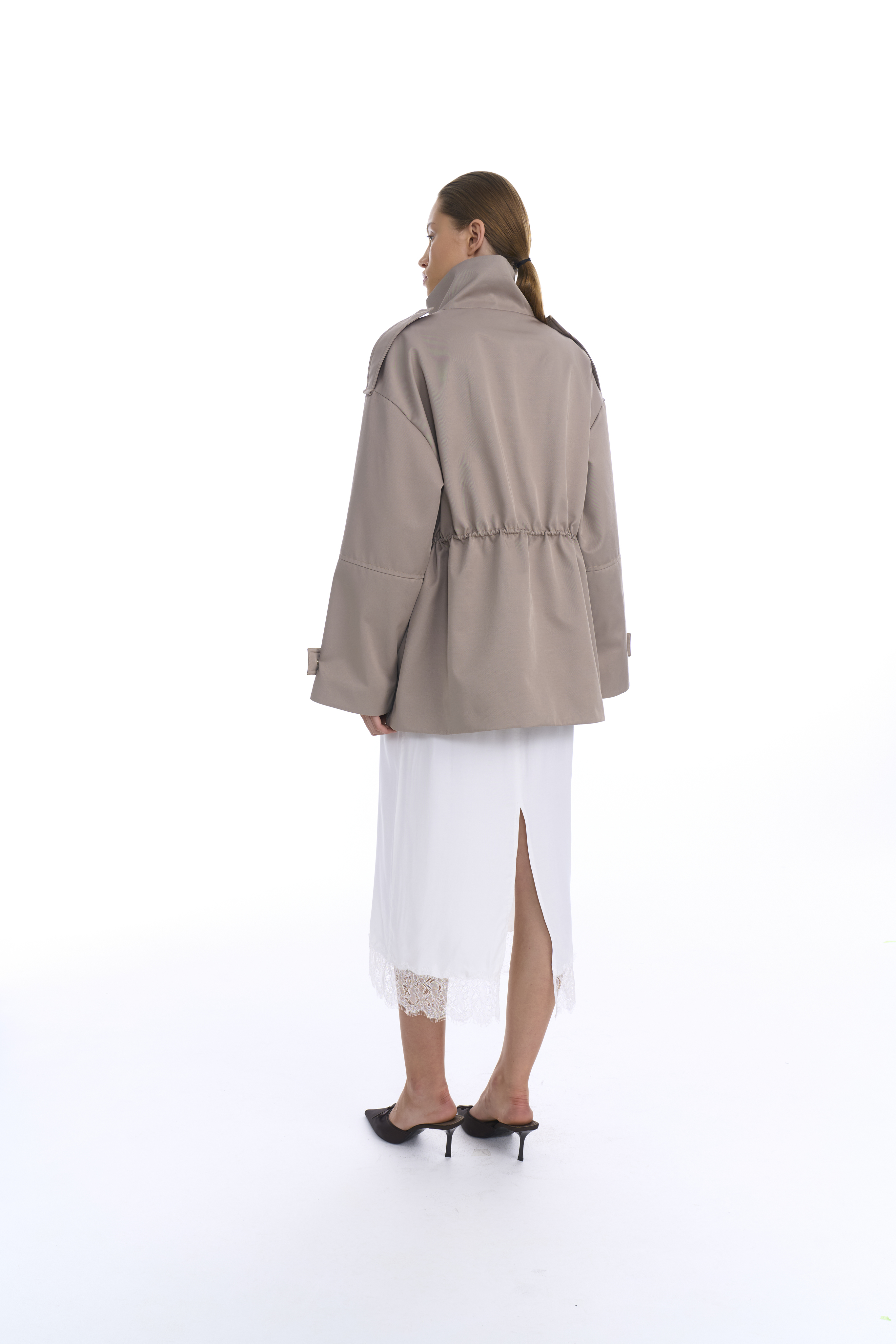 Металлическая молния скрыта под широкой планкой на кнопках — это делает посадку аккуратной и минималистичной. Линия талии регулируется внутренним шнурком, позволяя варьировать силуэт от прямого до более собранного. Рукава дополнены регулируемыми манжетами, на плечах также добавлены манжеты, по бокам два кармана с широкими клапанами.