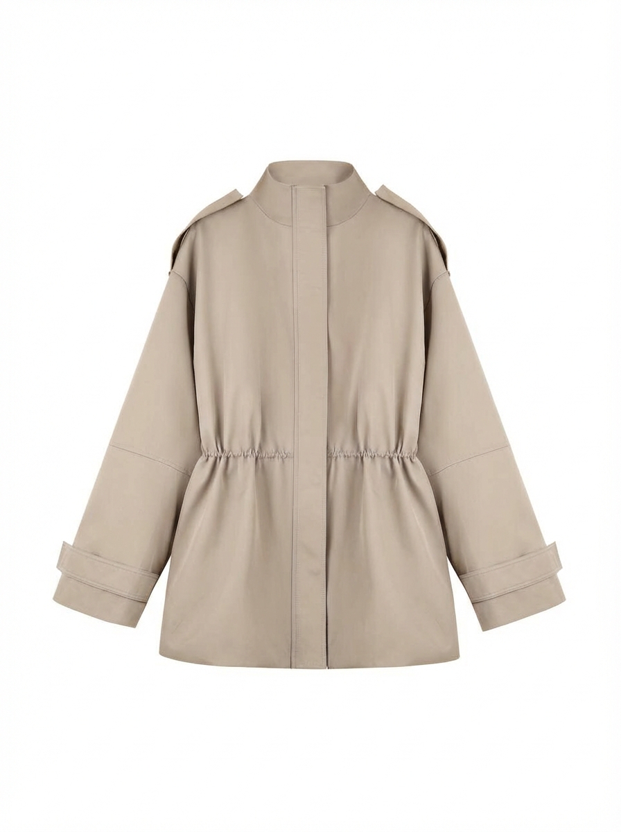 Металлическая молния скрыта под широкой планкой на пуговицах— это делает посадку аккуратной и минималистичной. Линия талии регулируется внутренним шнурком, позволяя варьировать силуэт от прямого до более собранного. Рукава дополнены регулируемыми манжетами, на плечах так же добавлены манжеты, по бокам два кармана с широкими клапанами.