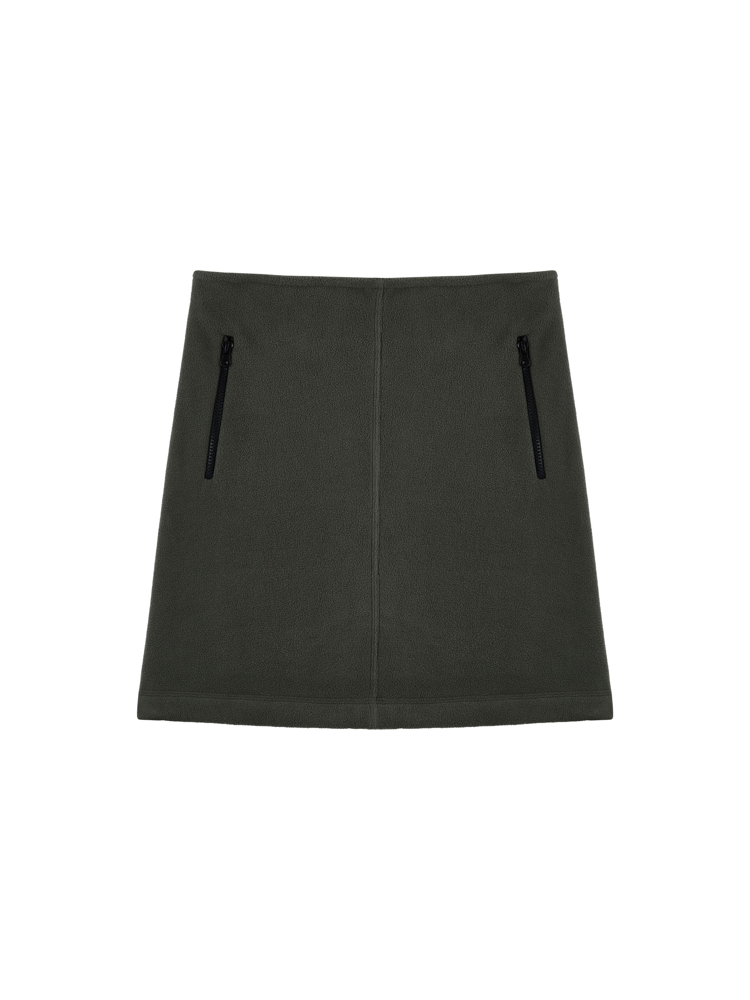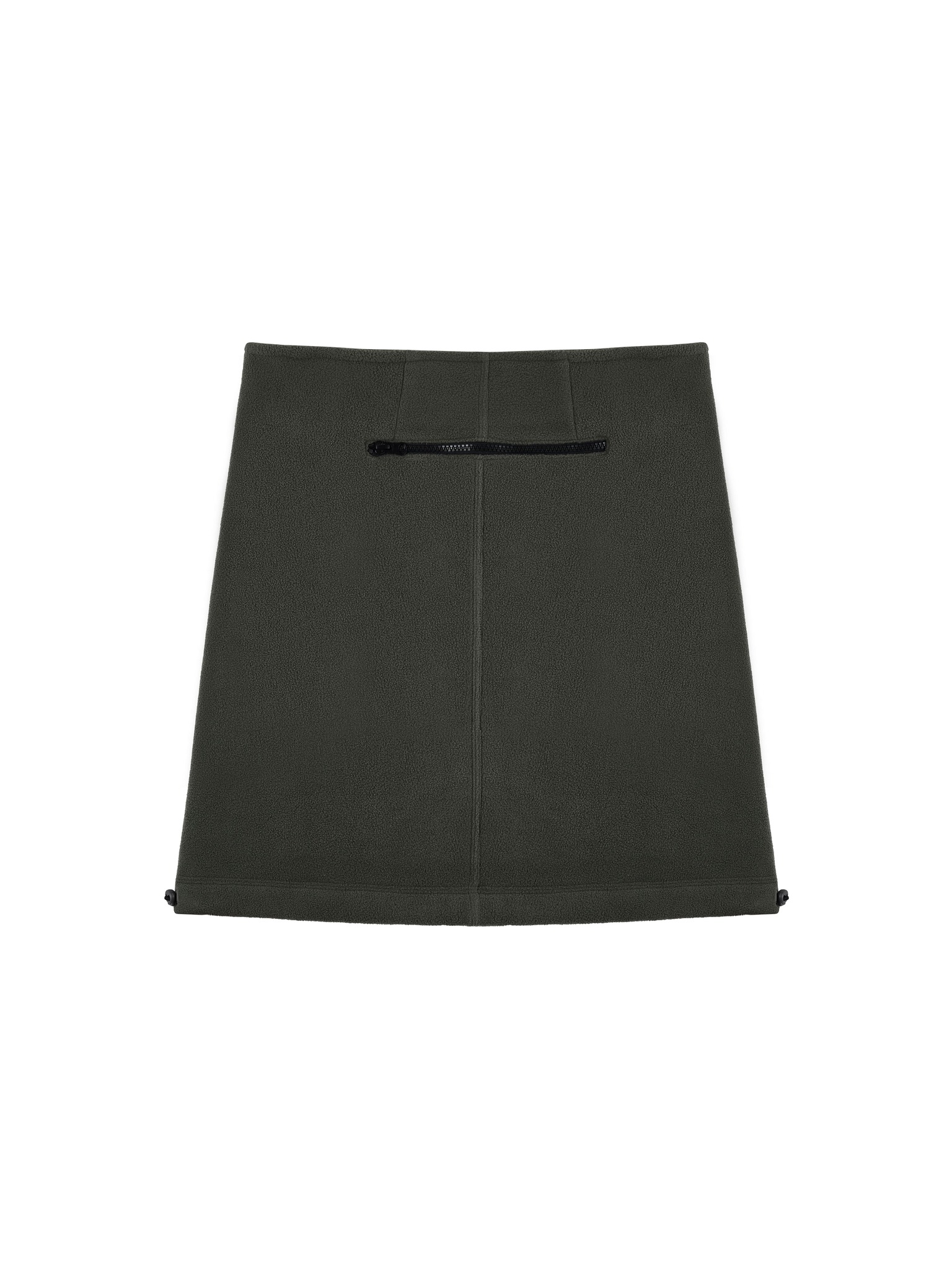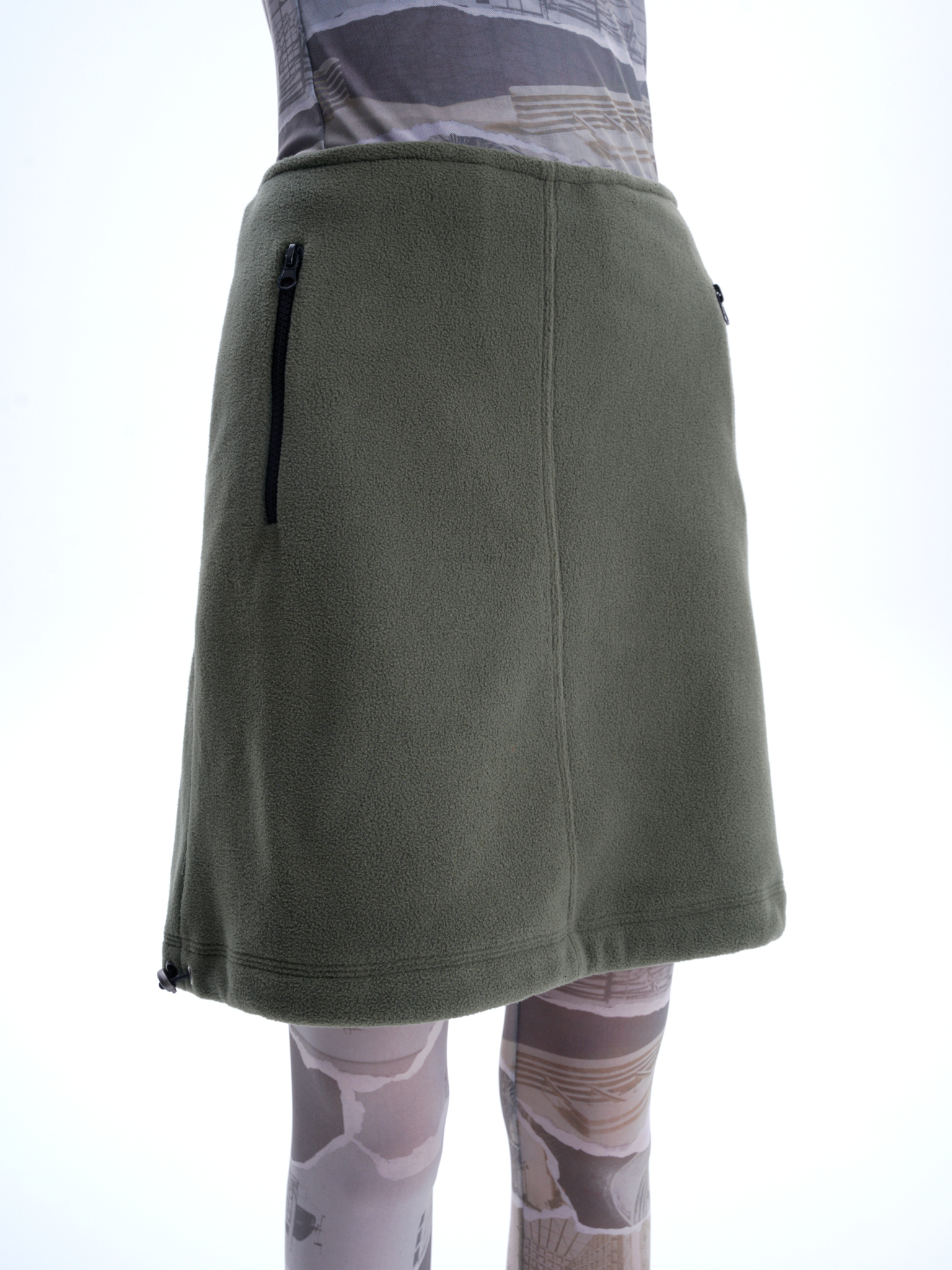 Флисовая юбка длины до середины бедра, средняя посадка, застегивается на потайную молнию сбоку. Два боковых кармана с контрастной молнией, один горизонтальный карман сзади. Кулиска по подолу юбки, с двумя затяжками, дает возможность менять форму юбки.