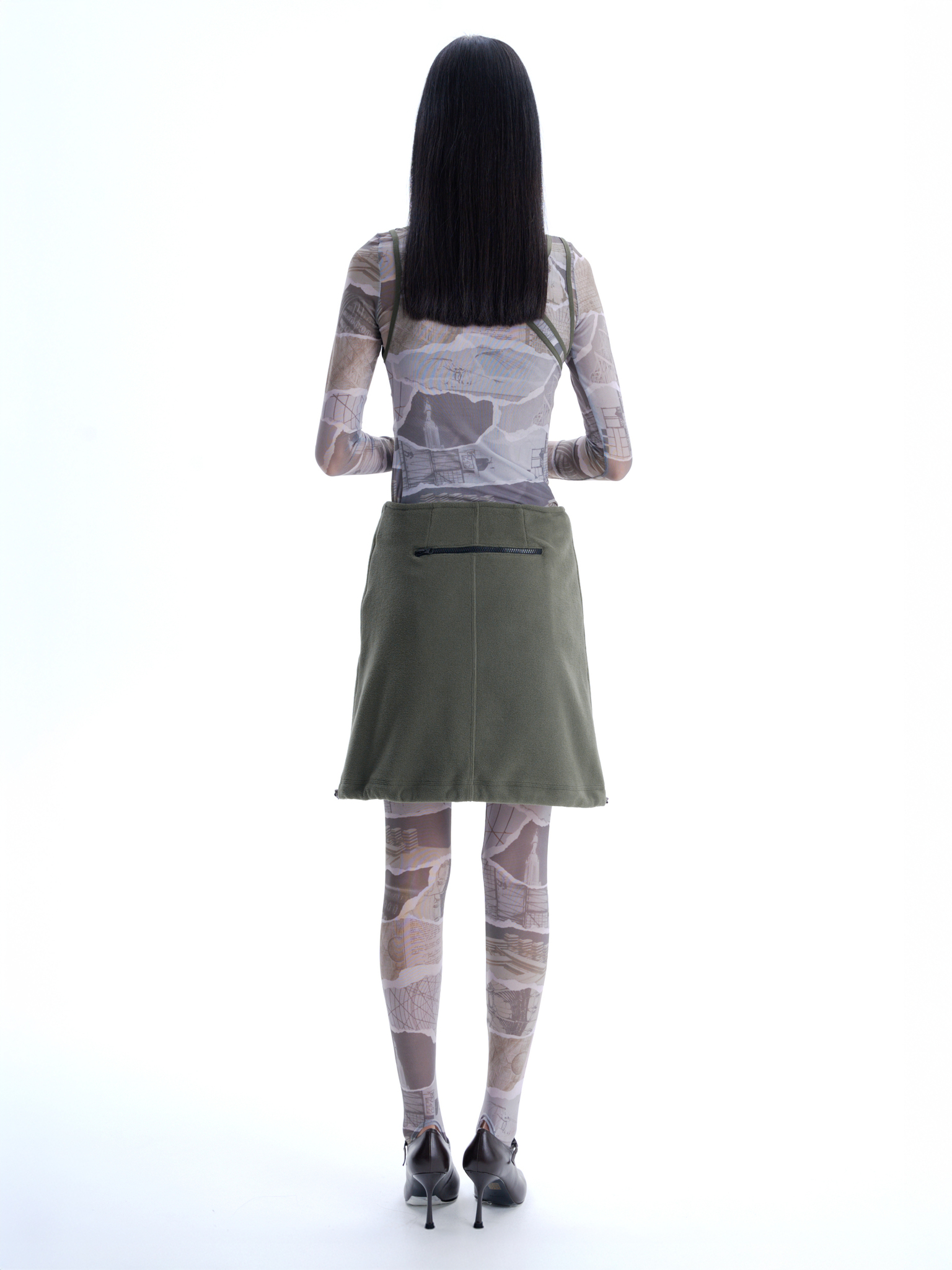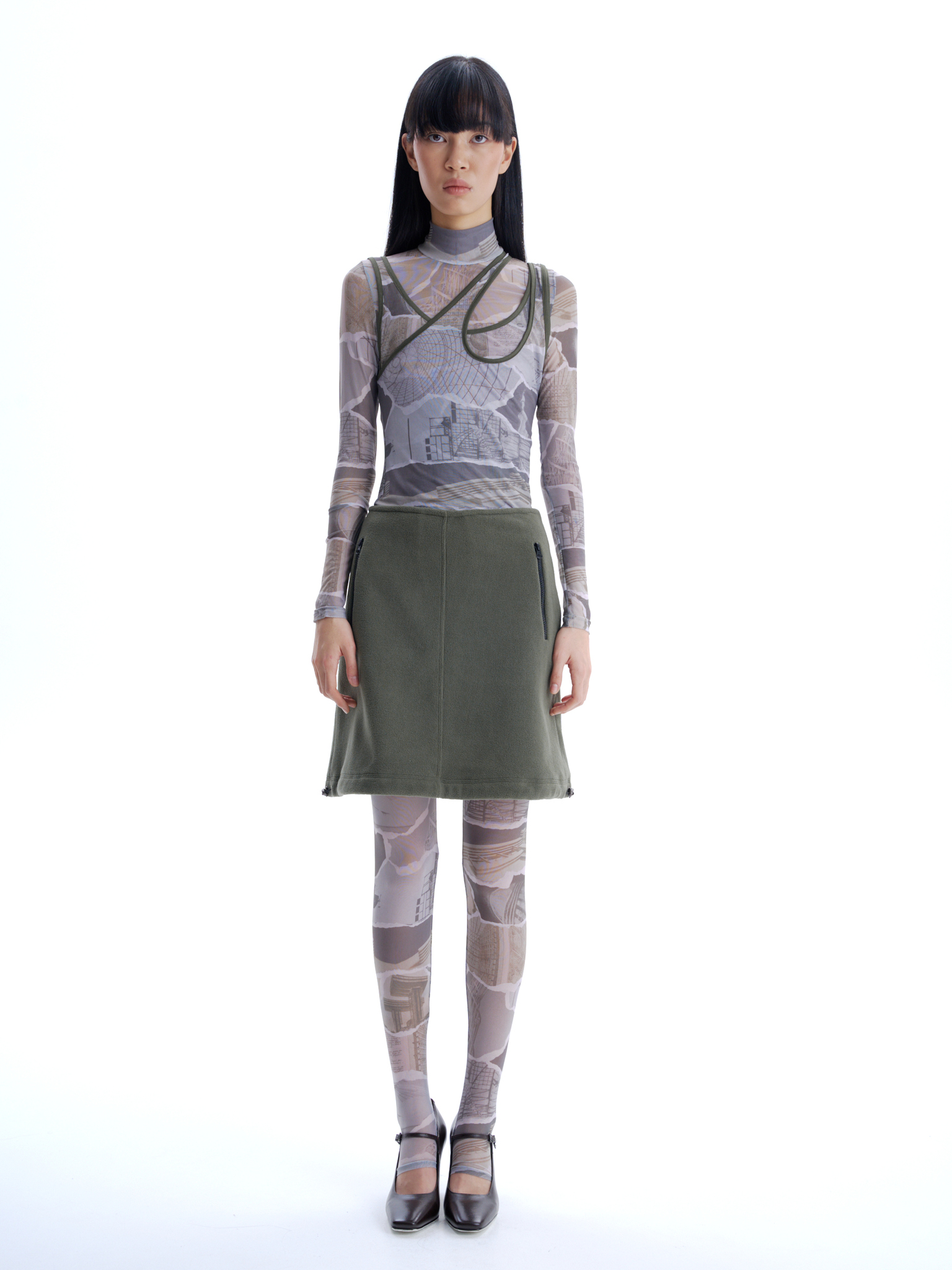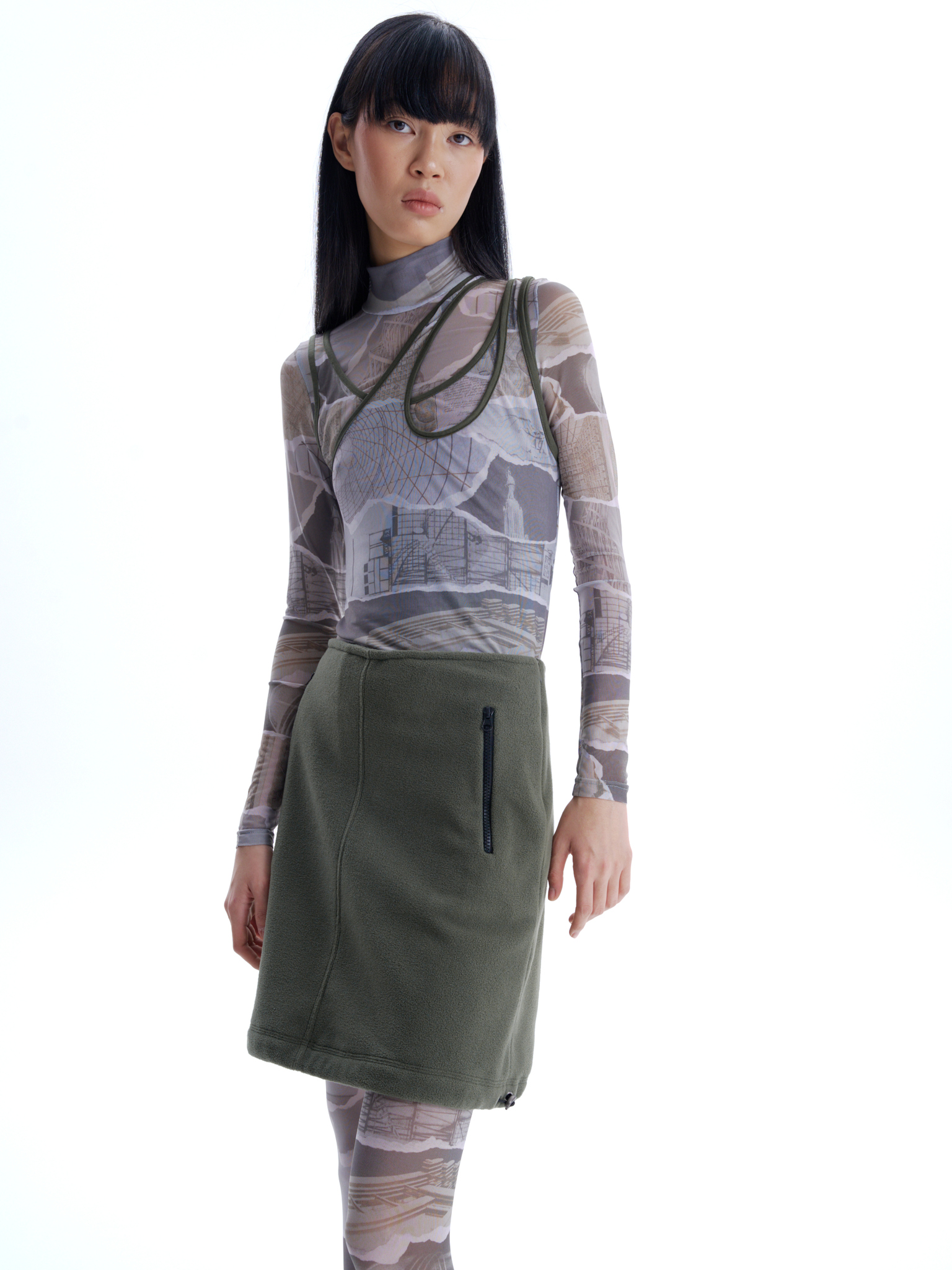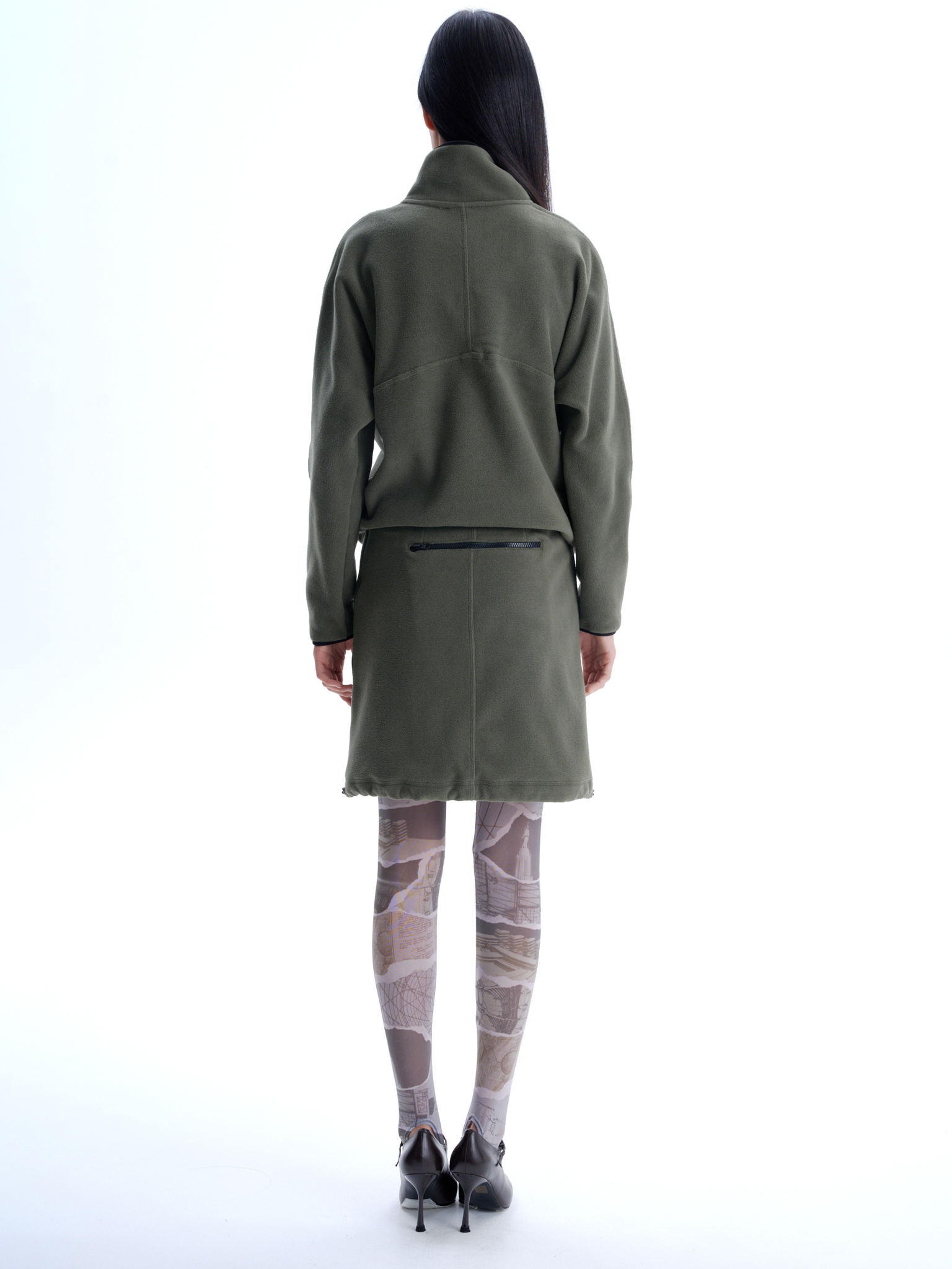 Флисовая юбка длины до середины бедра, средняя посадка, застегивается на потайную молнию сбоку. Два боковых кармана с контрастной молнией, один горизонтальный карман сзади. Кулиска по подолу юбки, с двумя затяжками, дает возможность менять форму юбки.