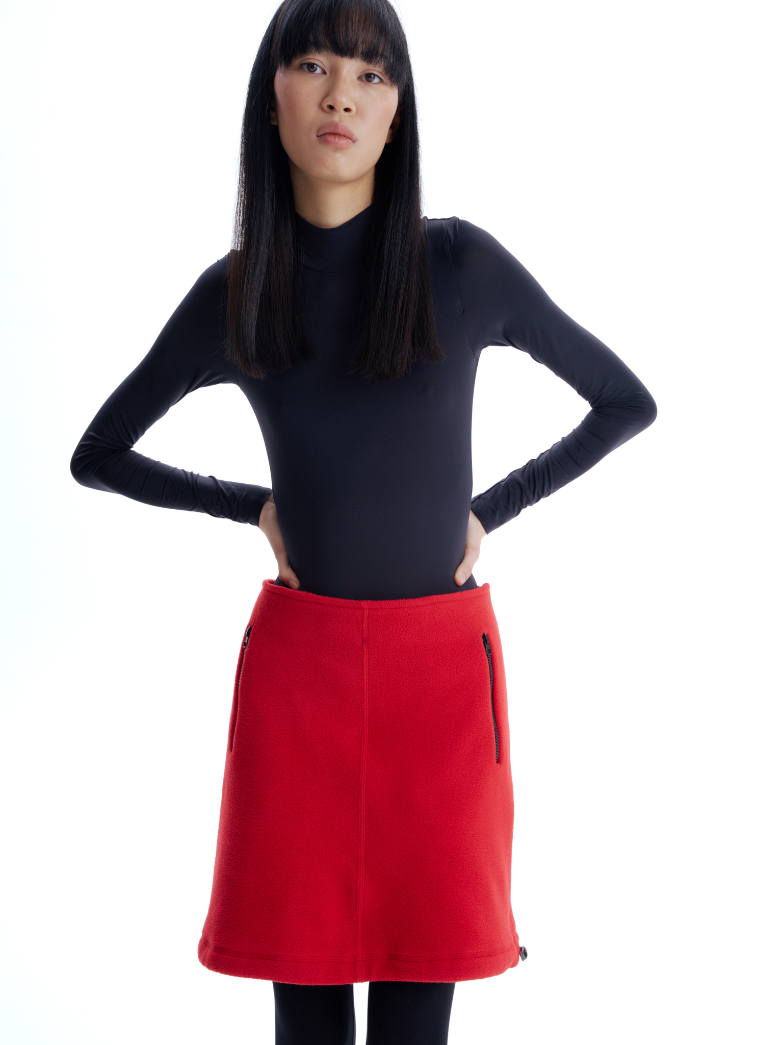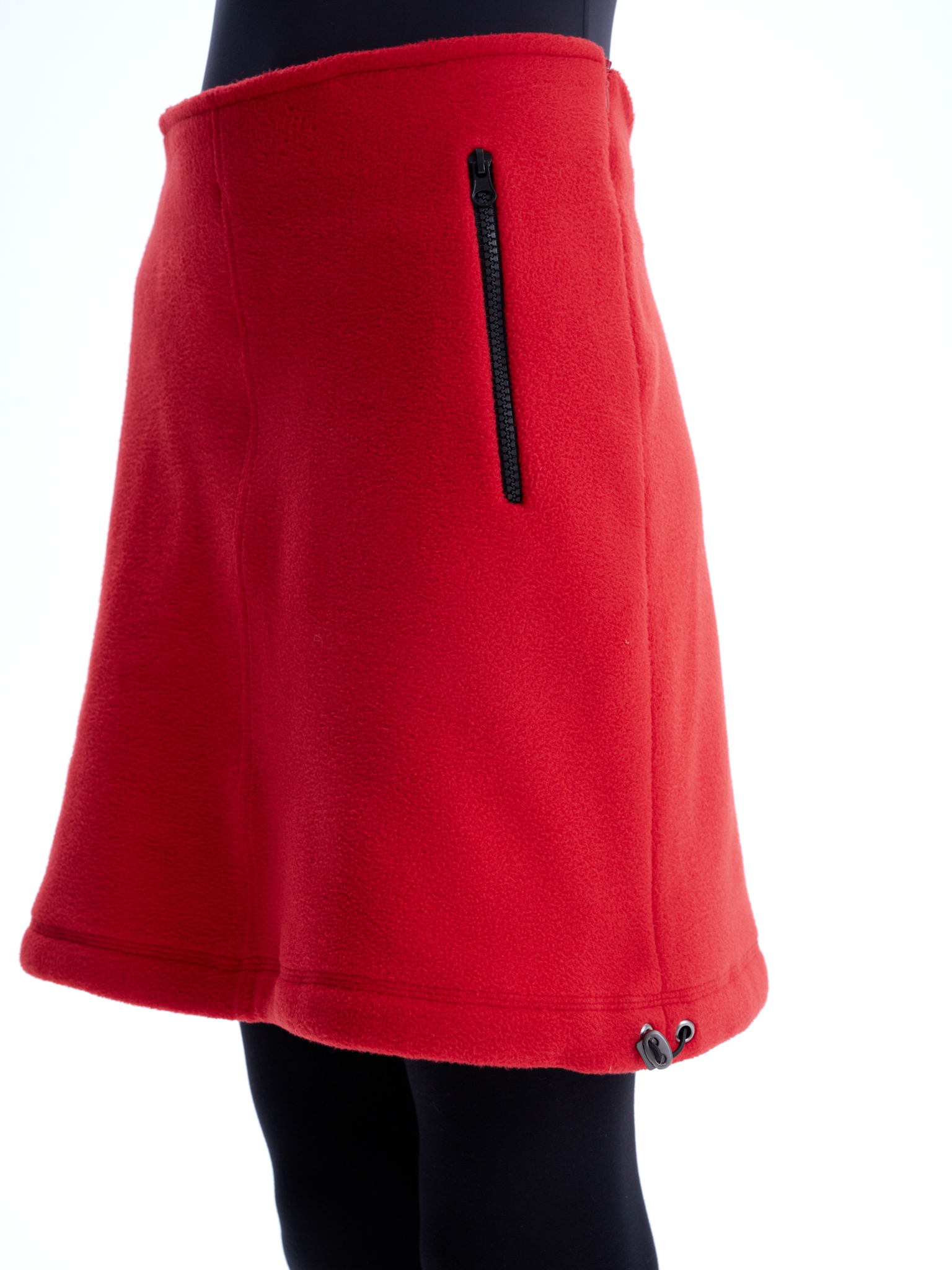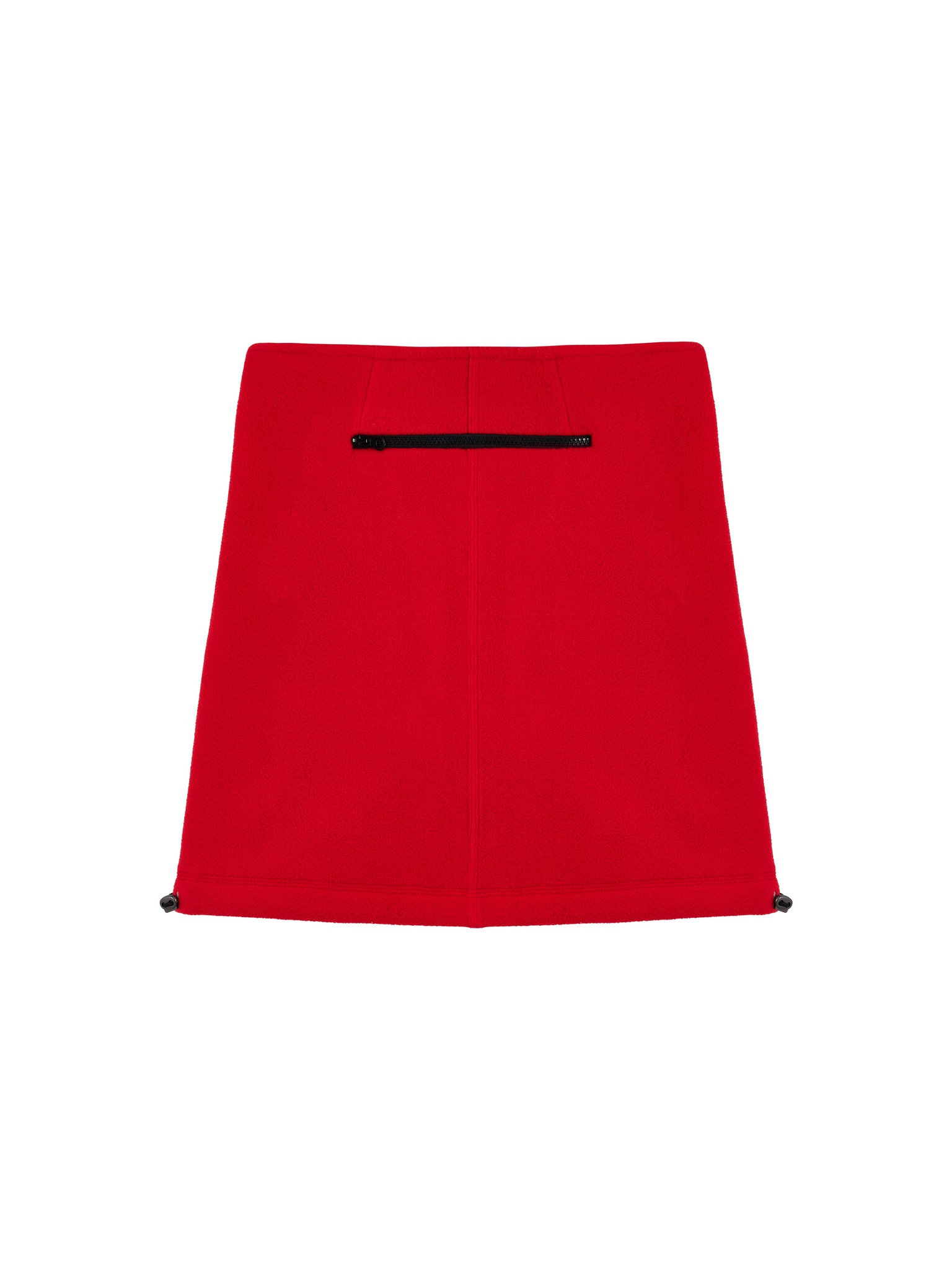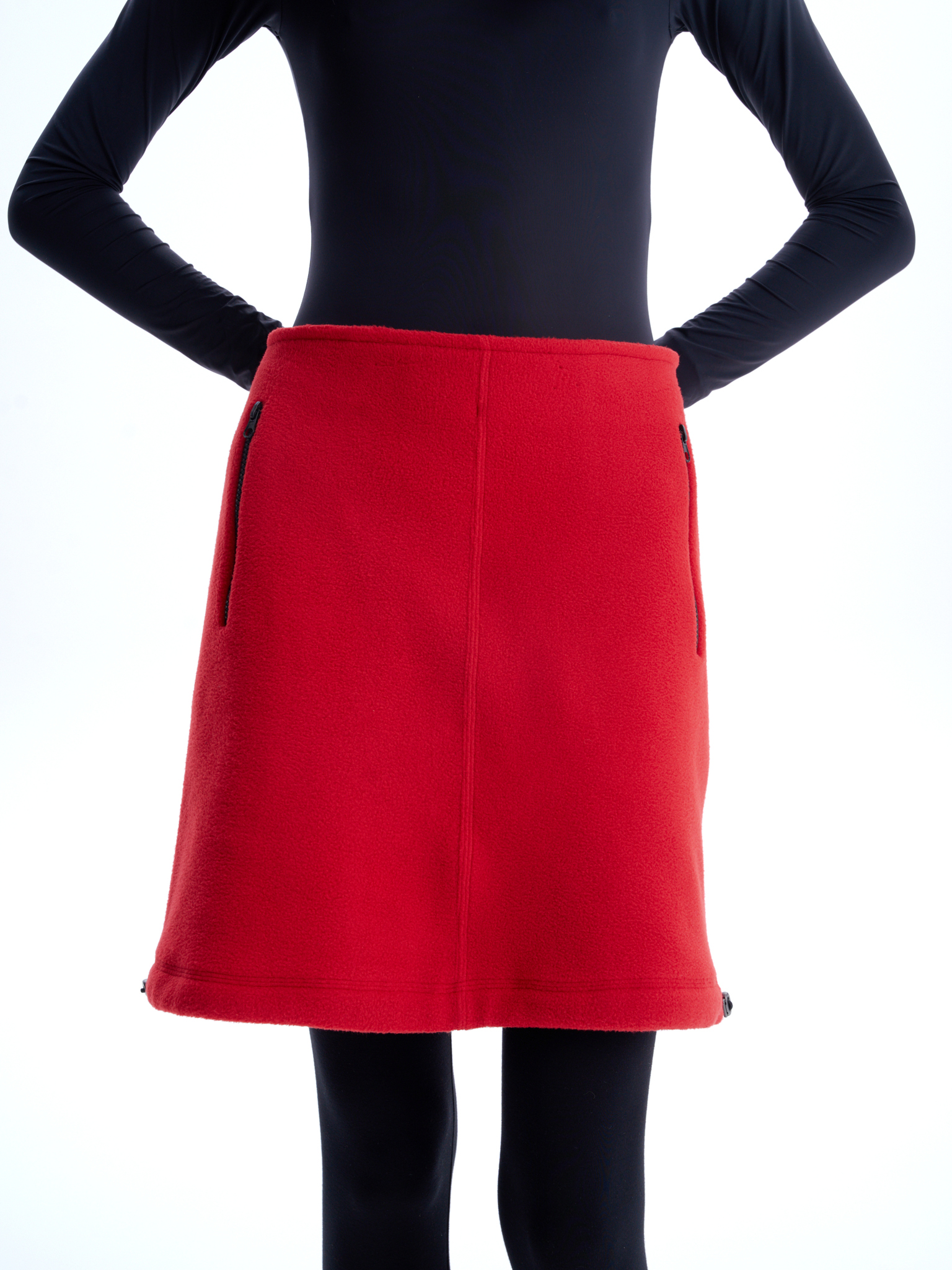 Флисовая юбка длины до середины бедра, средняя посадка, застегивается на потайную молнию сбоку. Два боковых кармана с контрастной молнией, один горизонтальный карман сзади. Кулиска по подолу юбки, с двумя затяжками, дает возможность менять форму юбки.