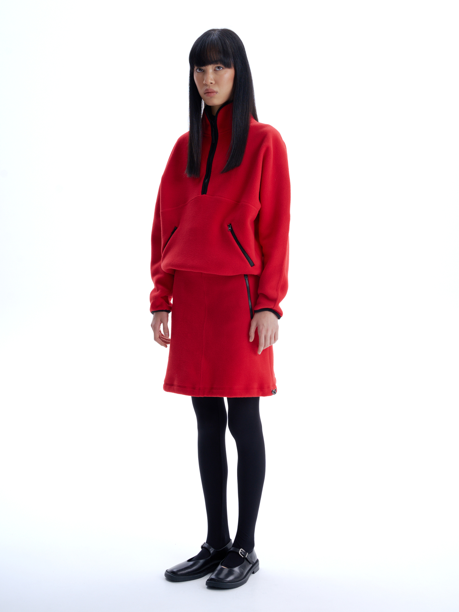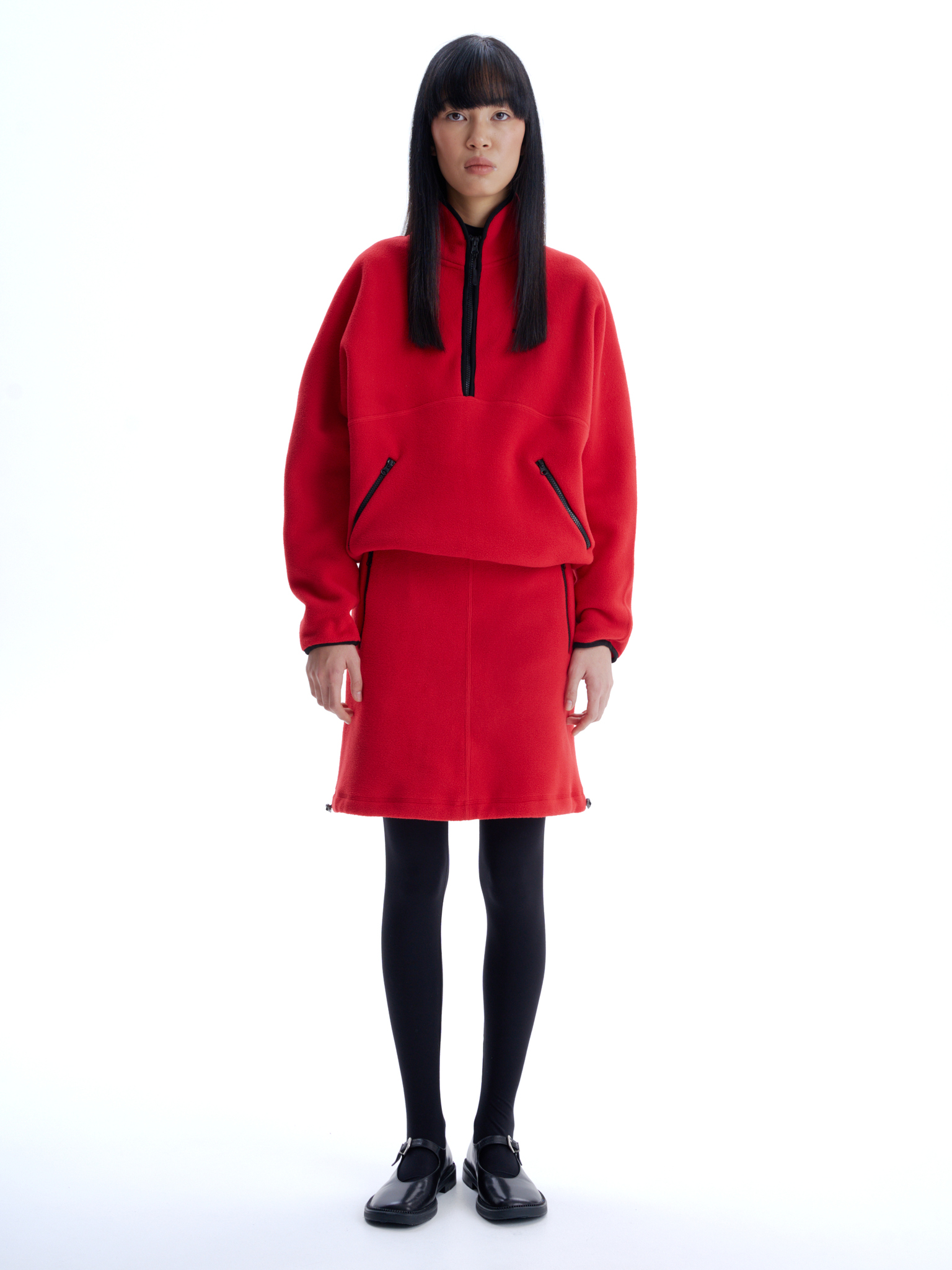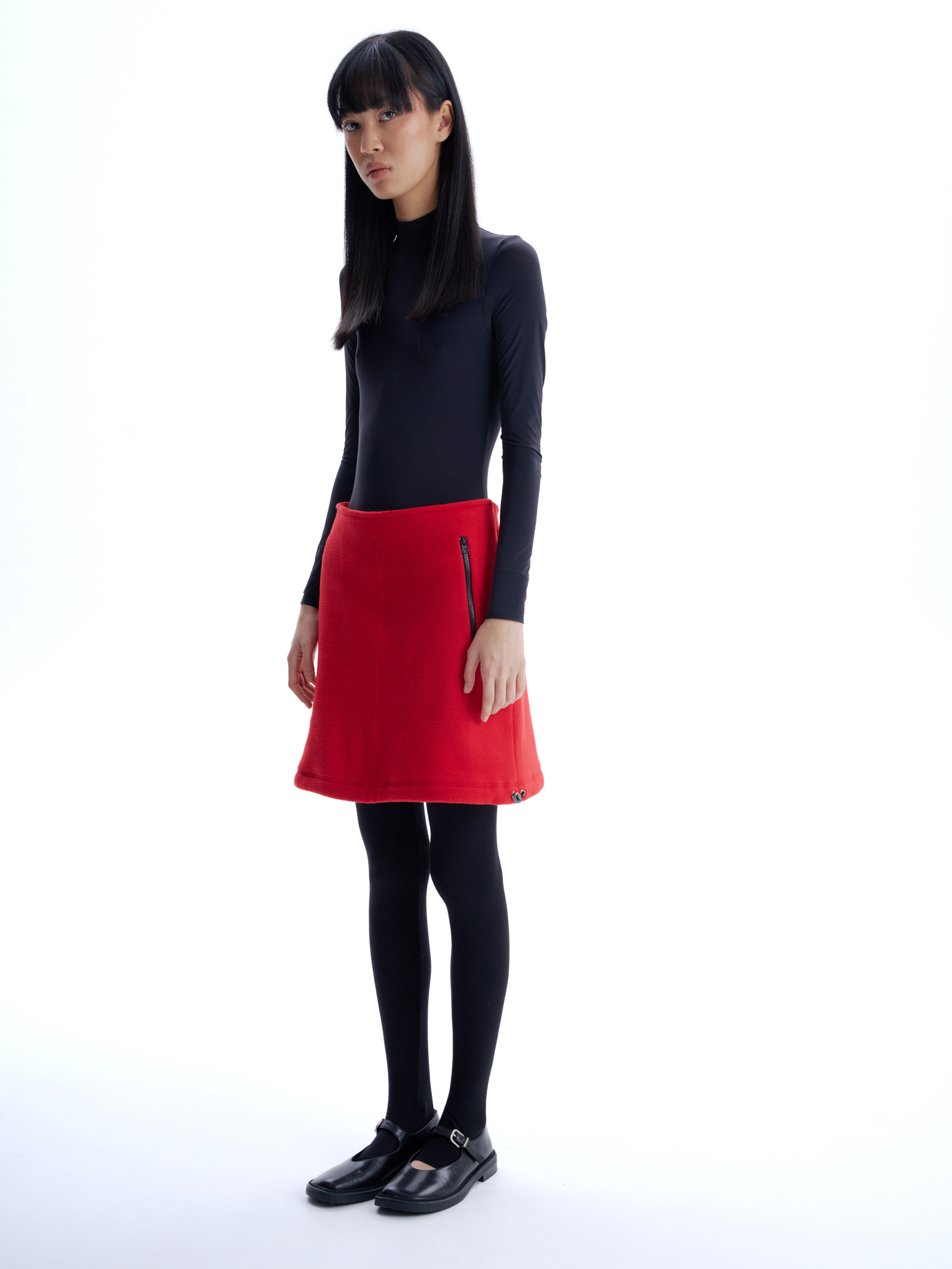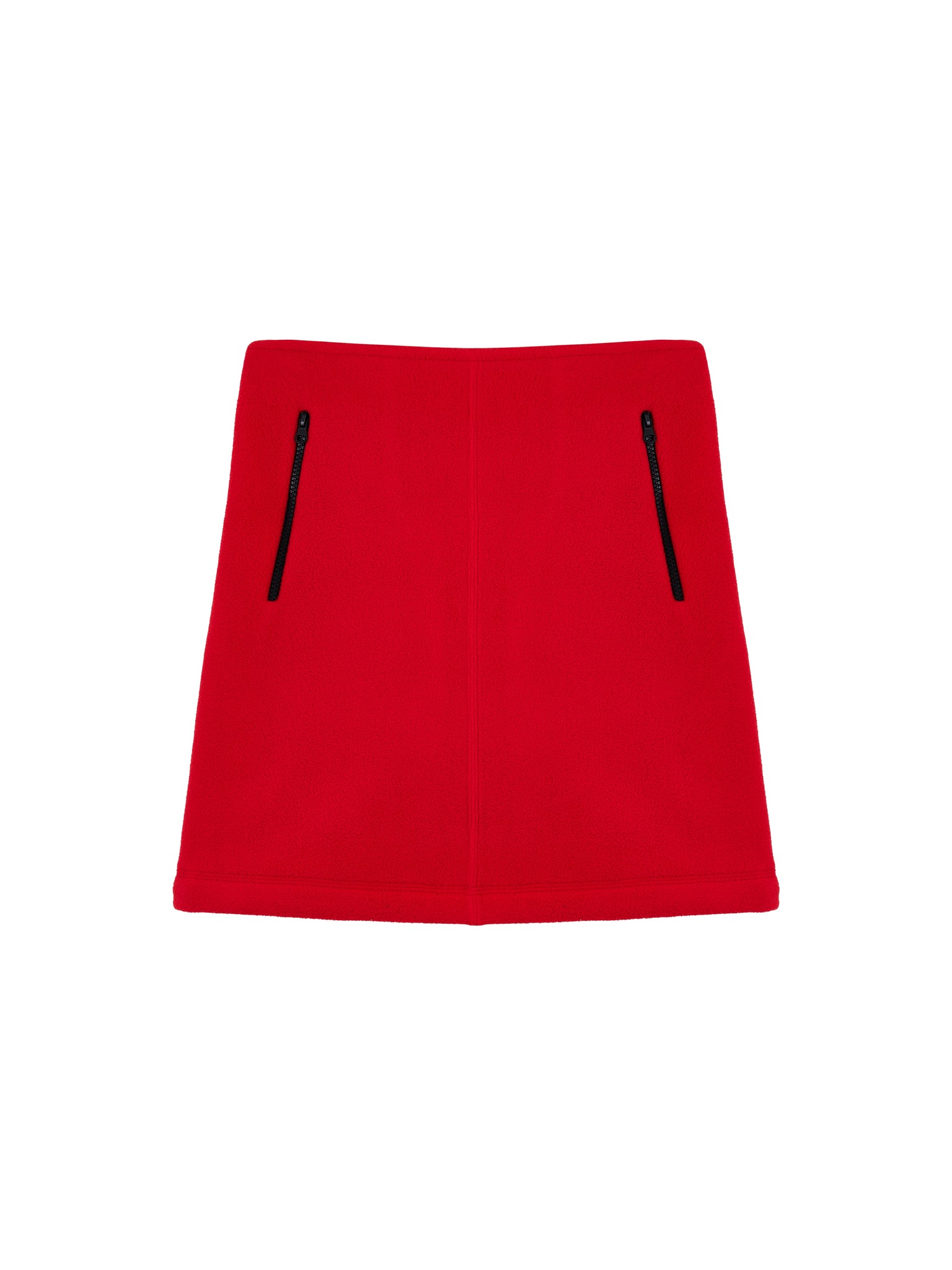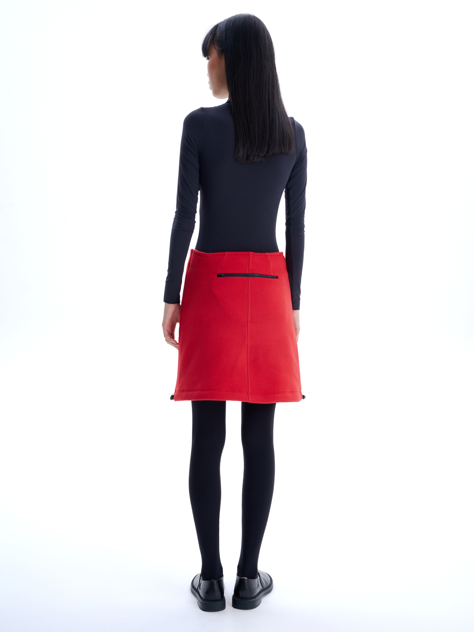 Флисовая юбка длины до середины бедра, средняя посадка, застегивается на потайную молнию сбоку. Два боковых кармана с контрастной молнией, один горизонтальный карман сзади. Кулиска по подолу юбки, с двумя затяжками, дает возможность менять форму юбки.