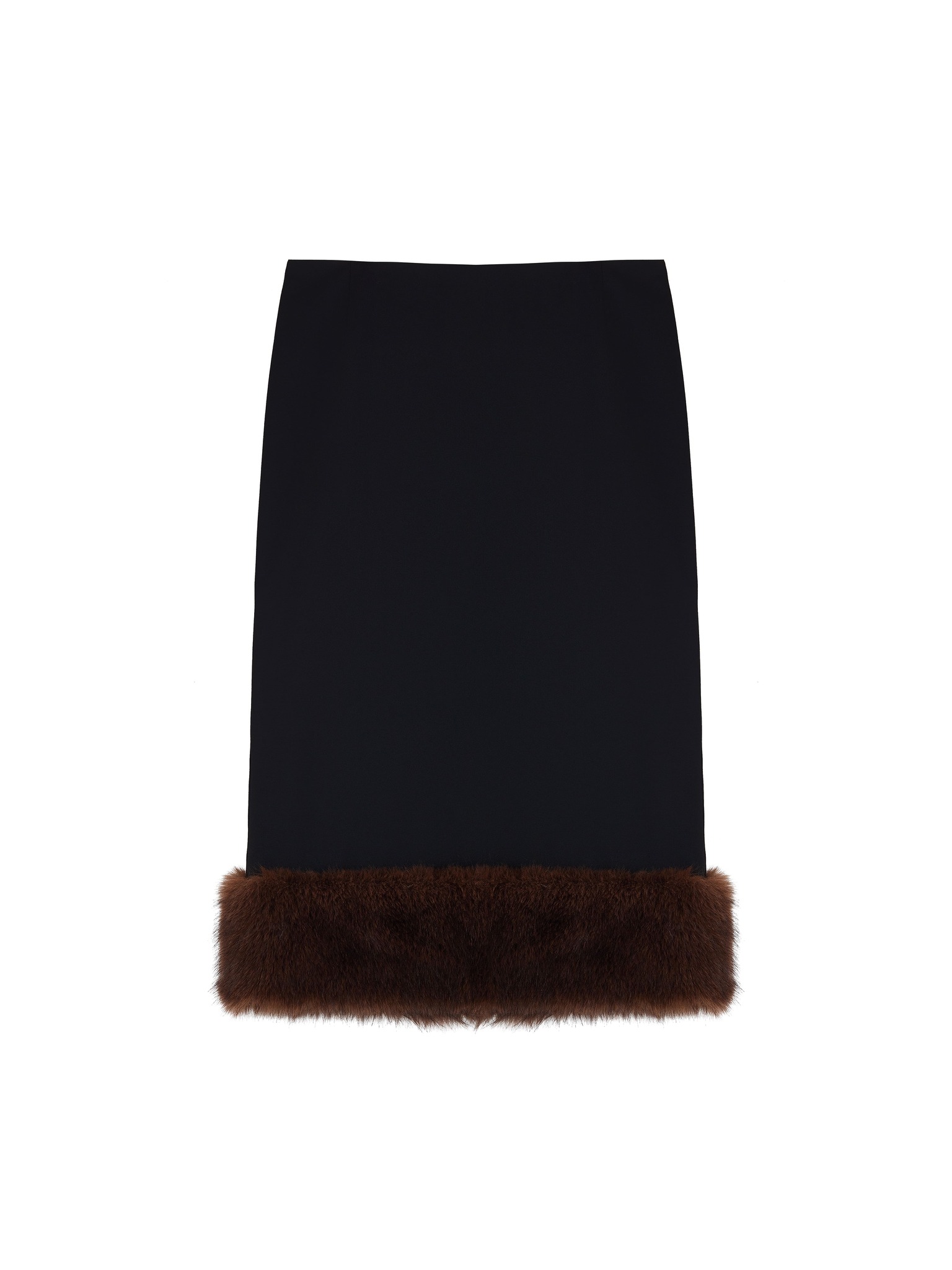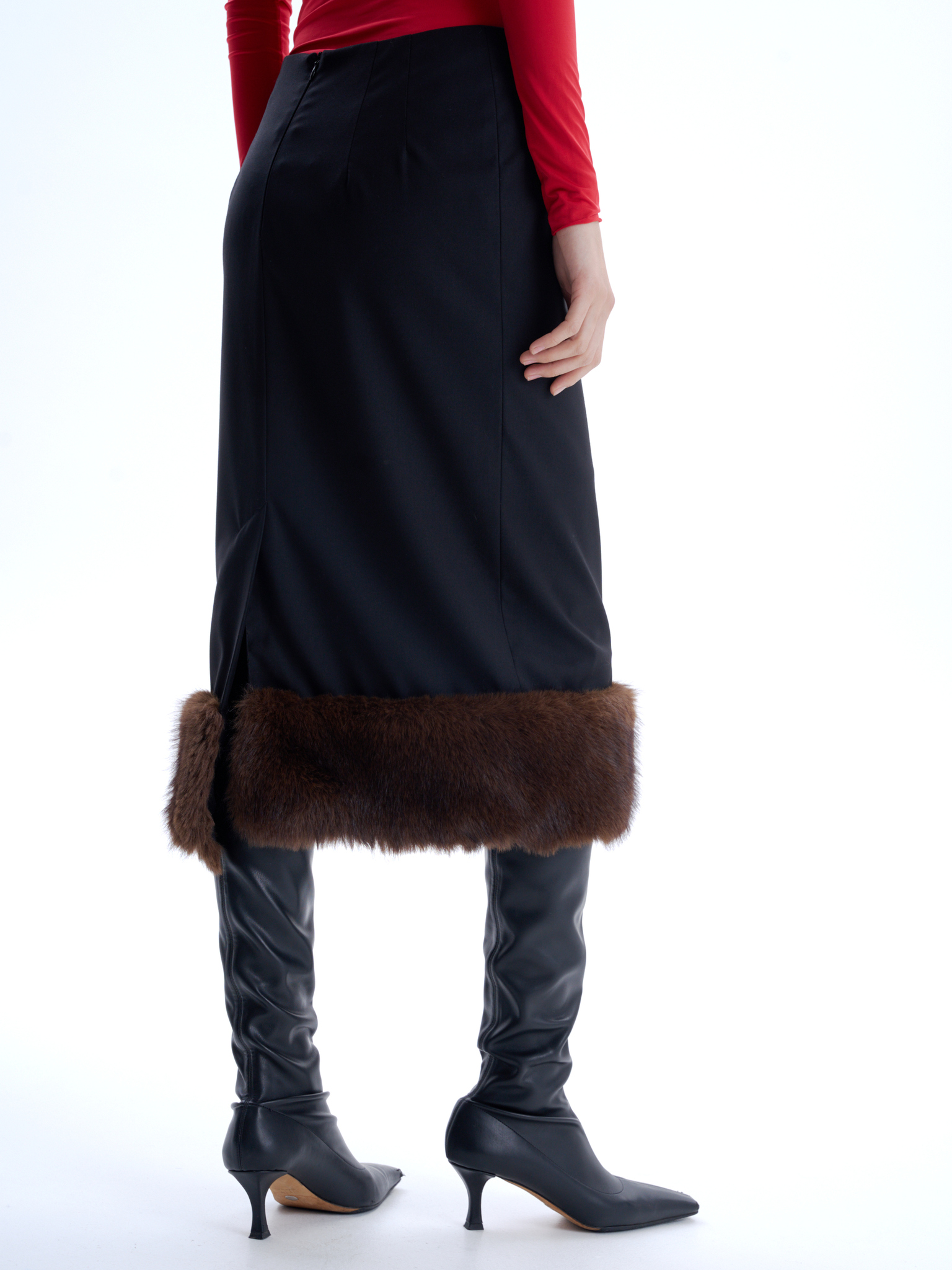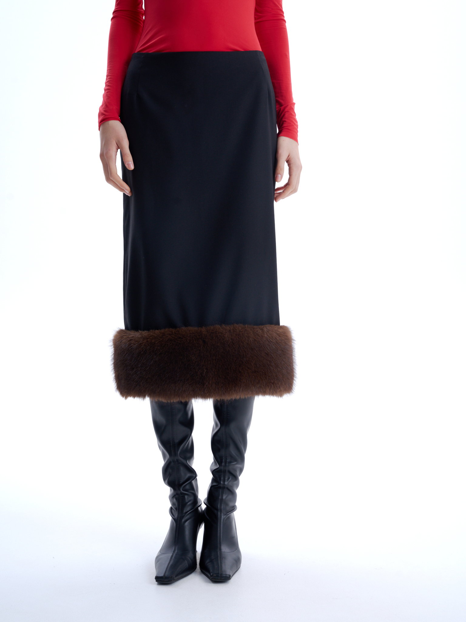 Юбка-карандаш из костюмной ткани средней посадки. Застежка на потайную молнию. Меховая деталь по низу изделия. Фигурные вытачки спереди и сзади для идеальной посадки. Шлица для свободного шага.