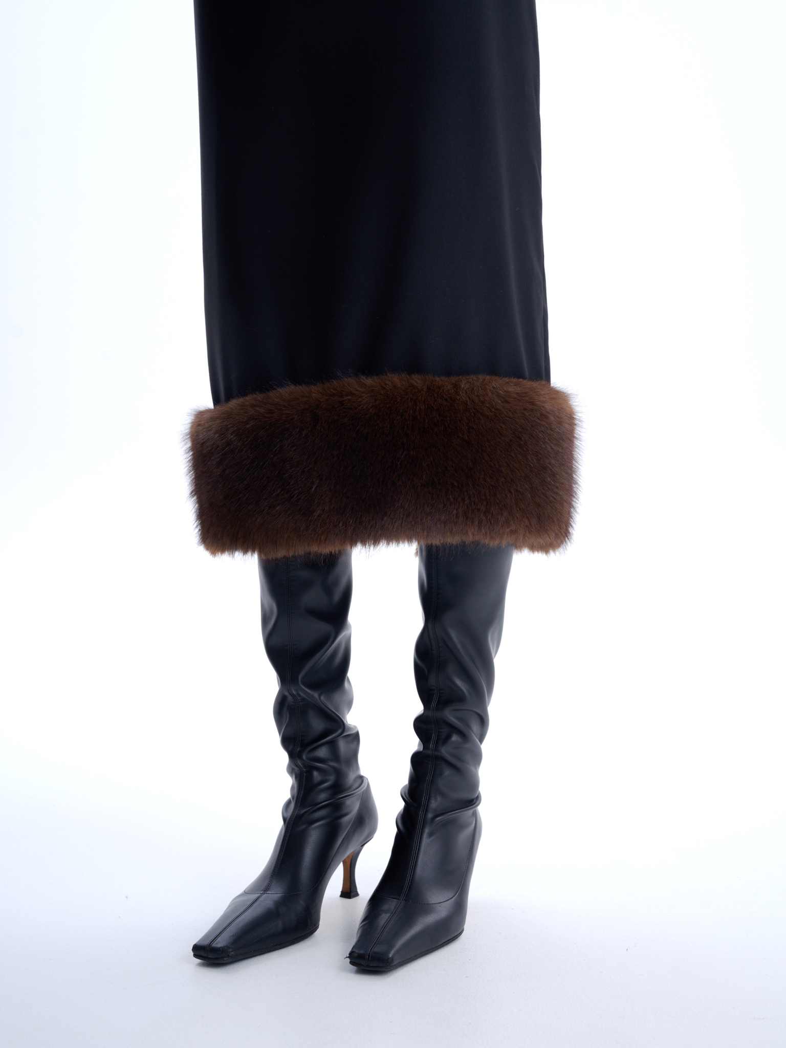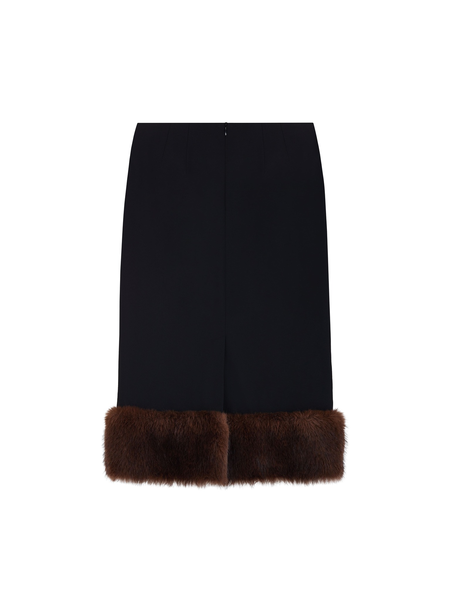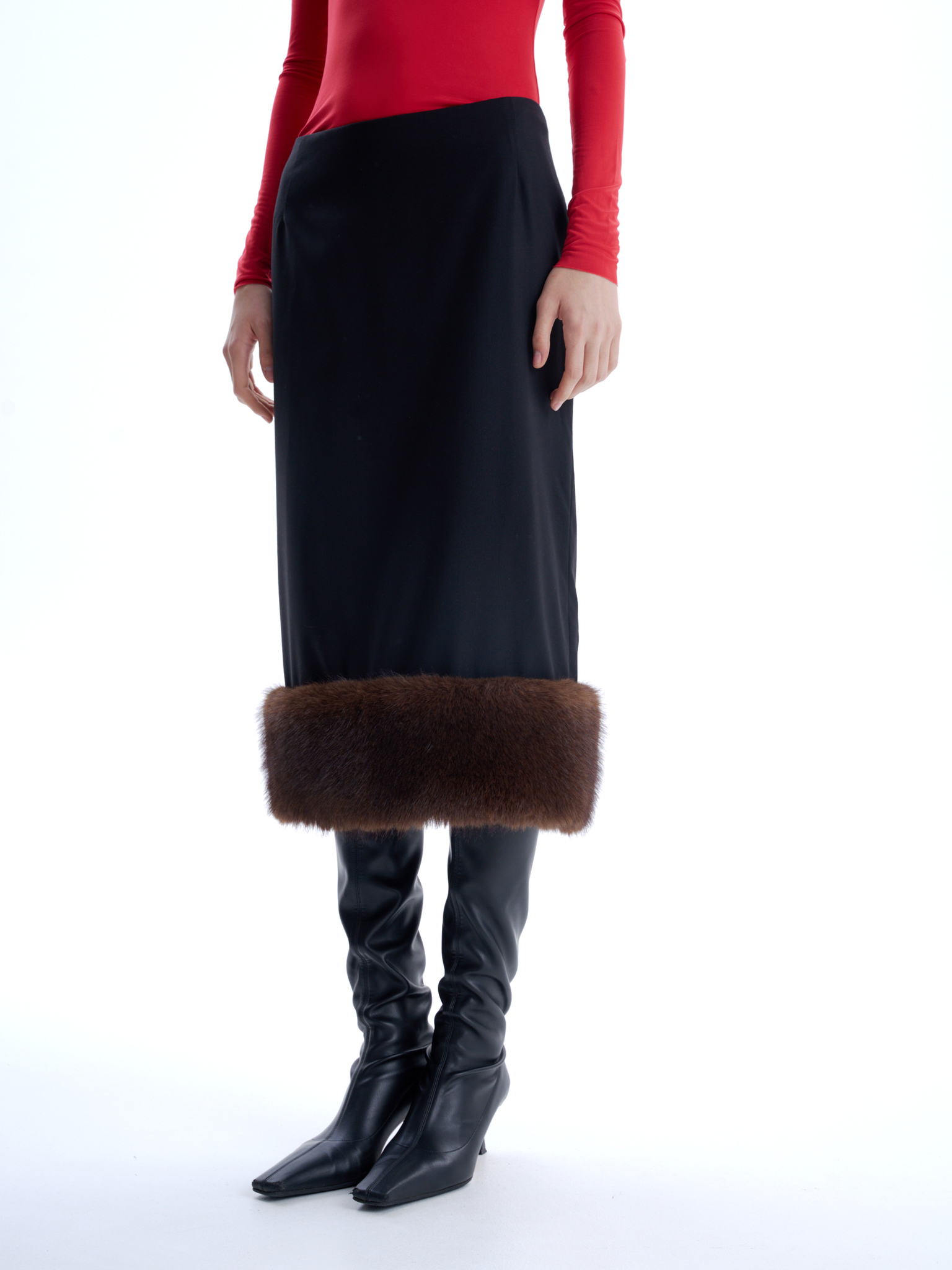 Юбка-карандаш из костюмной ткани средней посадки. Застежка на потайную молнию. Меховая деталь по низу изделия. Фигурные вытачки спереди и сзади для идеальной посадки. Шлица для свободного шага.