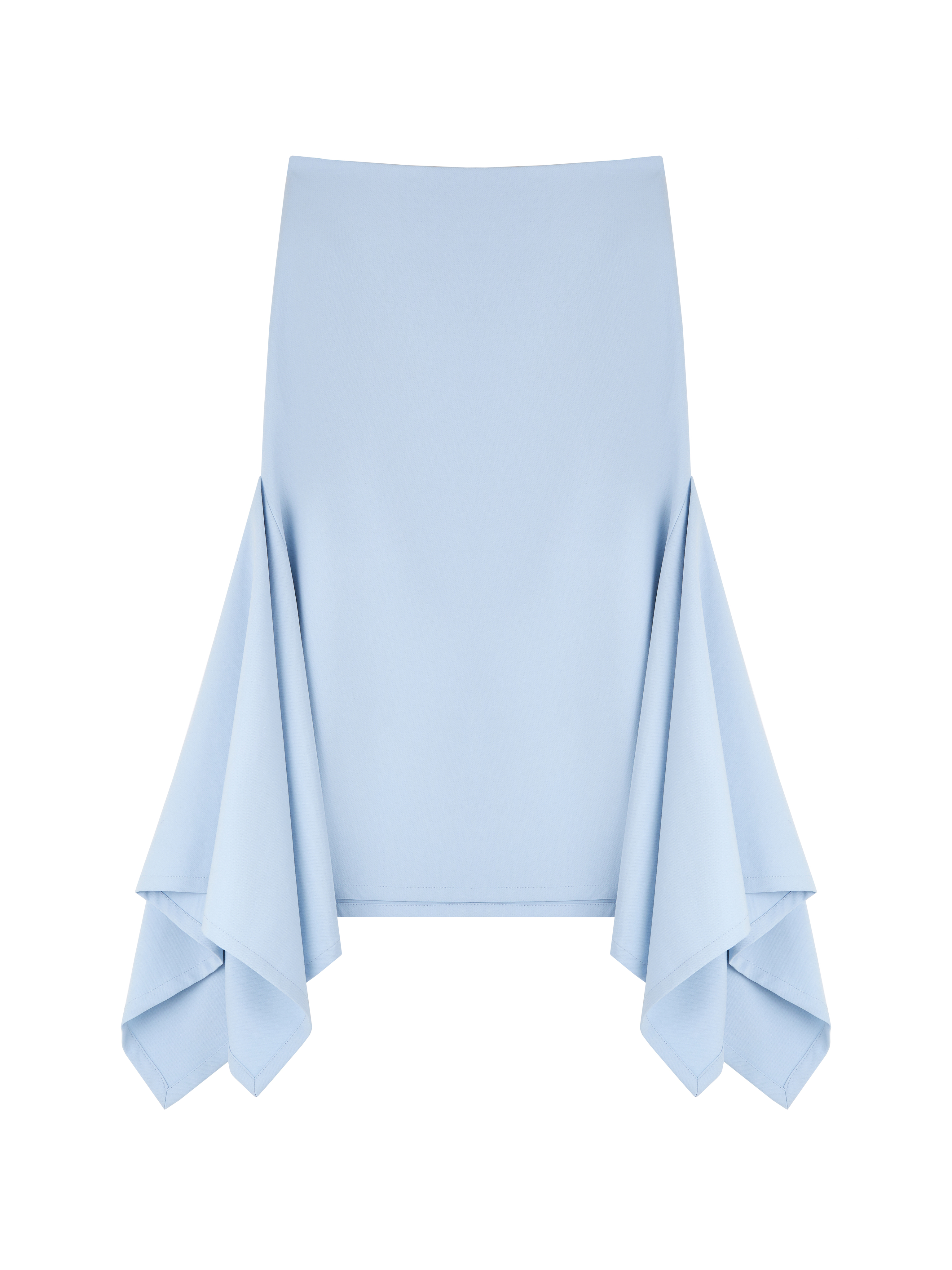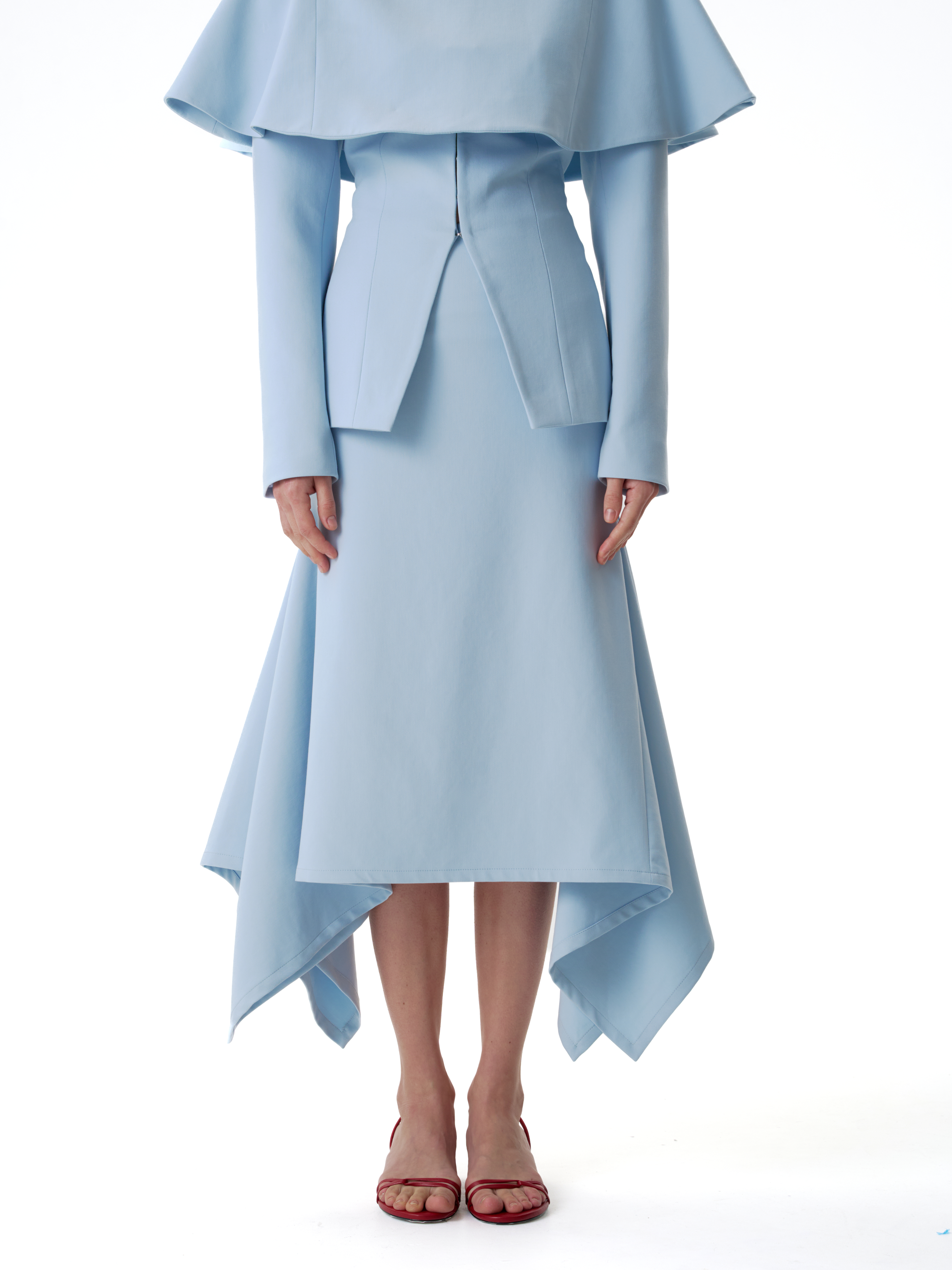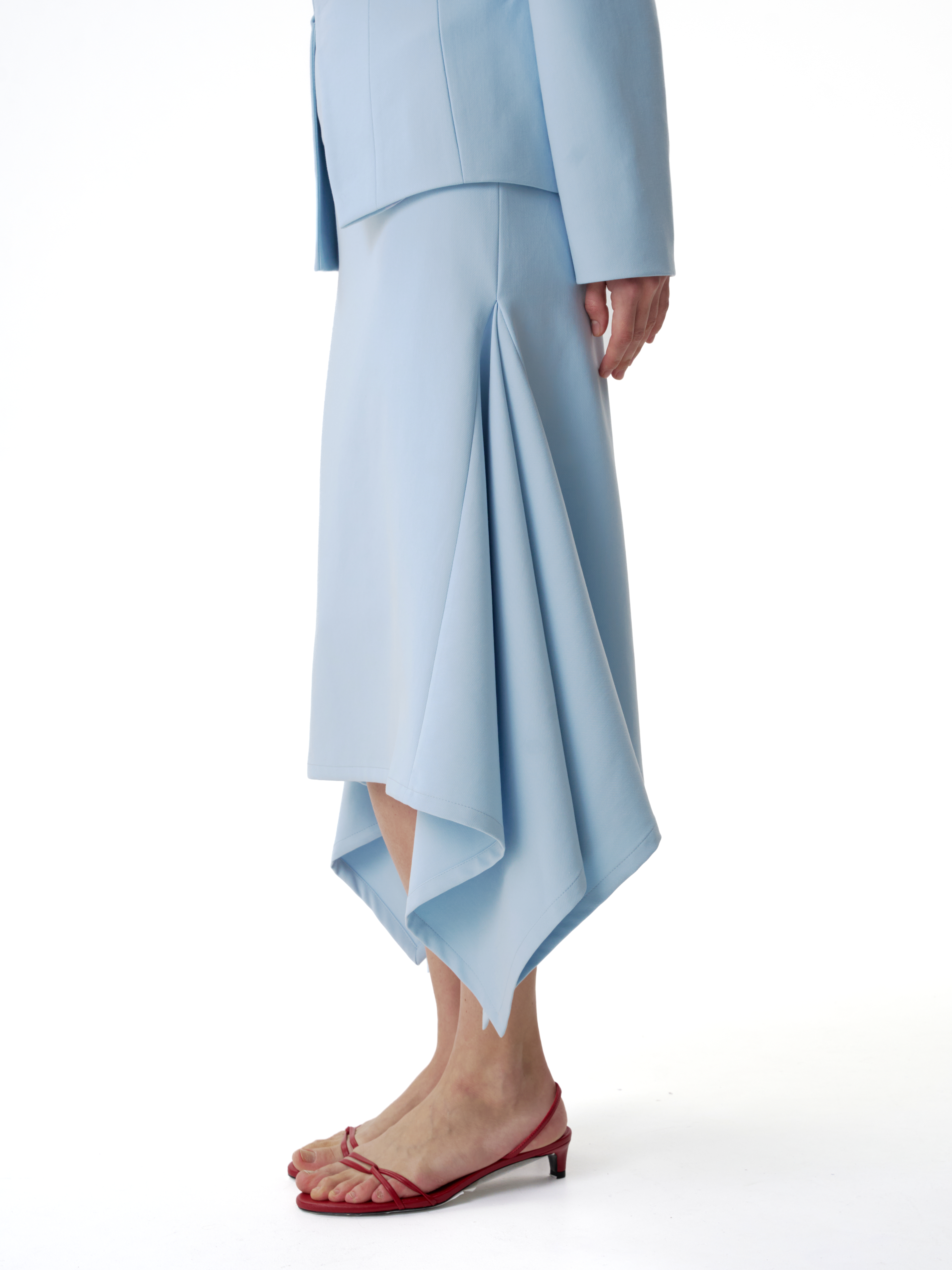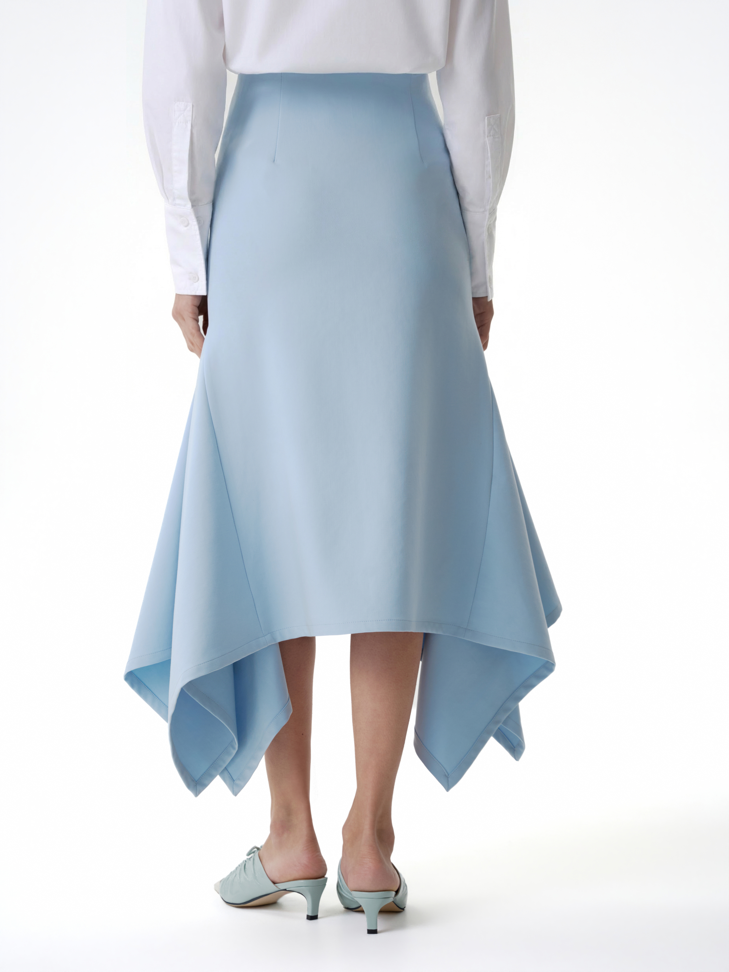 Юбка асимметричного кроя выполнена из костюмной ткани и дополнена подкладкой для комфортной посадки. В верхней части модель прилегает по фигуре и фиксируется по линии талии, создавая аккуратный, собранный силуэт.