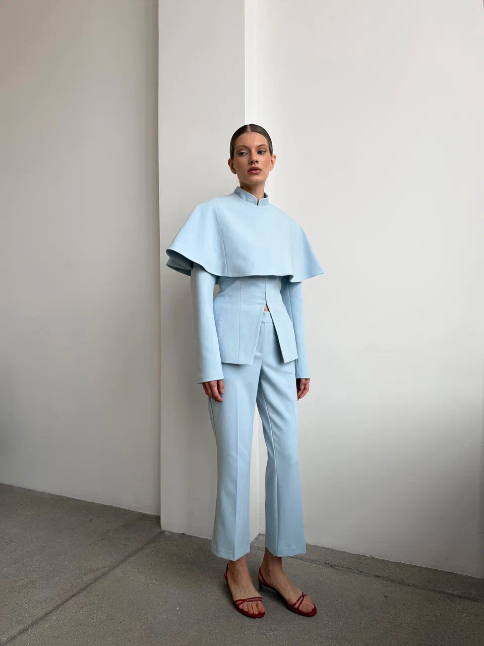 Приталенный жакет выполнен из смесовой ткани на основе вискозы. Модель подчеркивает линию талии и мягко расширяется в области бедер, за счет дополнительных вставок внутри изделия, создавая силуэт «песочные часы» Воротник-стойка добавляет образу графичности, а трендовый нежно-голубой цвет смягчает строгую архитектуру кроя.